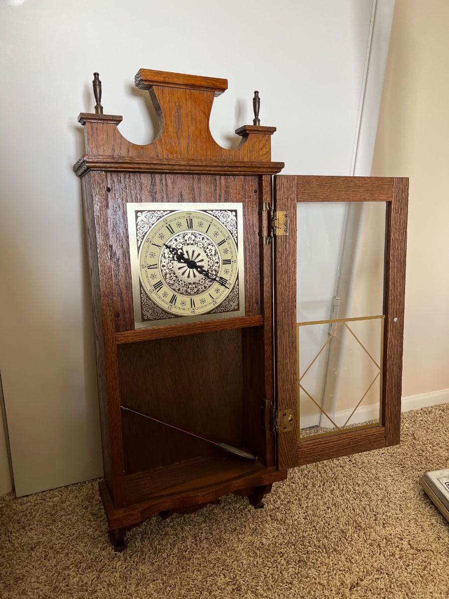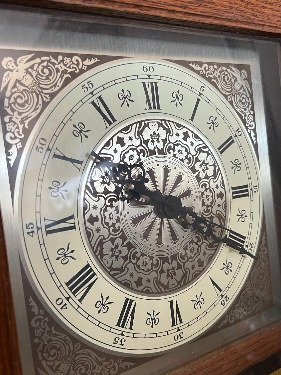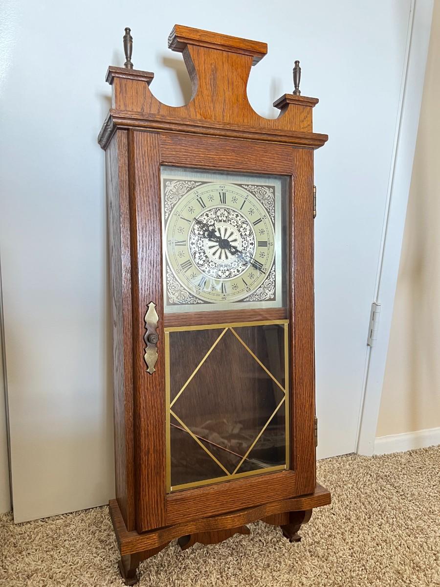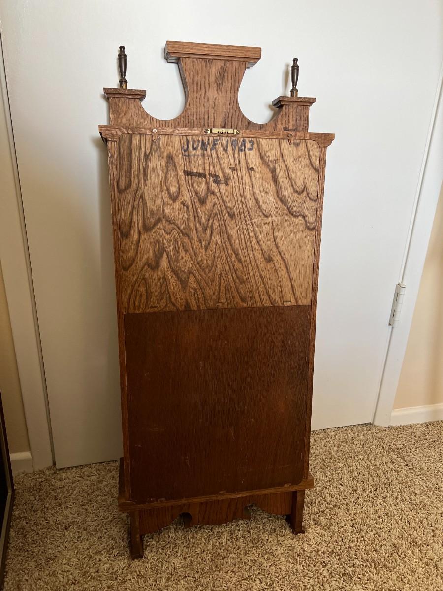 There is some light vintage wear to the wood, but there is no significant damage and is in overall good collectible or displayable condition. Check pictures for more details. Stands at about one and half feet tall. The clock has not been tested with the keys.