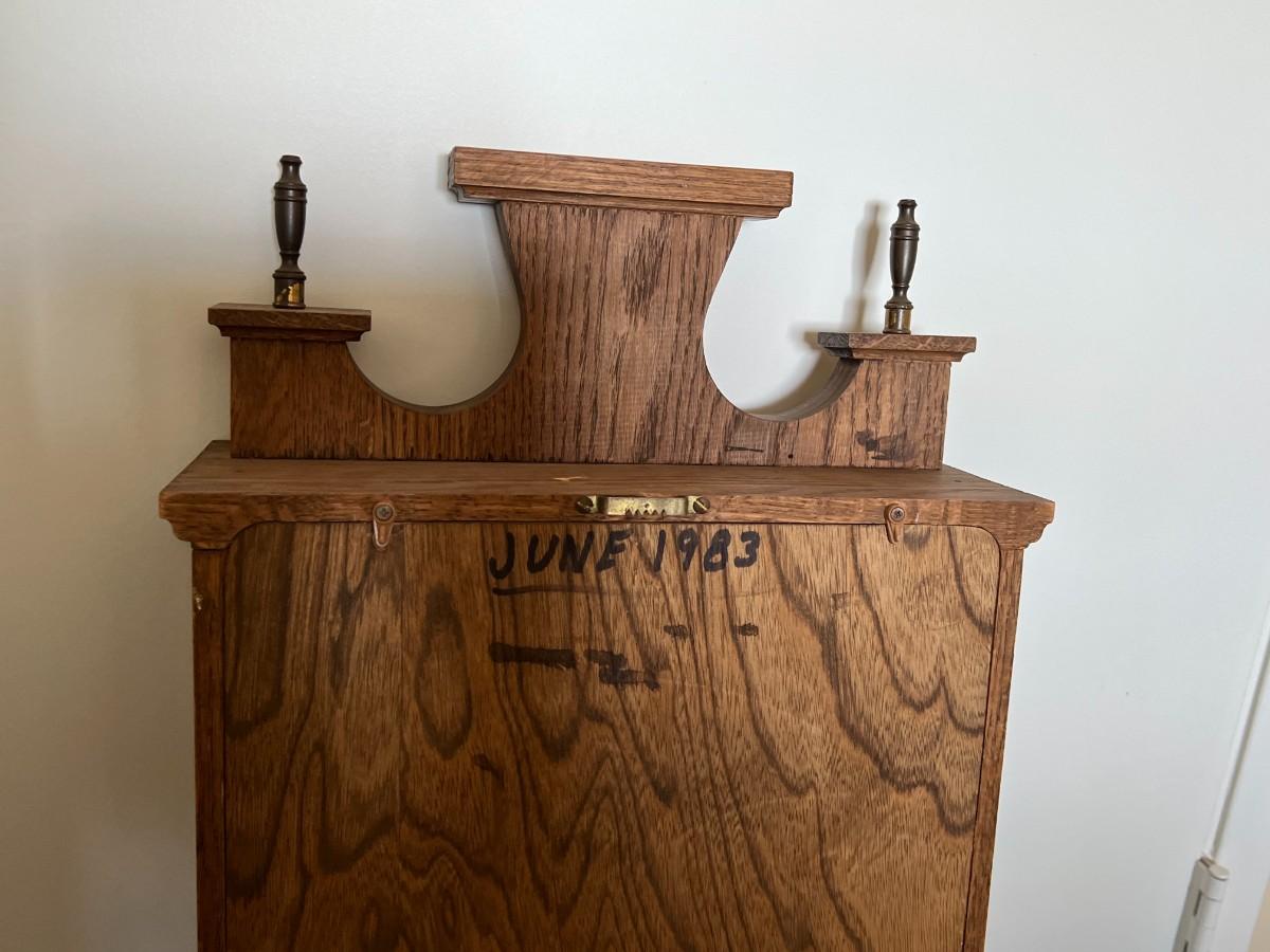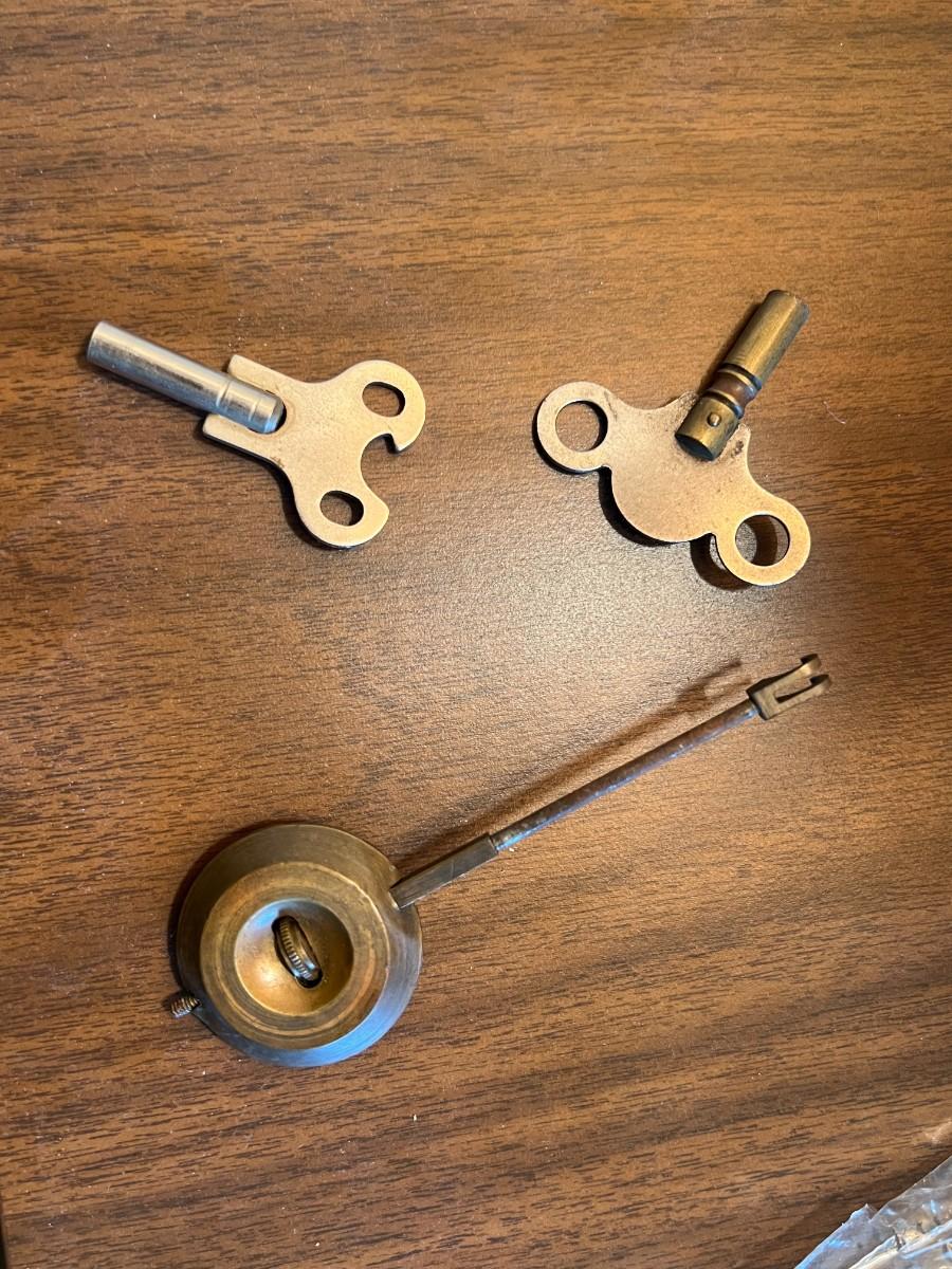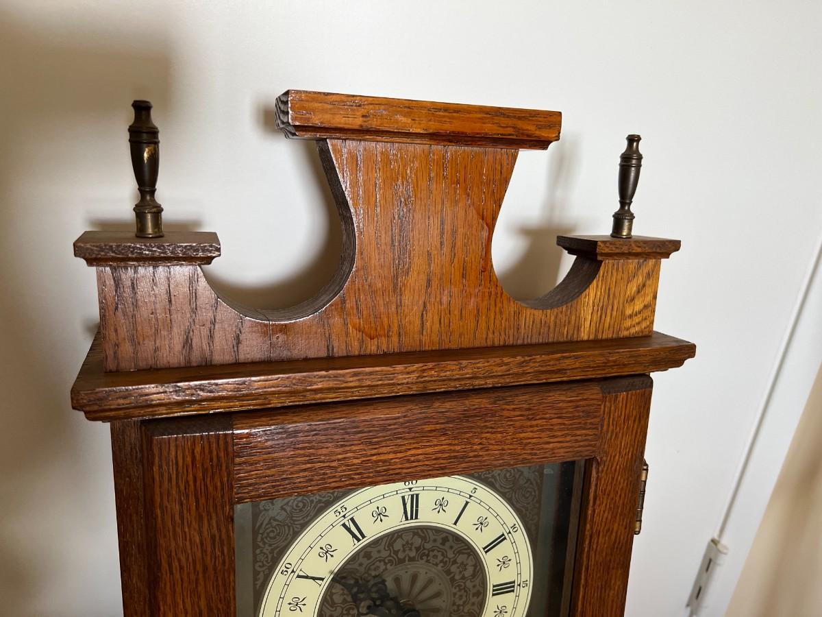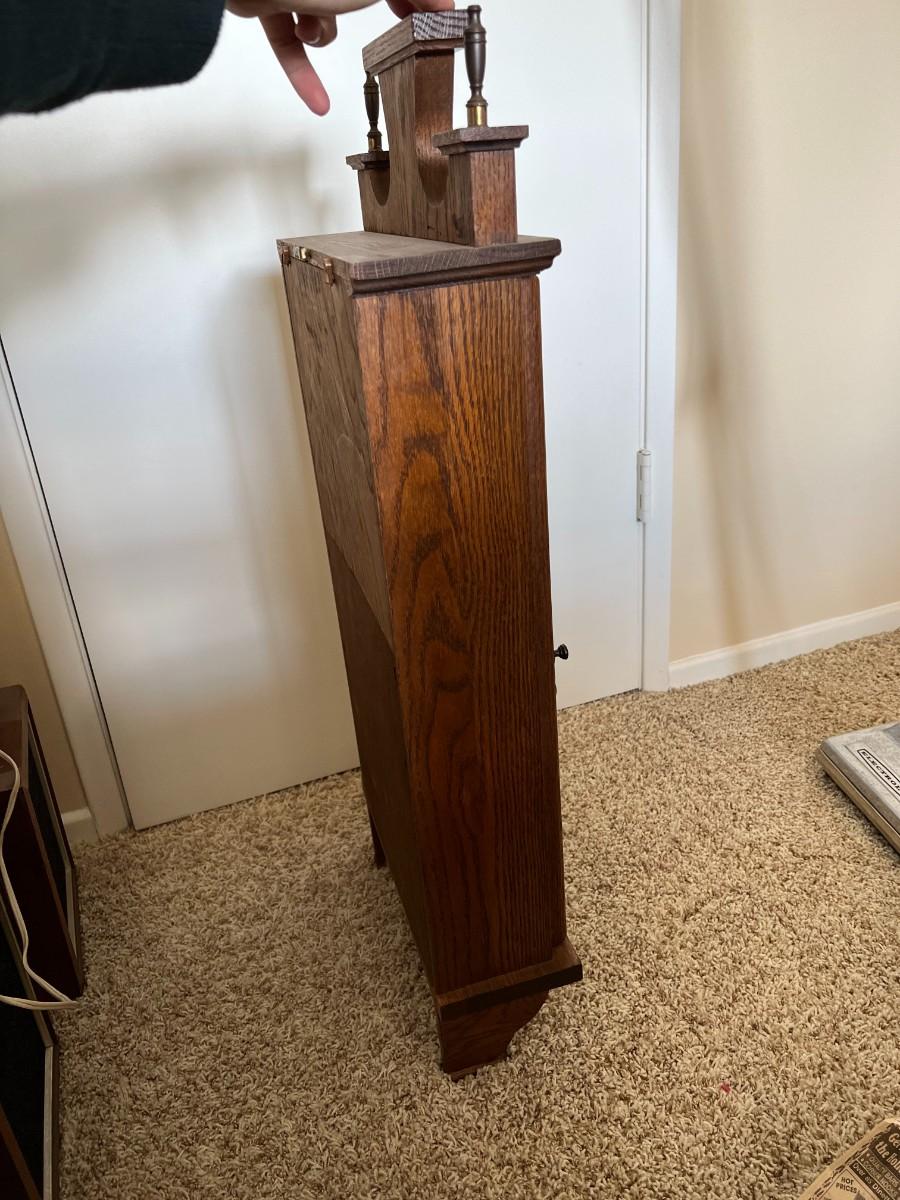 There is some light vintage wear to the wood, but there is no significant damage and is in overall good collectible or displayable condition. Check pictures for more details. Stands at about one and half feet tall. The clock has not been tested with the keys.
