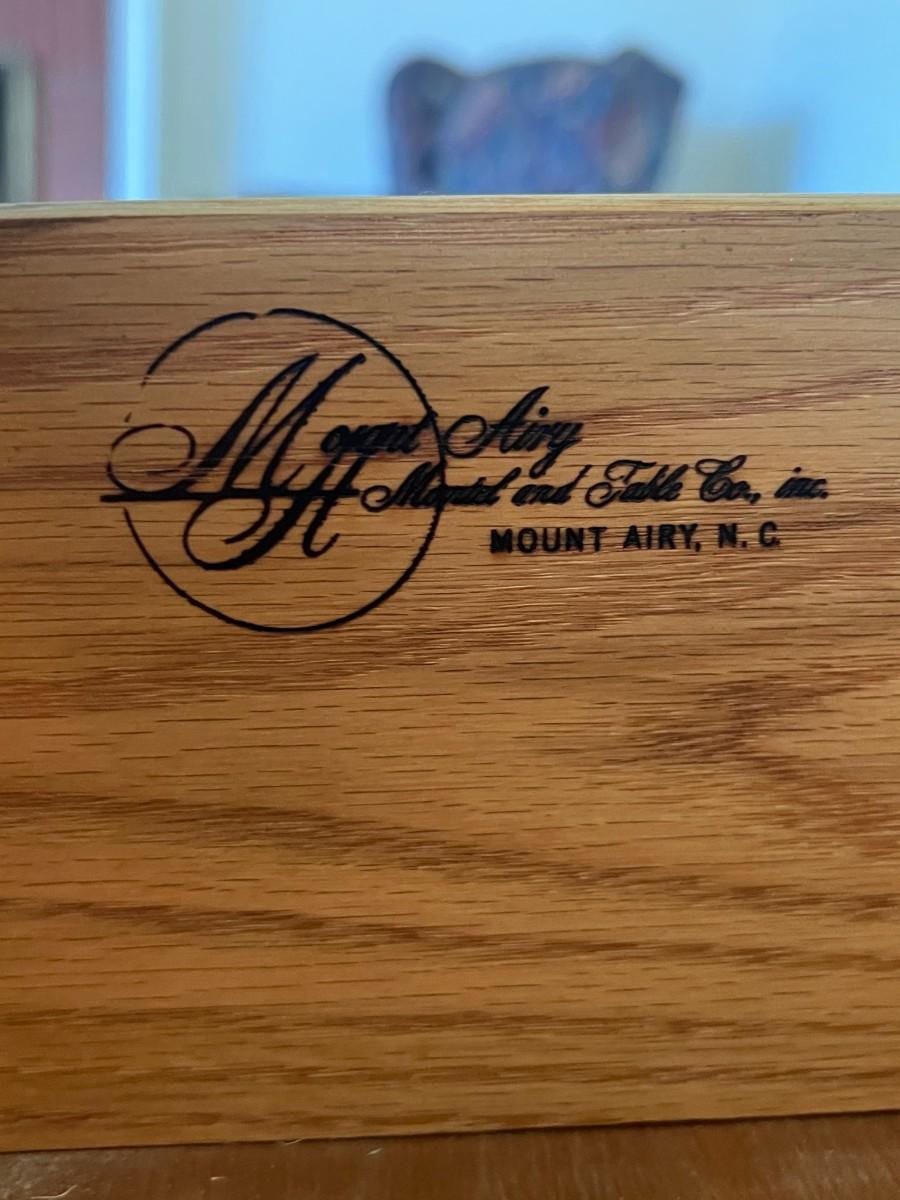 Vintage Mount Airy Mantle and Table Co. Oak Wood Two Drawer Small Dresser Buffet Sideboard Cabinet. In good vintage condition, light signs of use normal for age. Measures roughly 39"x17" and 24" high. *PICK UP IN ARCADIA SATURDAY MARCH 25TH BETWEEN 9am & 11am*