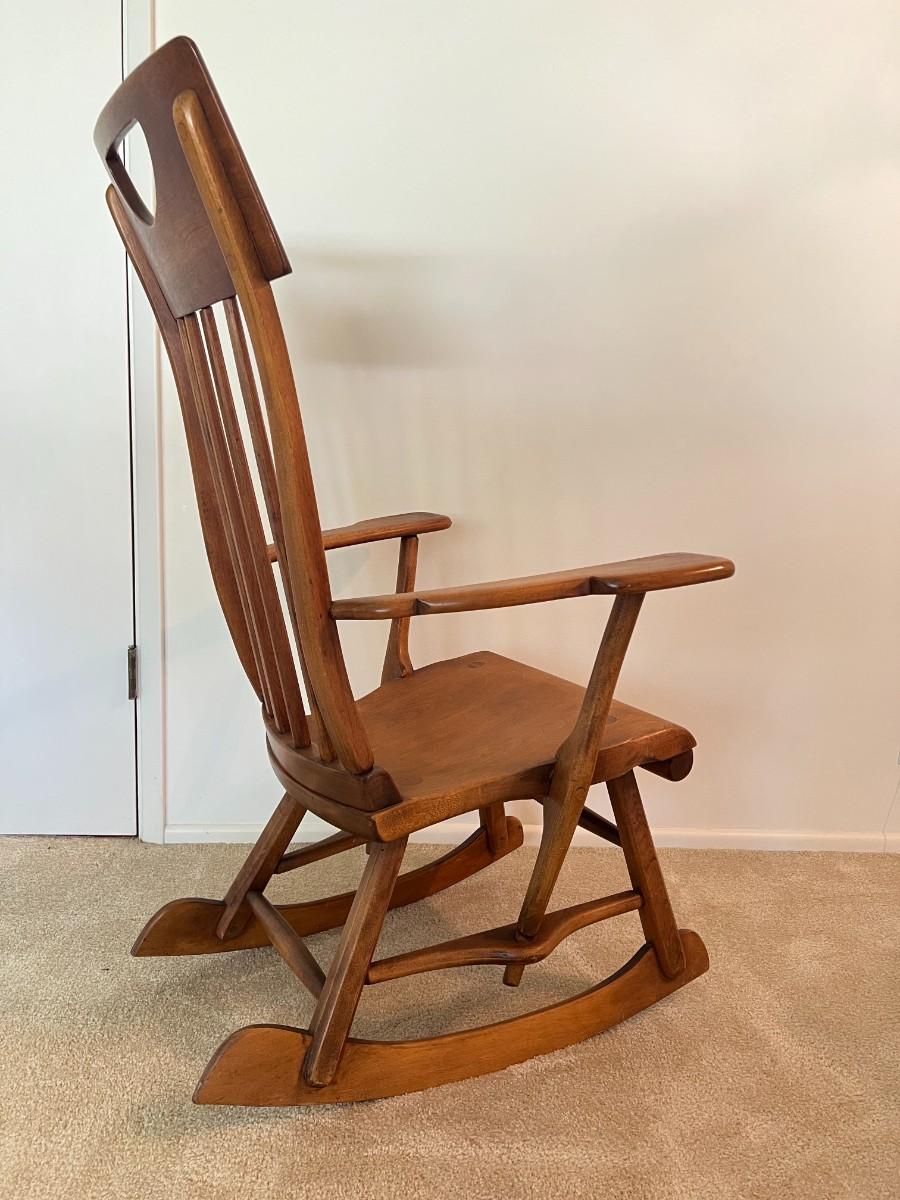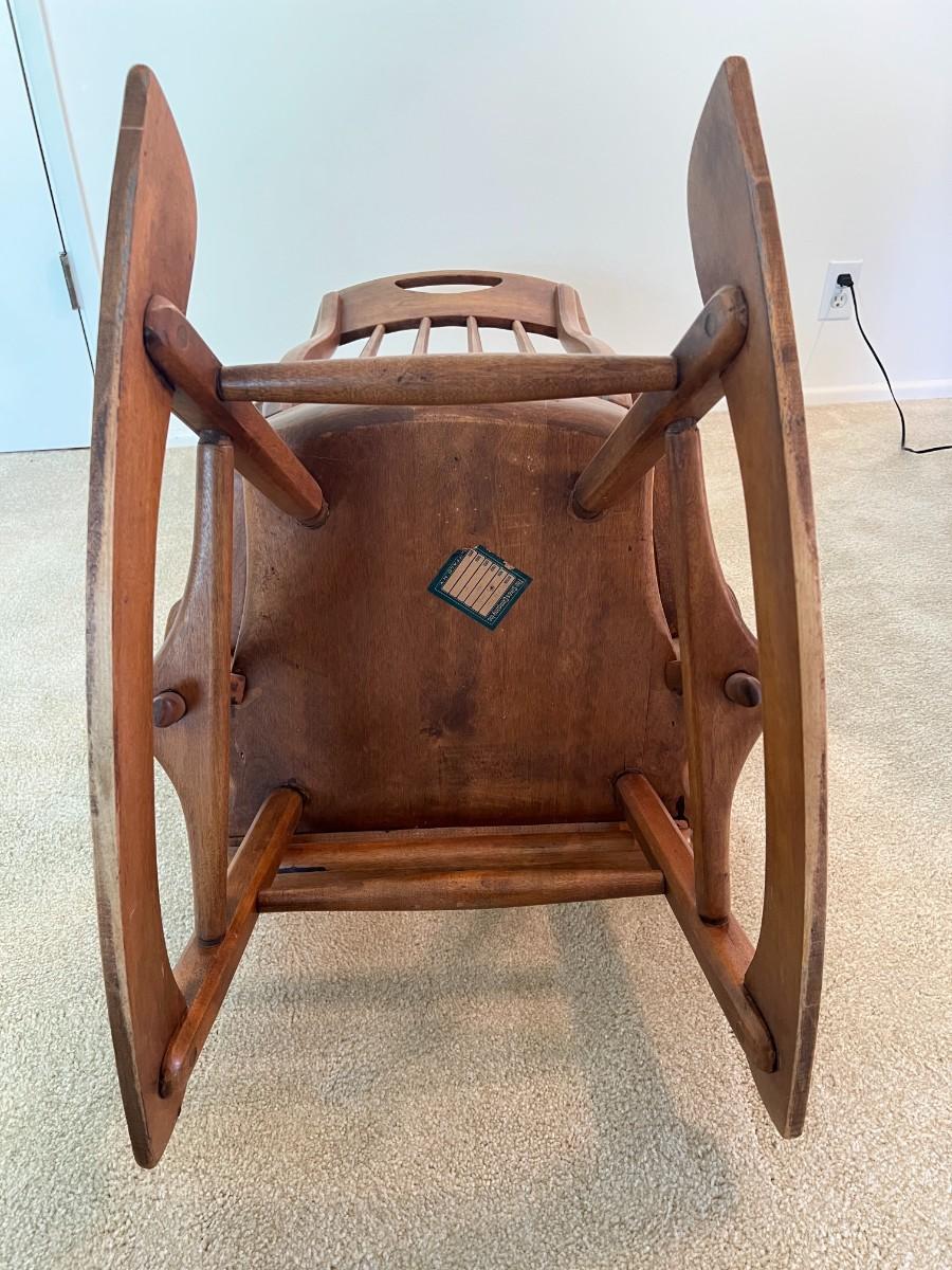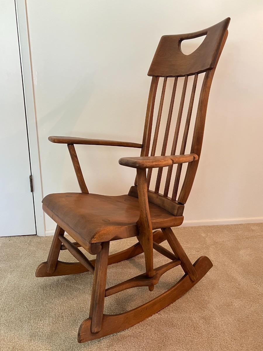 Vintage Tall Wood Rocking Chair. Label identifies the manufacturer as the Sikes Company of Buffalo NY. Overall height is 42", rockers measure 26" long. In very good, solid condition. *PICK UP IN ARCADIA SATURDAY MARCH 25TH BETWEEN 9am & 11am*