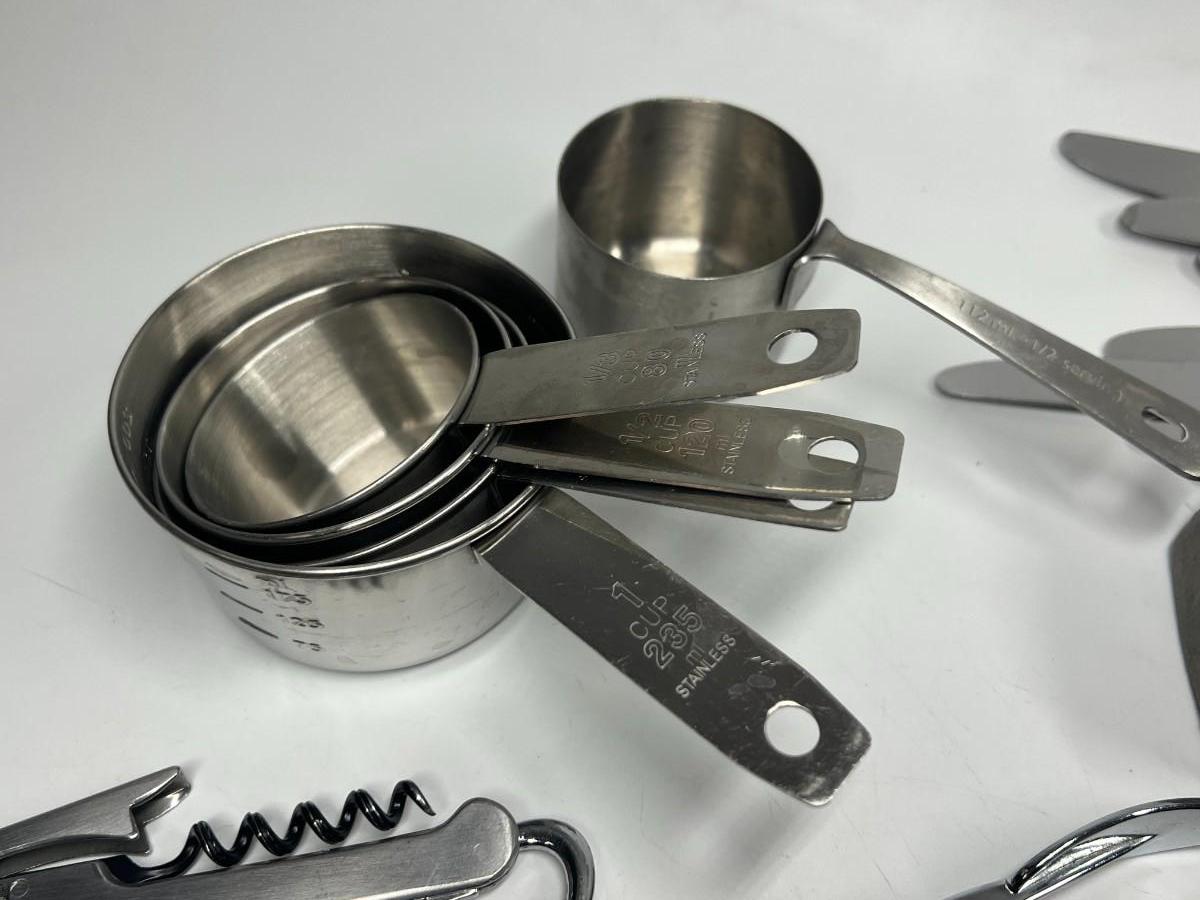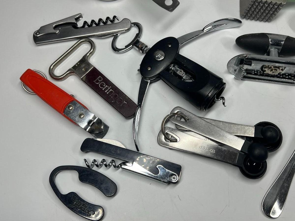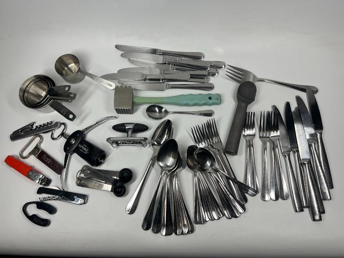 Lot of Miscellaneous Wine Openers, Measuring Cups, Knives, Forks, Spoons, & More