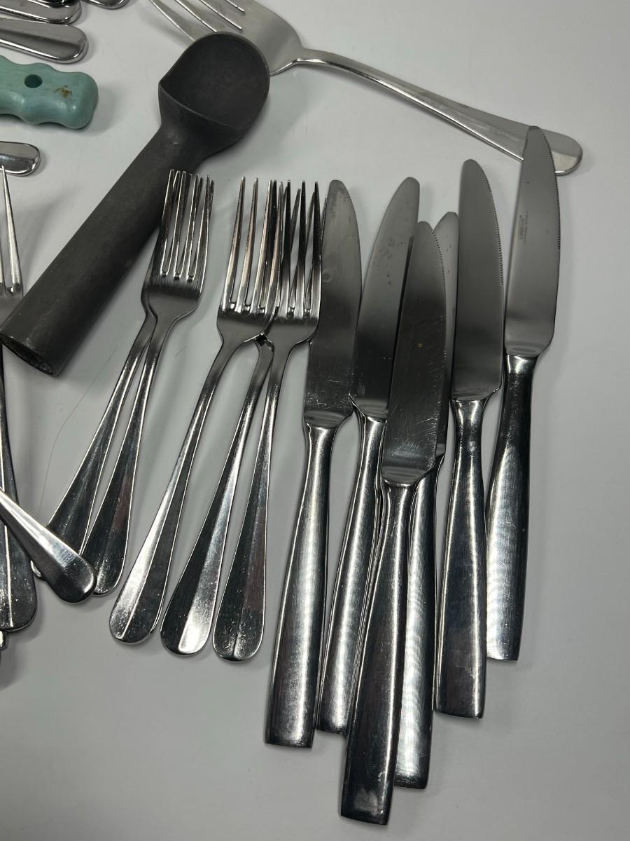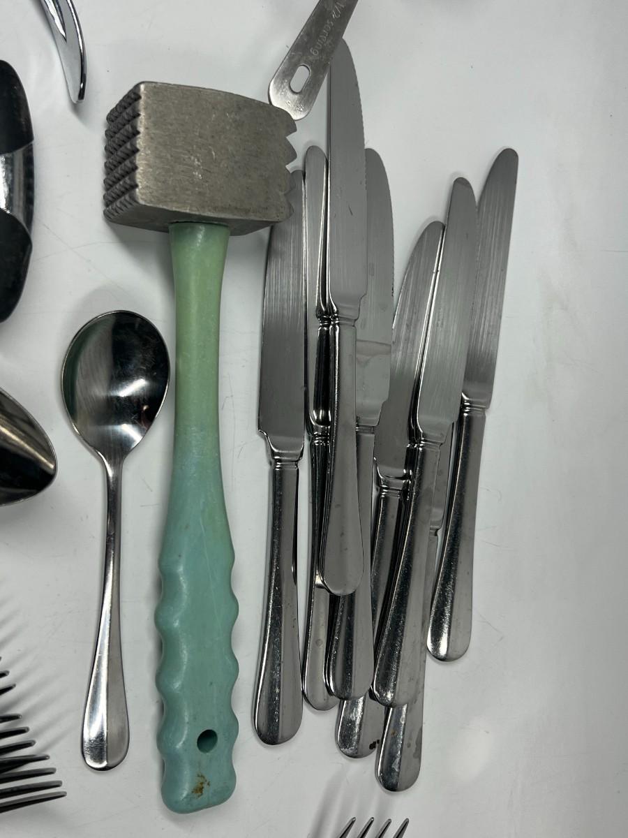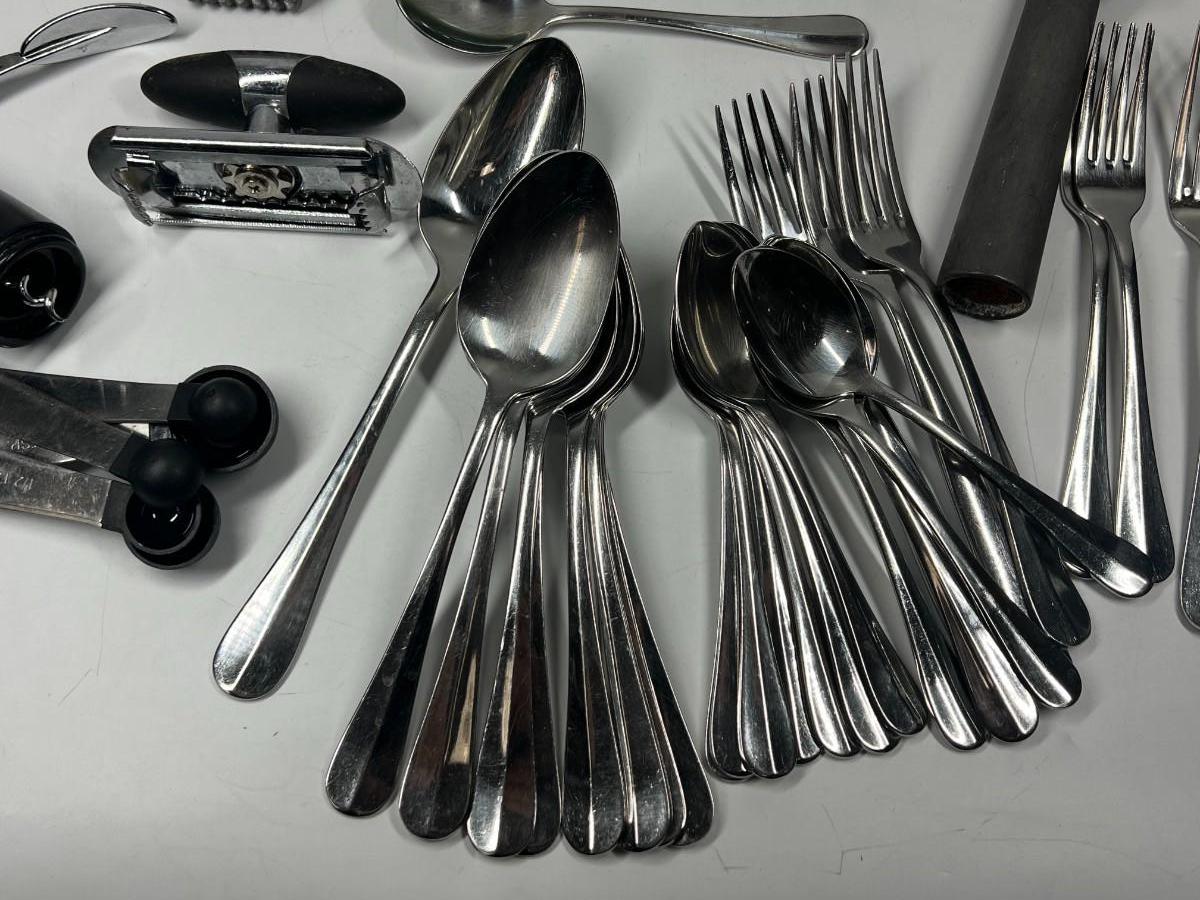 Lot of Miscellaneous Wine Openers, Measuring Cups, Knives, Forks, Spoons, & More