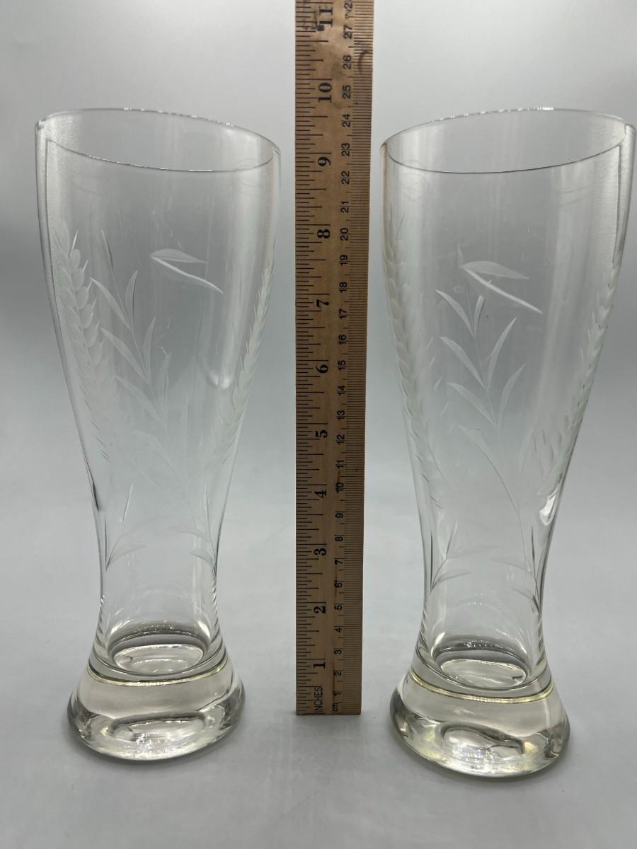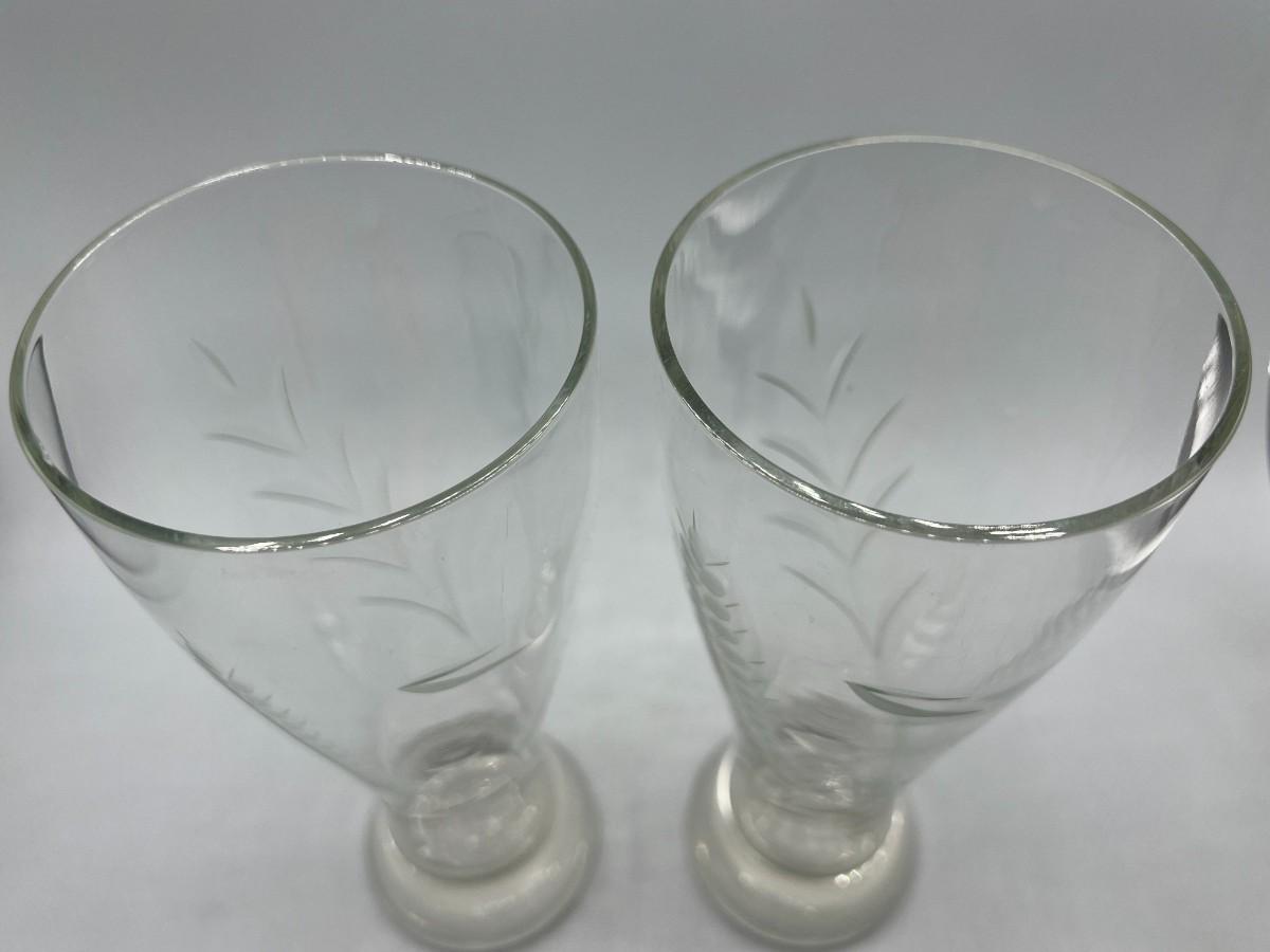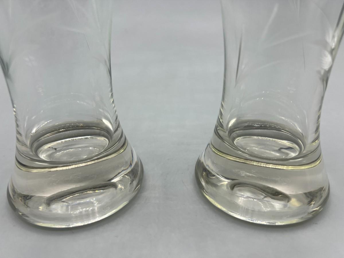 Pair of Retro Tall Glass Thin Leaf Foliage Motif Drinking Glasses