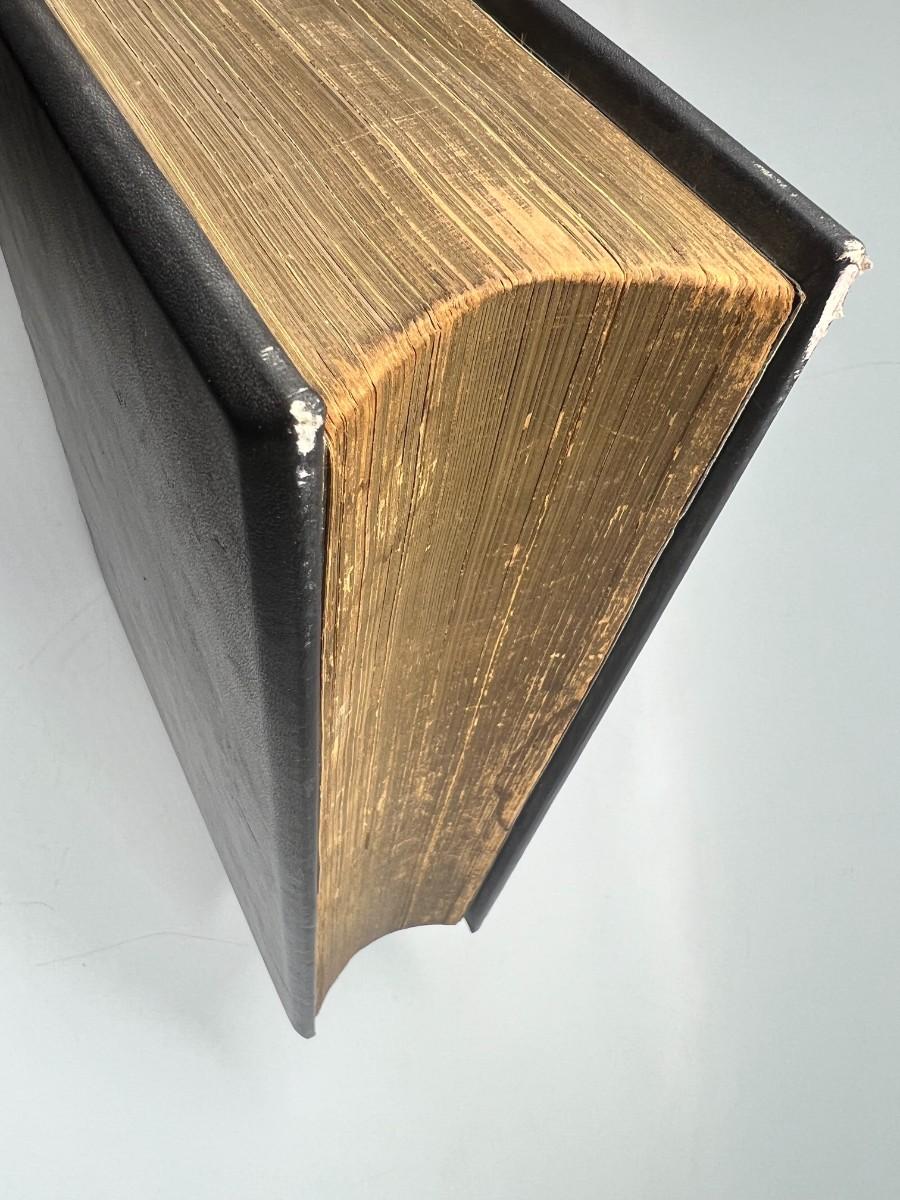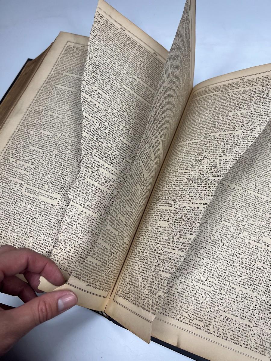 There is antique wear to the book, and there are some ripped pages. There is no significant damage, check pictures for more details and for sizing.