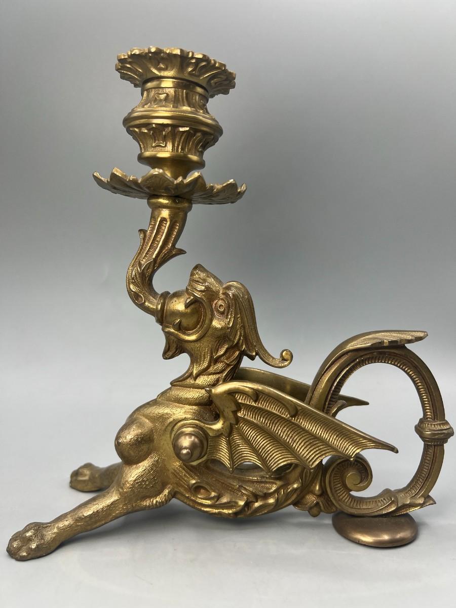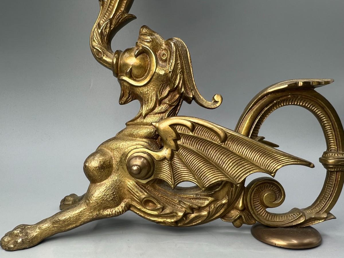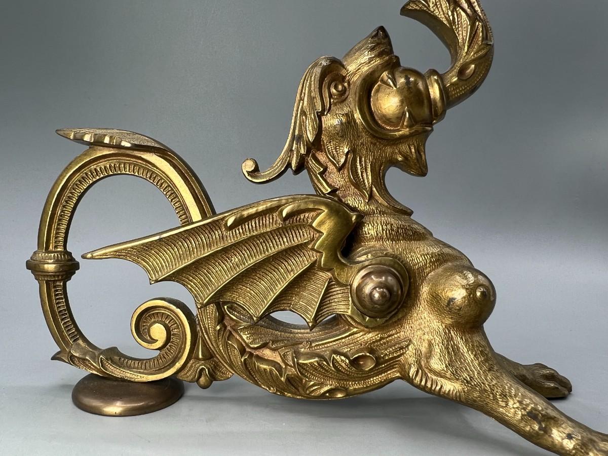 Antique Victorian Gothic Brass Metal Griffin Dragon Winged Lion Holding Candle Sconce in Mouth
