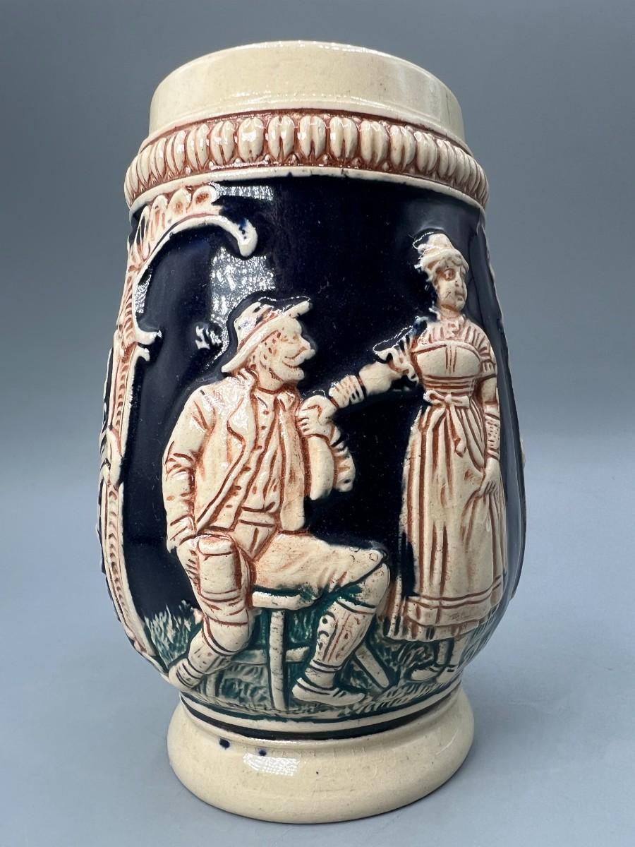Vintage German Cobalt Beer Stein Pair of Lovers Das Lobich Mir Ein Gutes Bier. In good displayable condition, no chips but there is crazing. About 5" size.