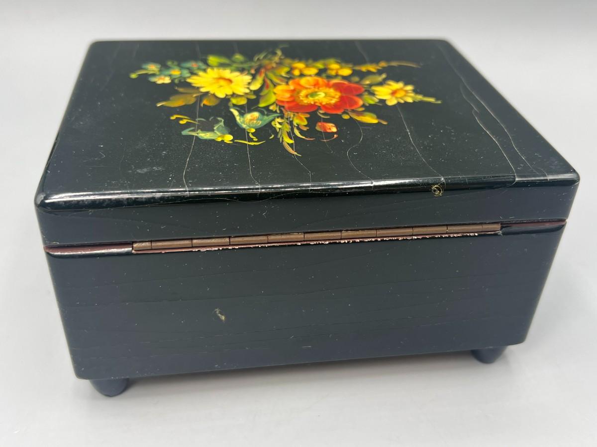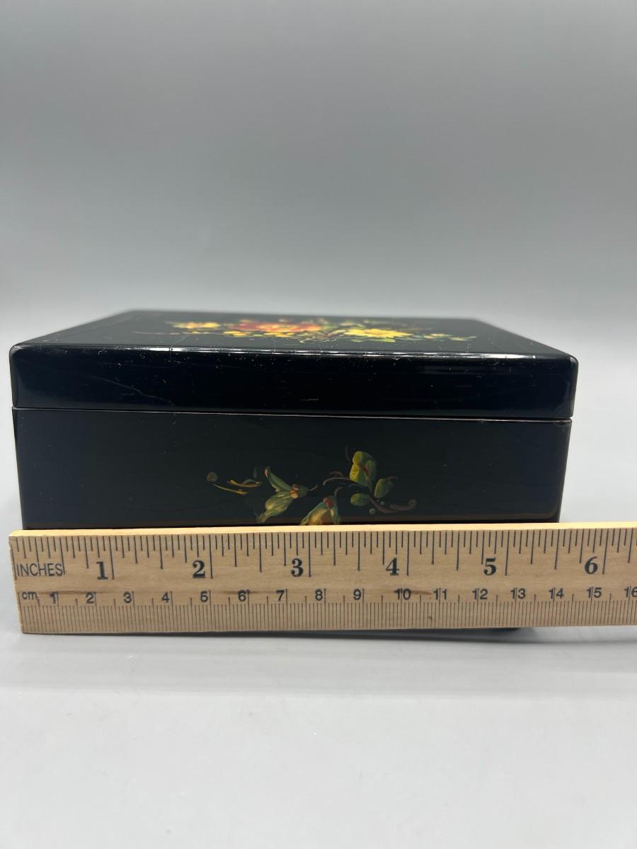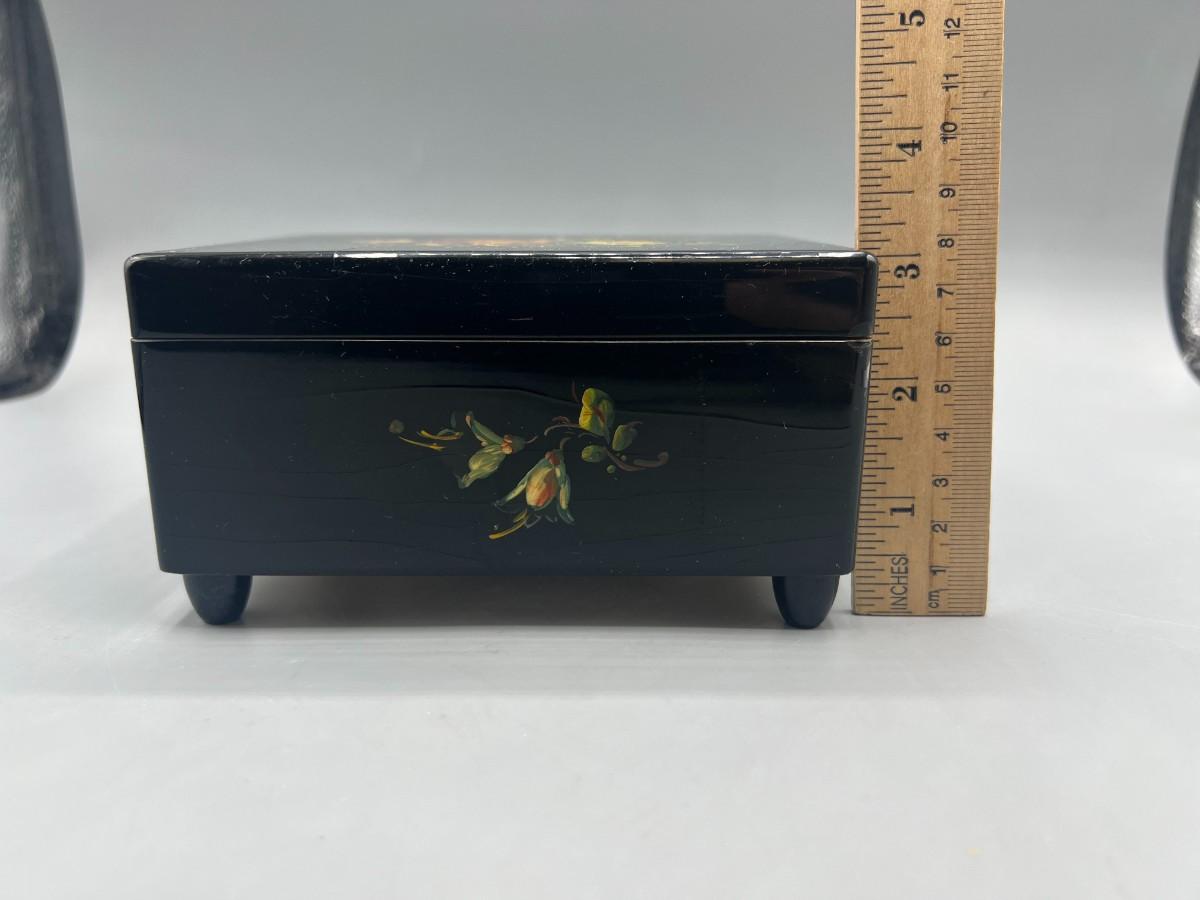 Vintage Black Lacquer with Colorful Floral Top Musical Jewelry Box Domani Que Sera Sera. Some light signs of age. Hinged lid with mirror inside. About 6" size.