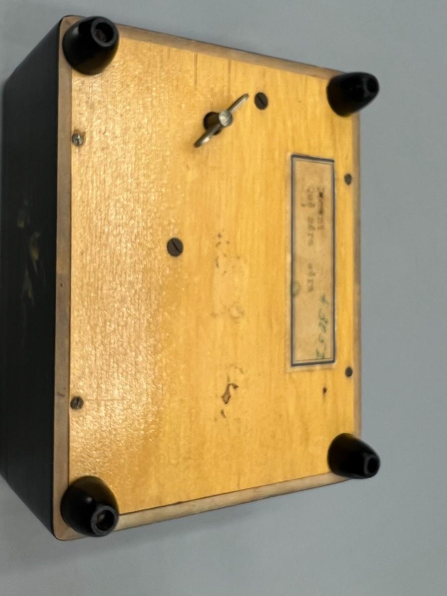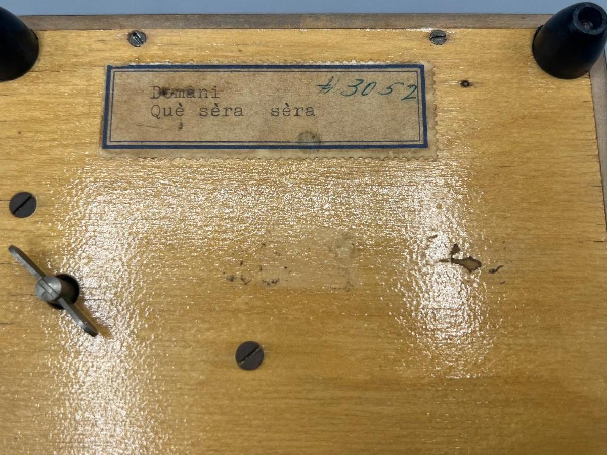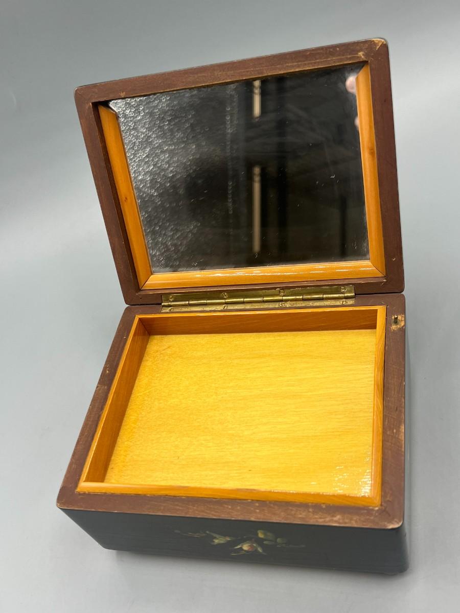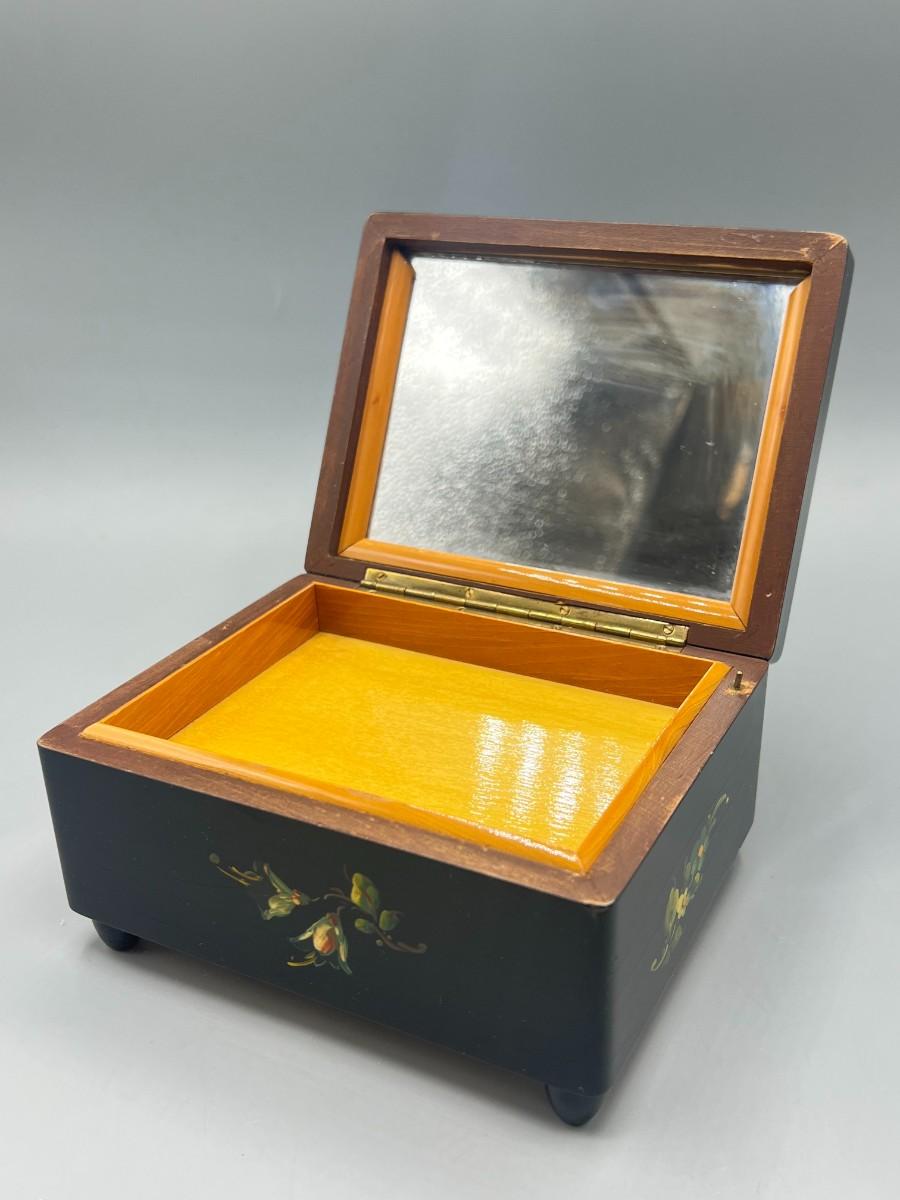 Vintage Black Lacquer with Colorful Floral Top Musical Jewelry Box Domani Que Sera Sera. Some light signs of age. Hinged lid with mirror inside. About 6" size.