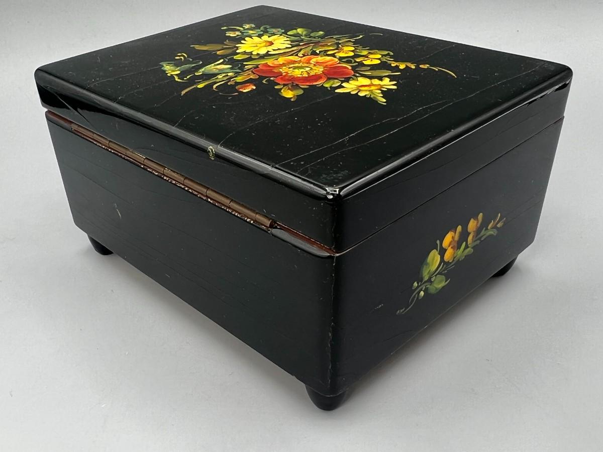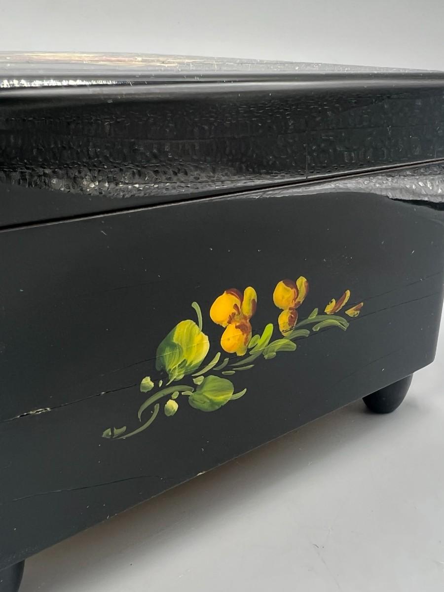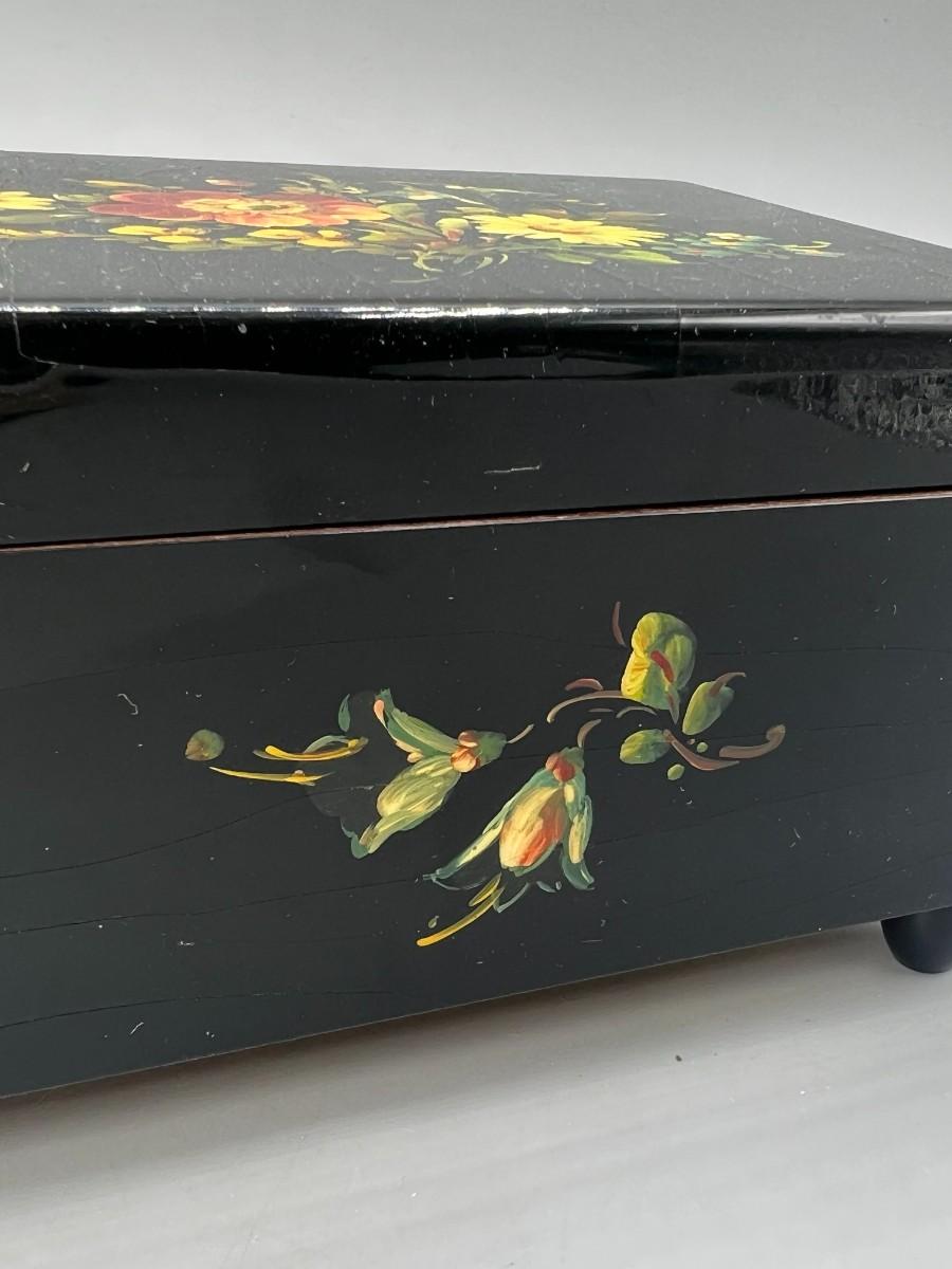 Vintage Black Lacquer with Colorful Floral Top Musical Jewelry Box Domani Que Sera Sera