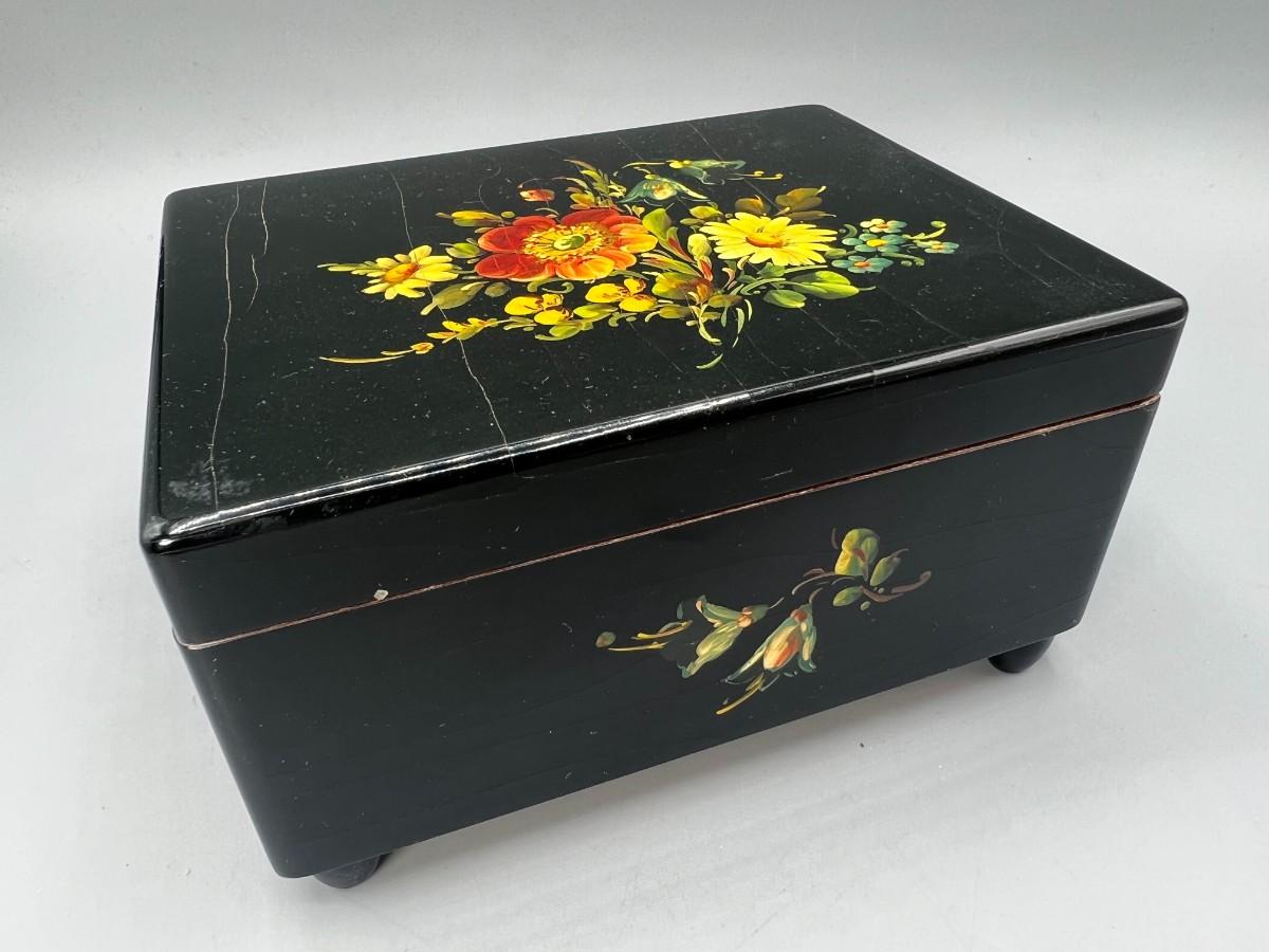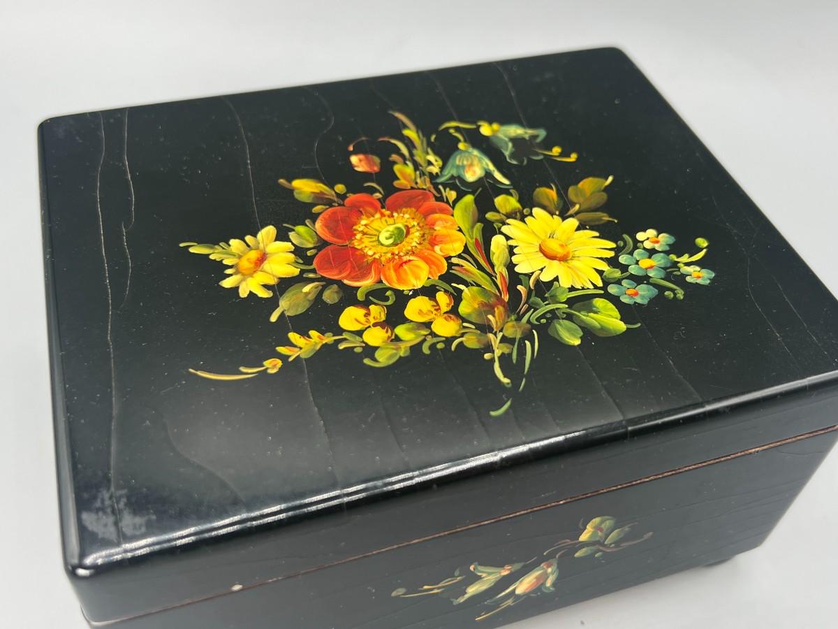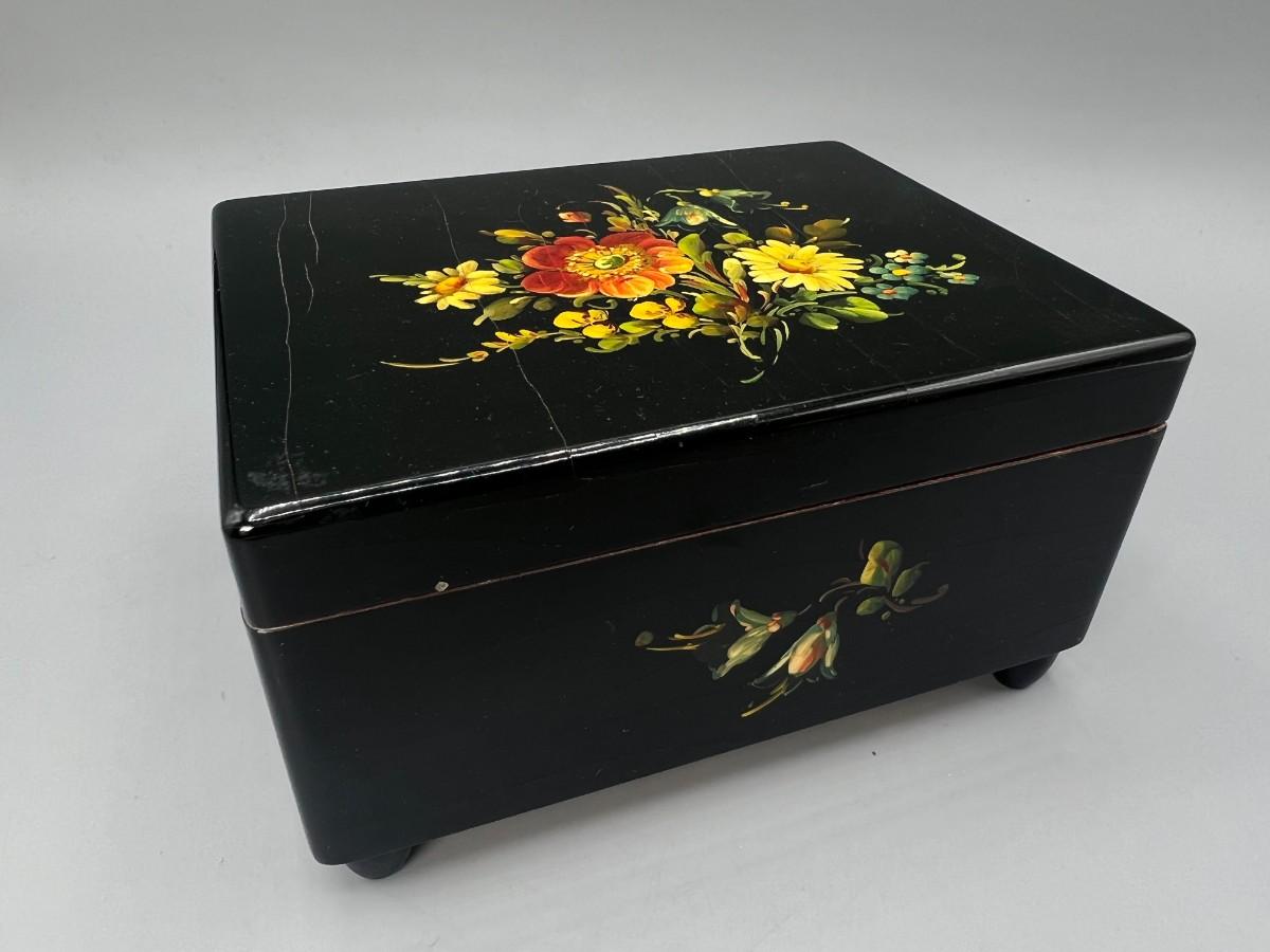 Vintage Black Lacquer with Colorful Floral Top Musical Jewelry Box Domani Que Sera Sera