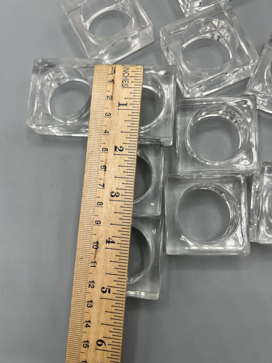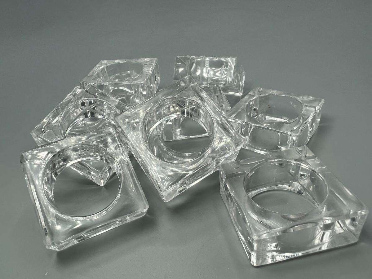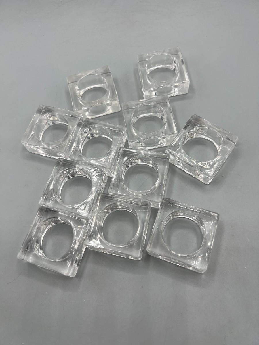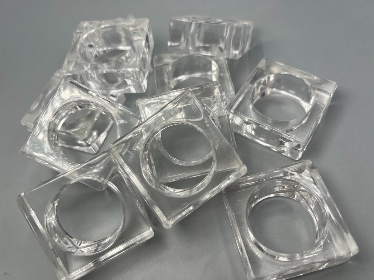 Square Shaped Lucite Clear Plastic Napkin Rings Holders. Set of 11. In good condition. About 1.75" size.