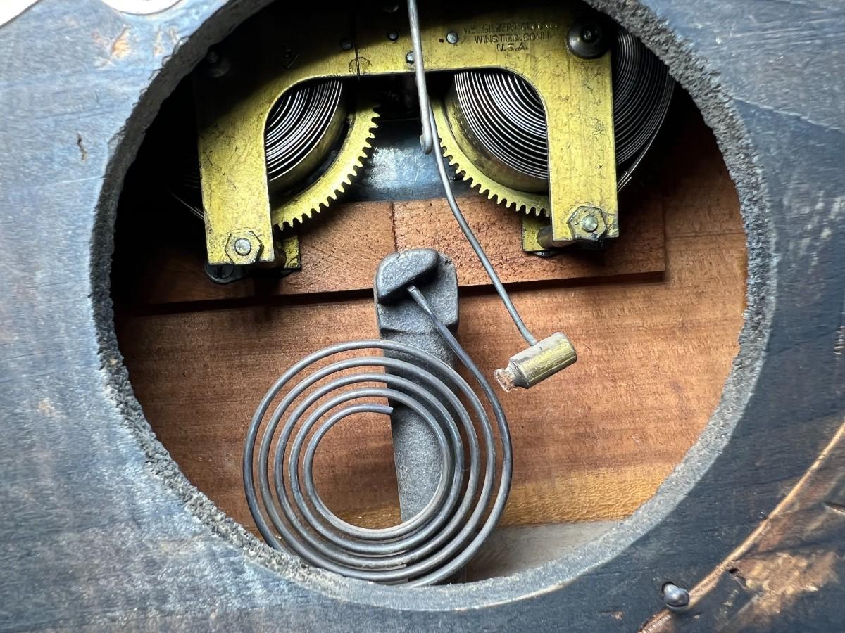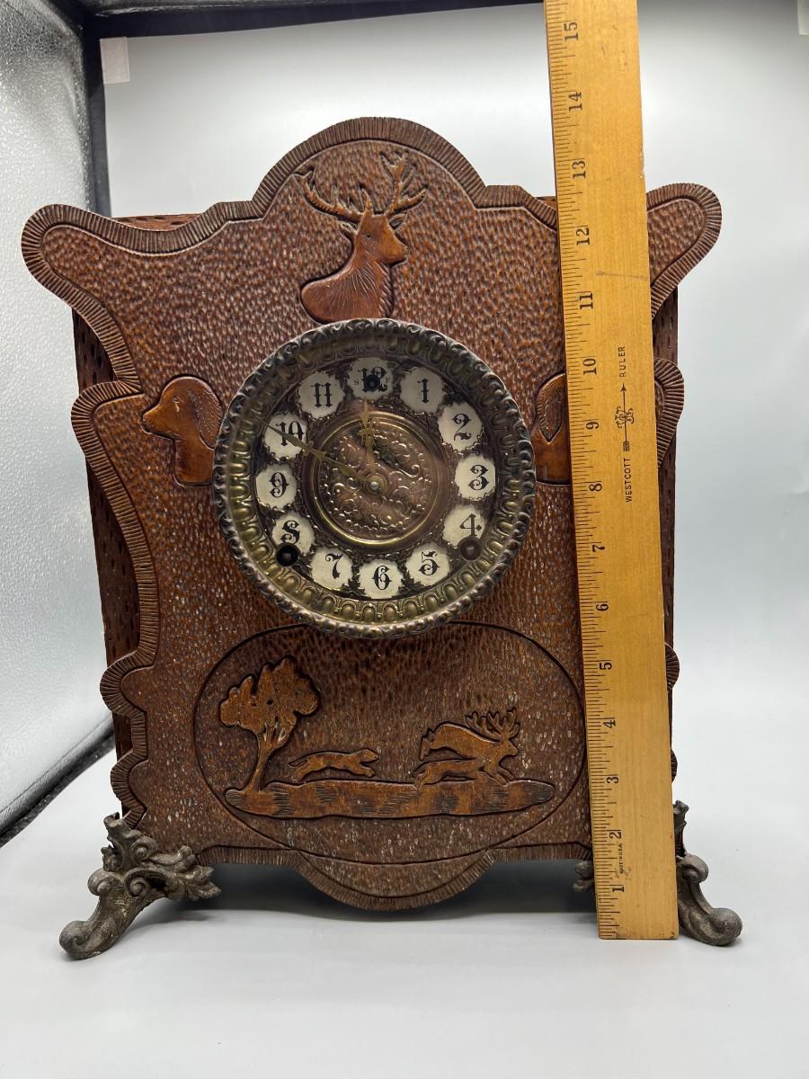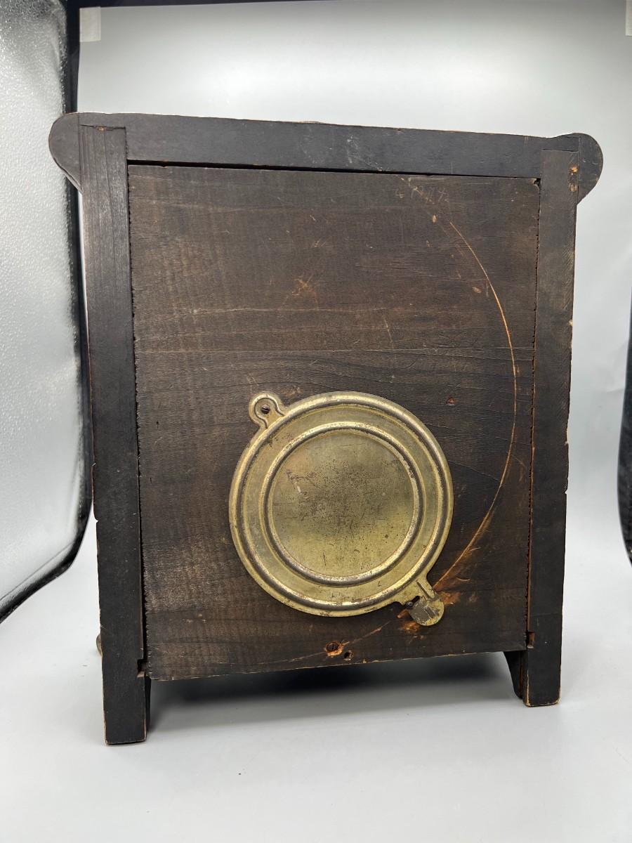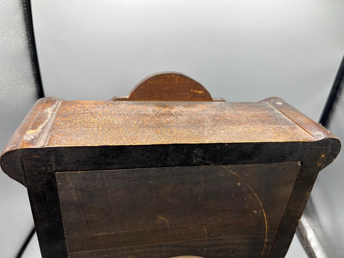 There is some vintage wear to the wooden clock, but there is no significant damage to the wood and is in overall good collectible or displayable condition. Comes with the key and an extra weight, has not been tested. Check pictures for more details and for sizing.