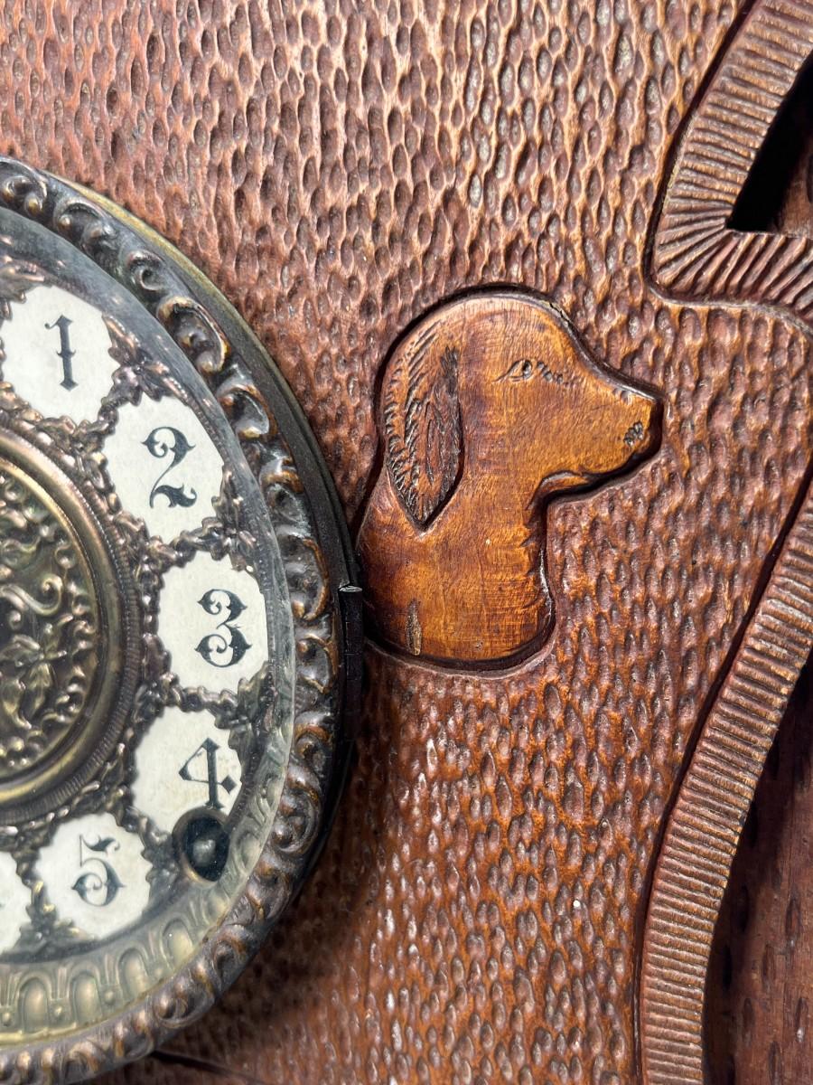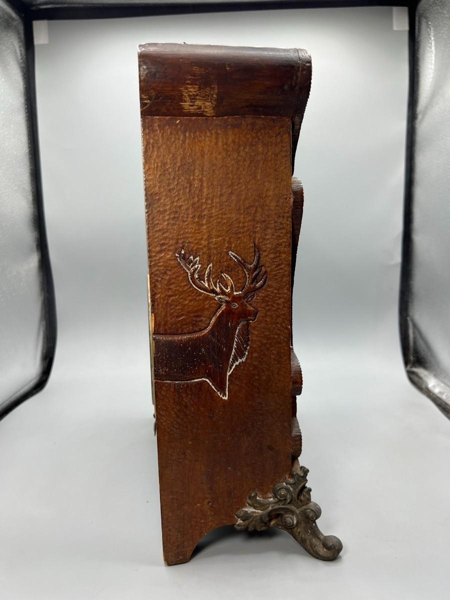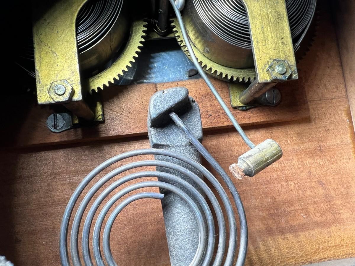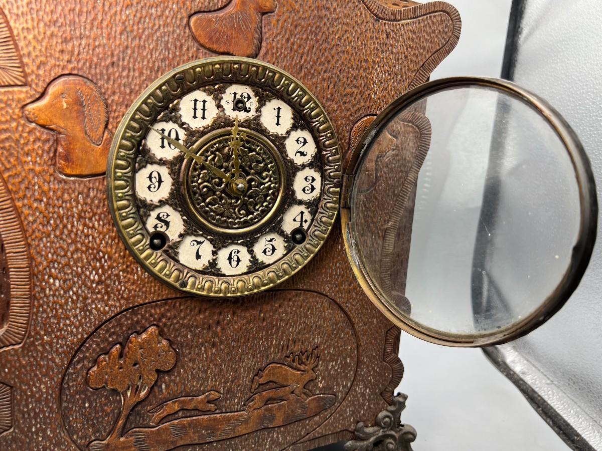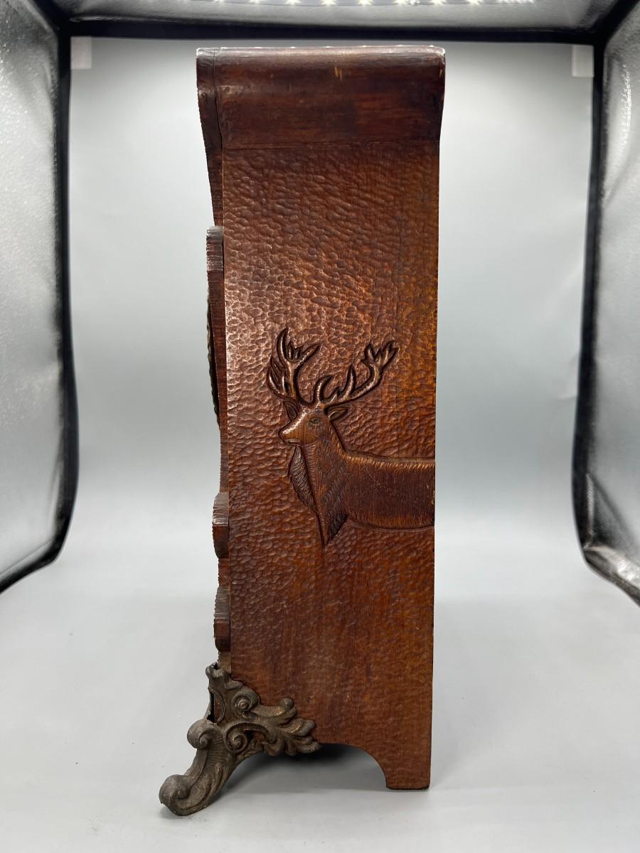 There is some vintage wear to the wooden clock, but there is no significant damage to the wood and is in overall good collectible or displayable condition. Comes with the key and an extra weight, has not been tested. Check pictures for more details and for sizing.