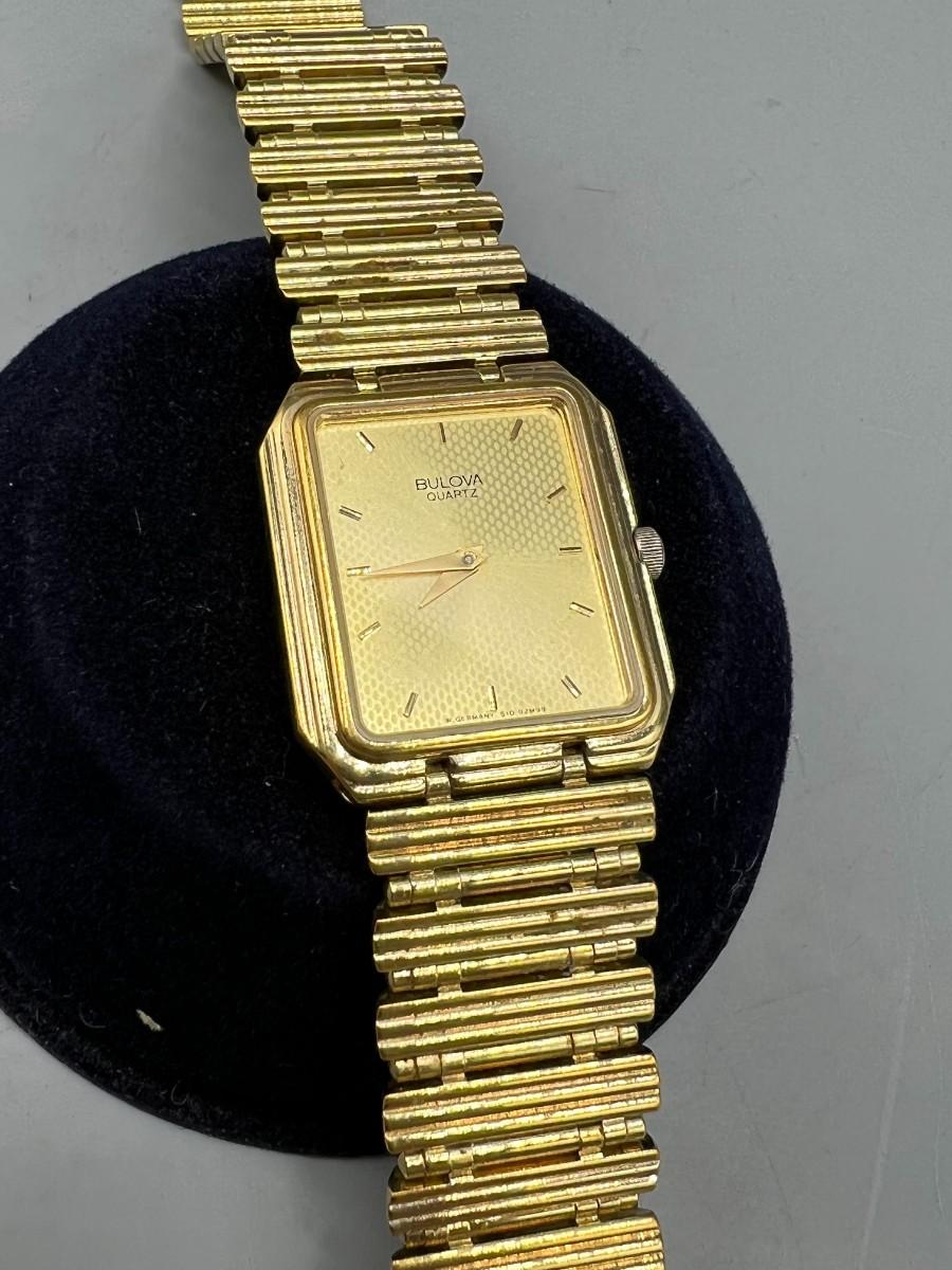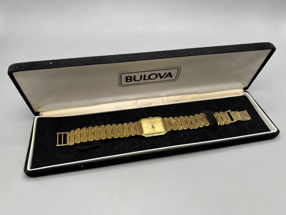 Vintage Retro Bulova Gold Tone Quartz Wristwatch Watch Time Piece West Germany. Not running. Light wear from normal use. Gold electroplate finish. Original watch Bulova watch box.