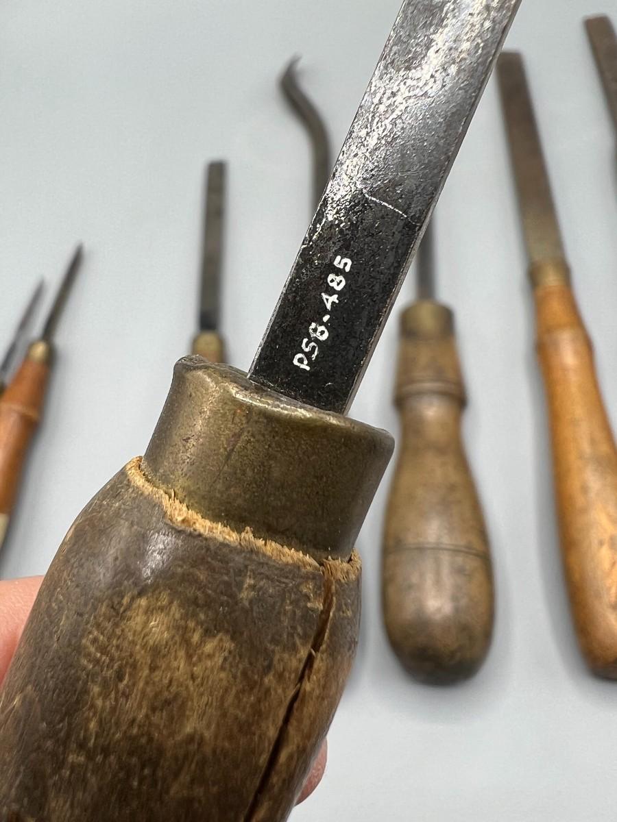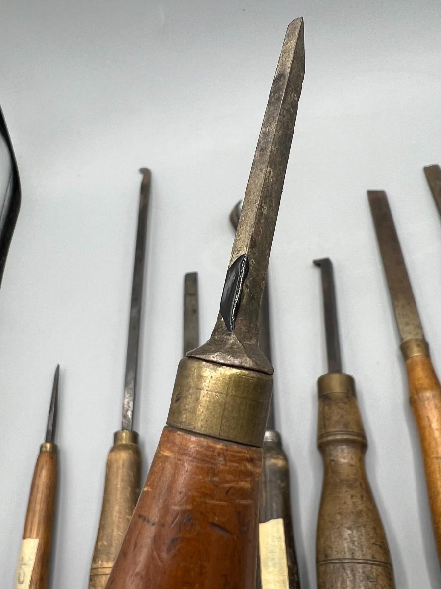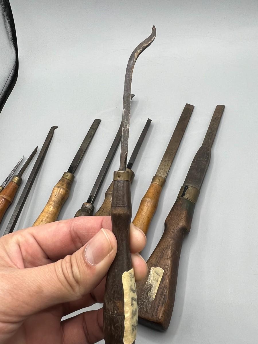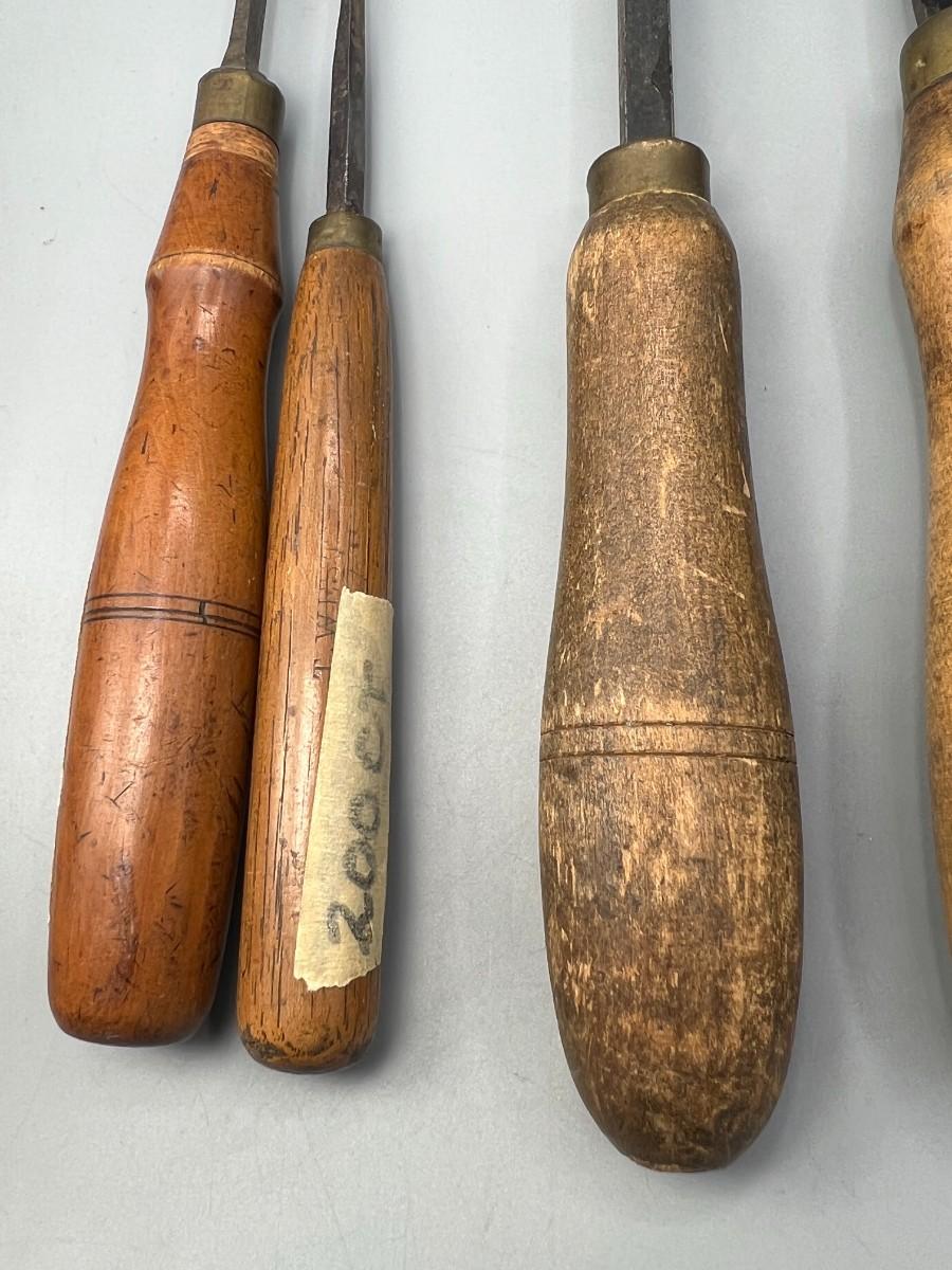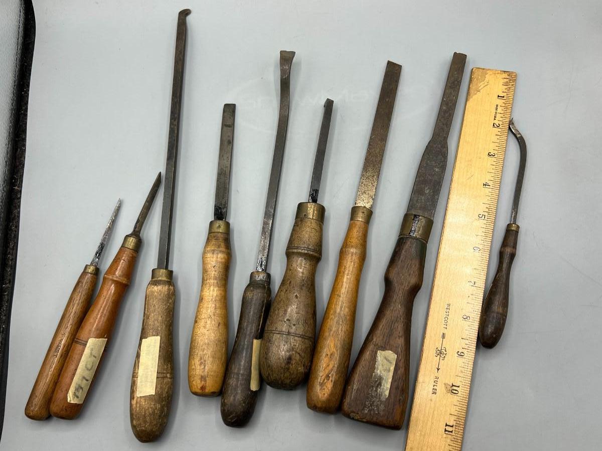 There is antique wear to some of the chisels, and there is tape on some of the handles that leave residue when peeled back. Check pictures for more details and for sizing.