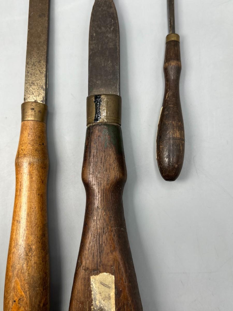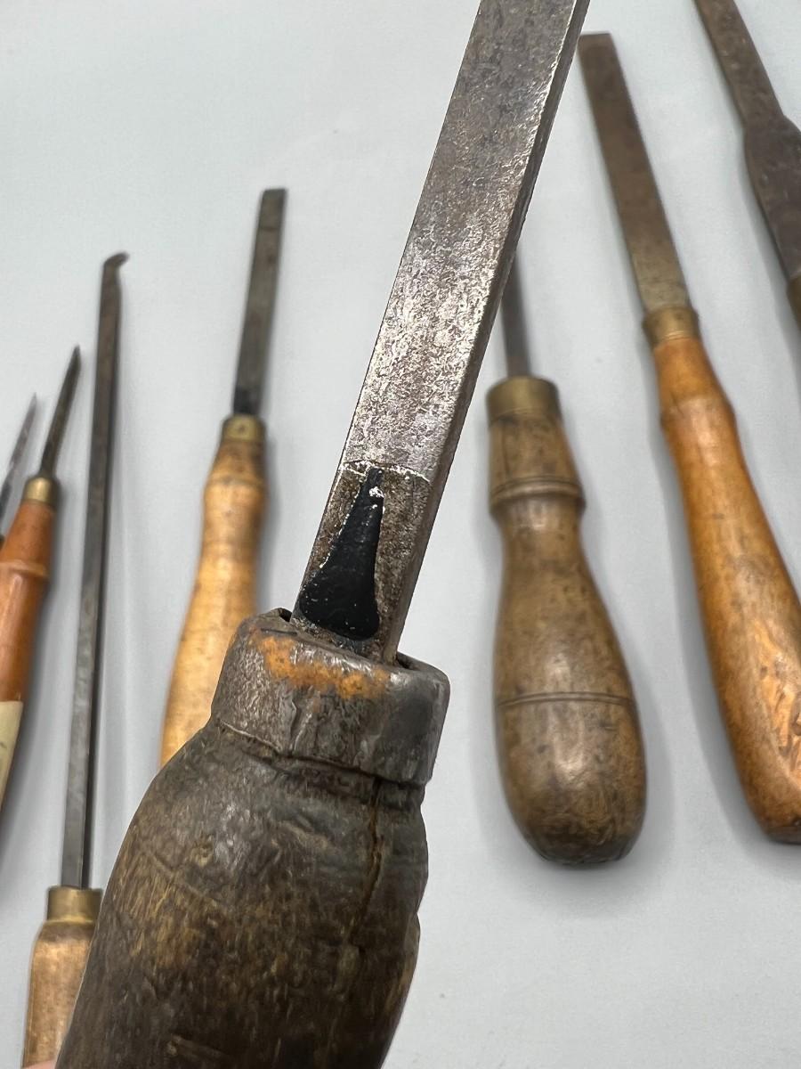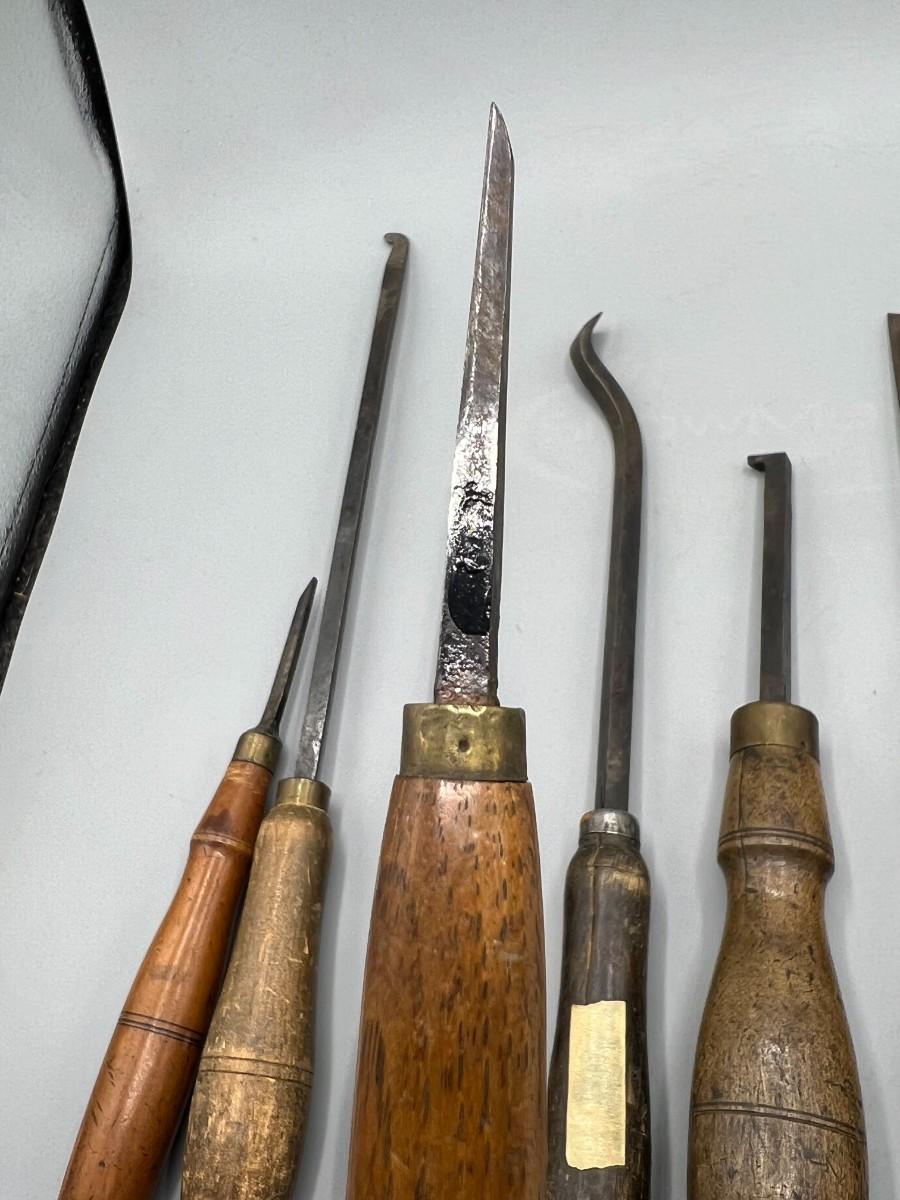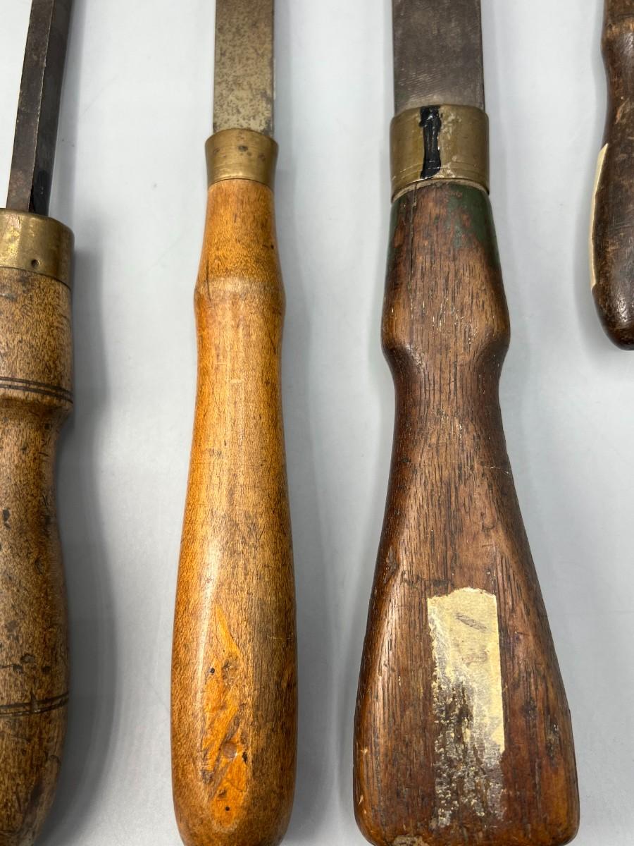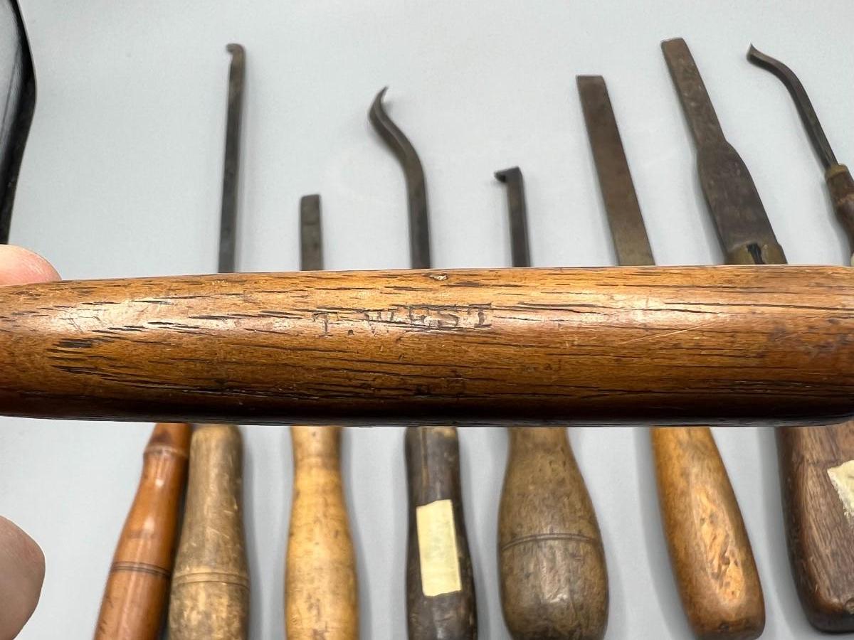 There is antique wear to some of the chisels, and there is tape on some of the handles that leave residue when peeled back. Check pictures for more details and for sizing.