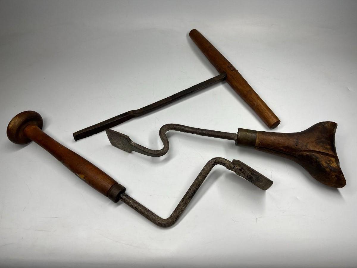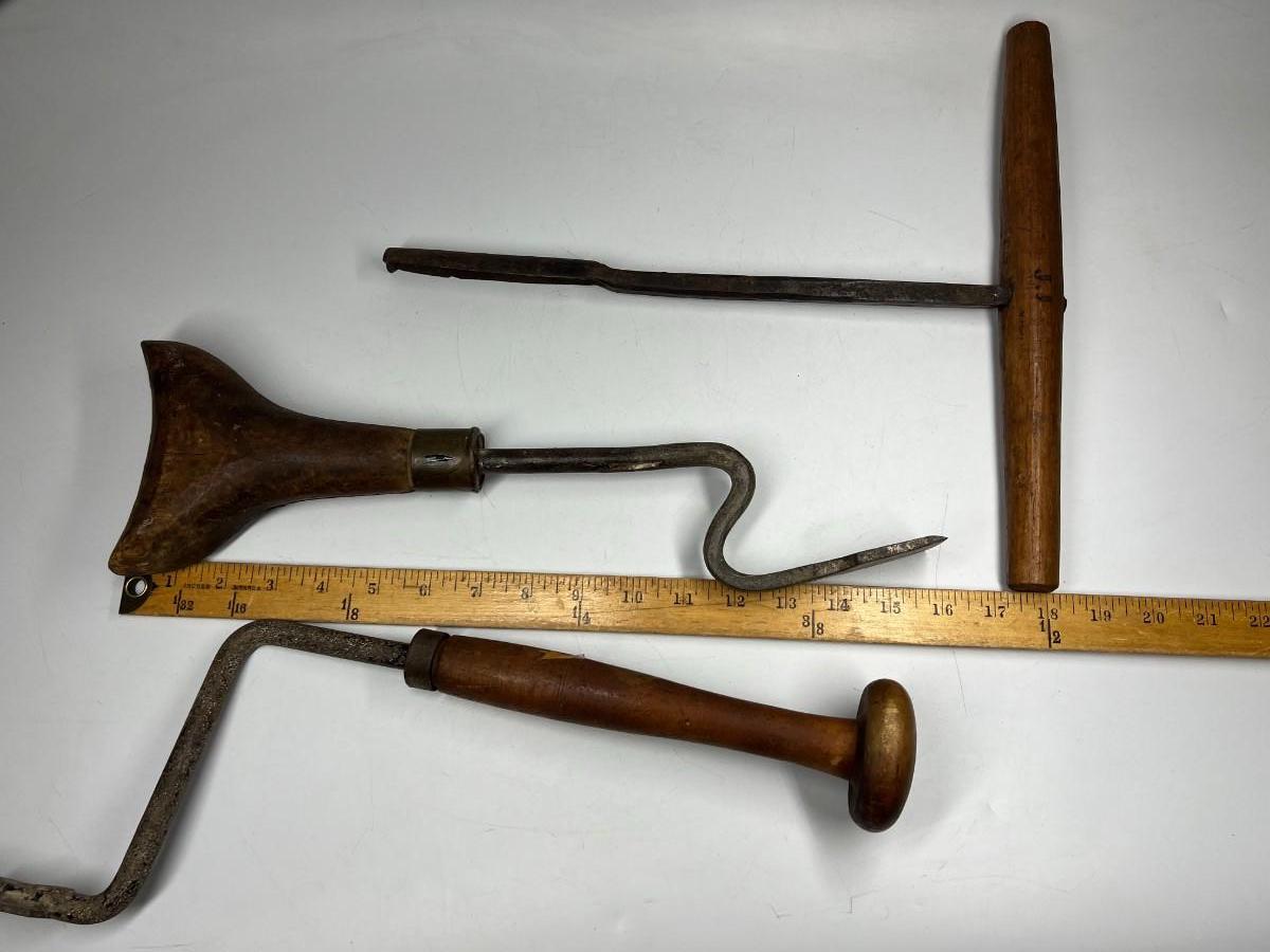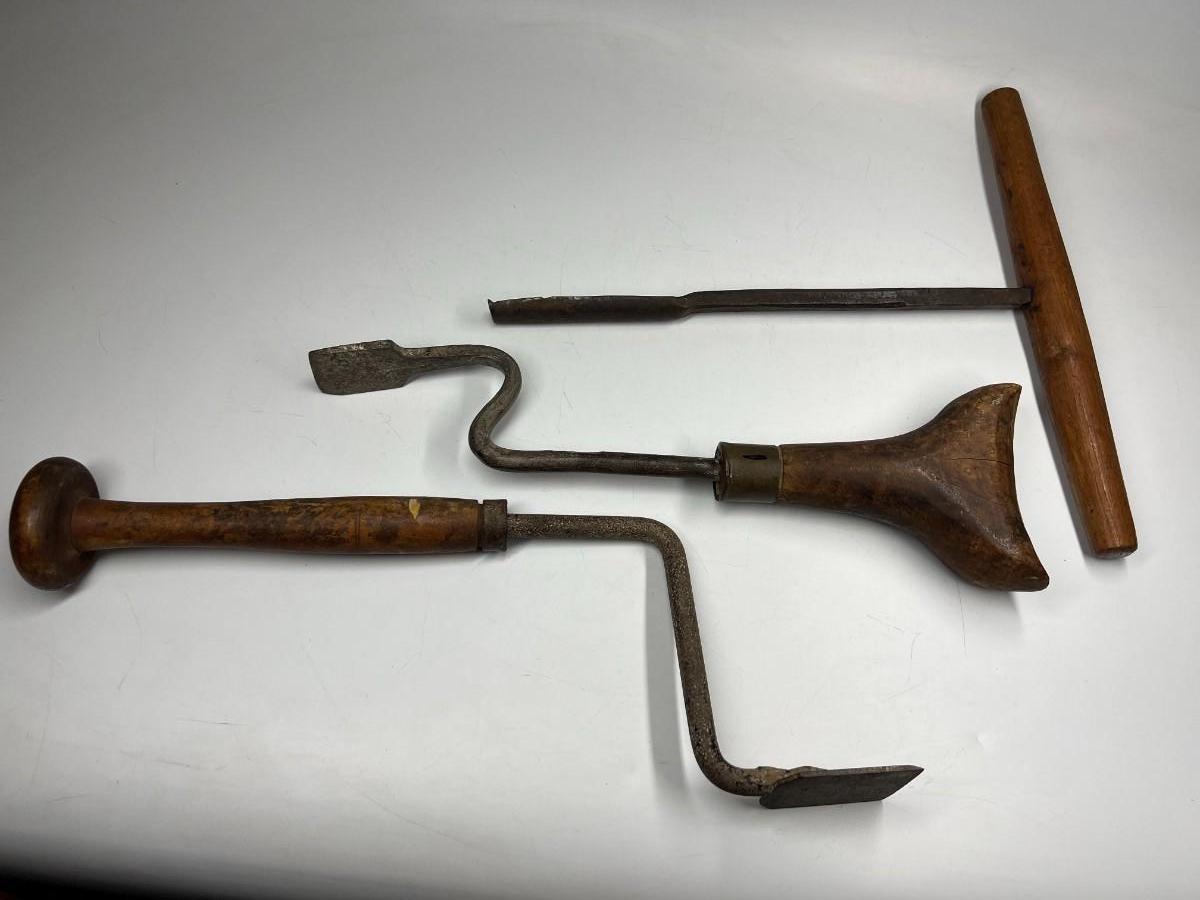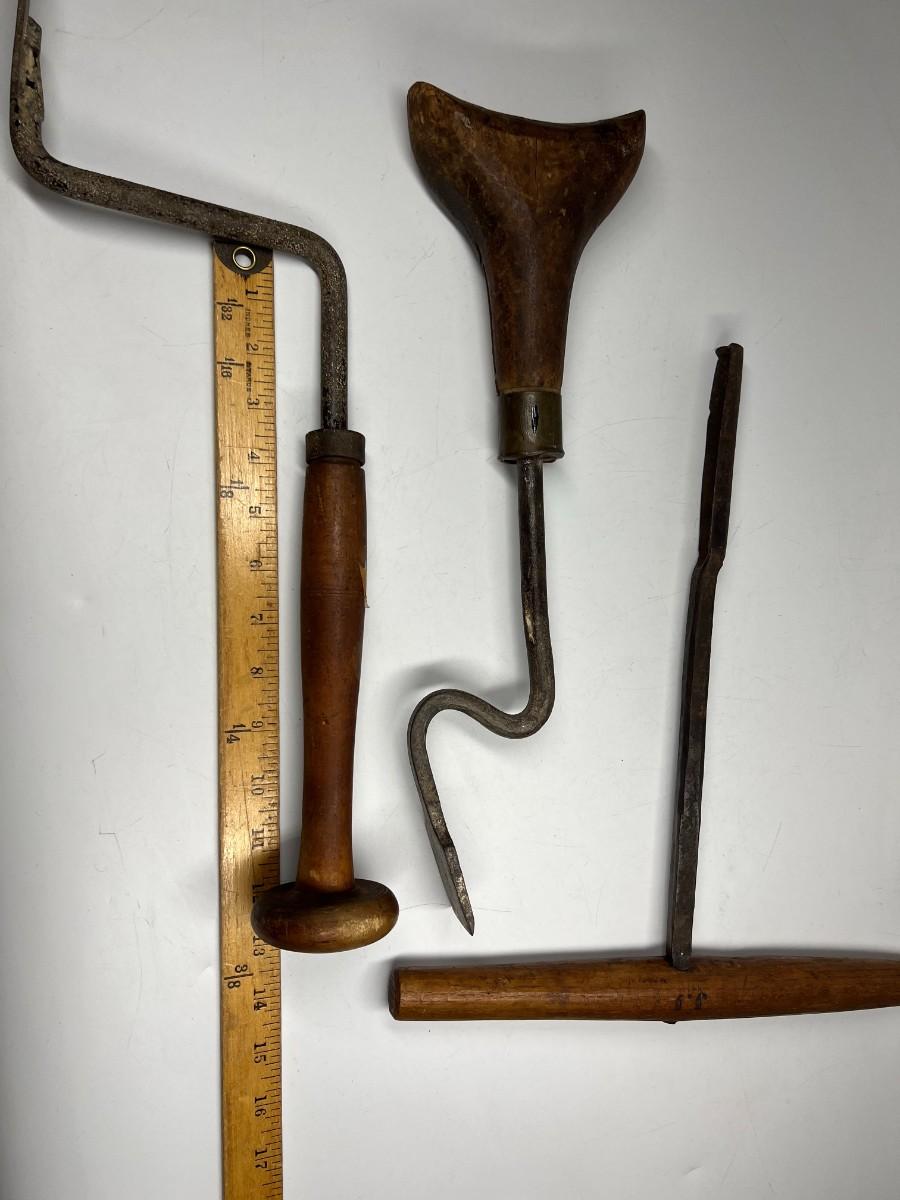 There is antique wear to all of the tools, there is also cracking to some of the wooden handles. Check pictures for more details and for sizing.