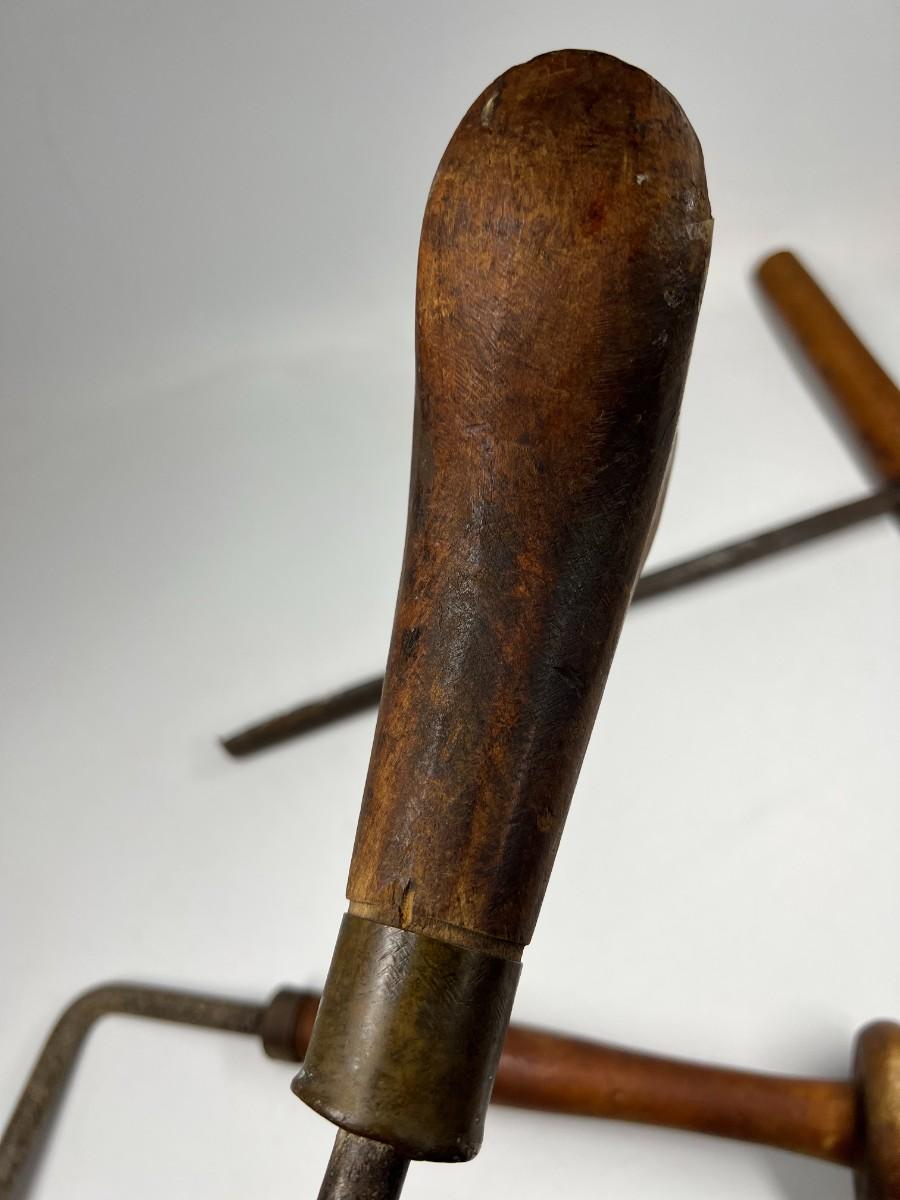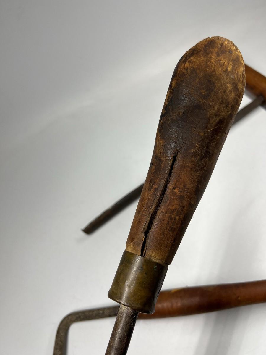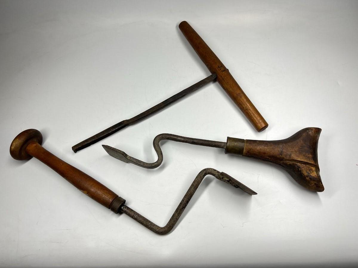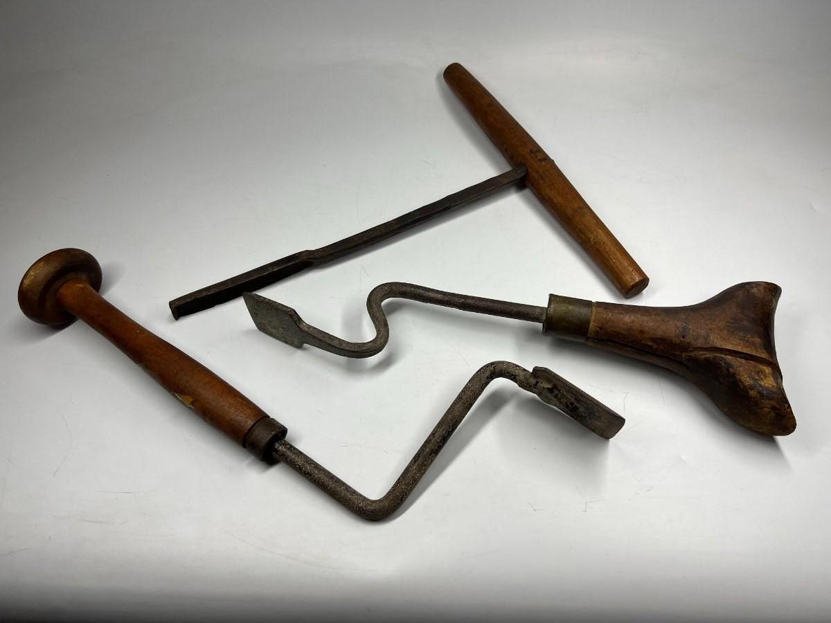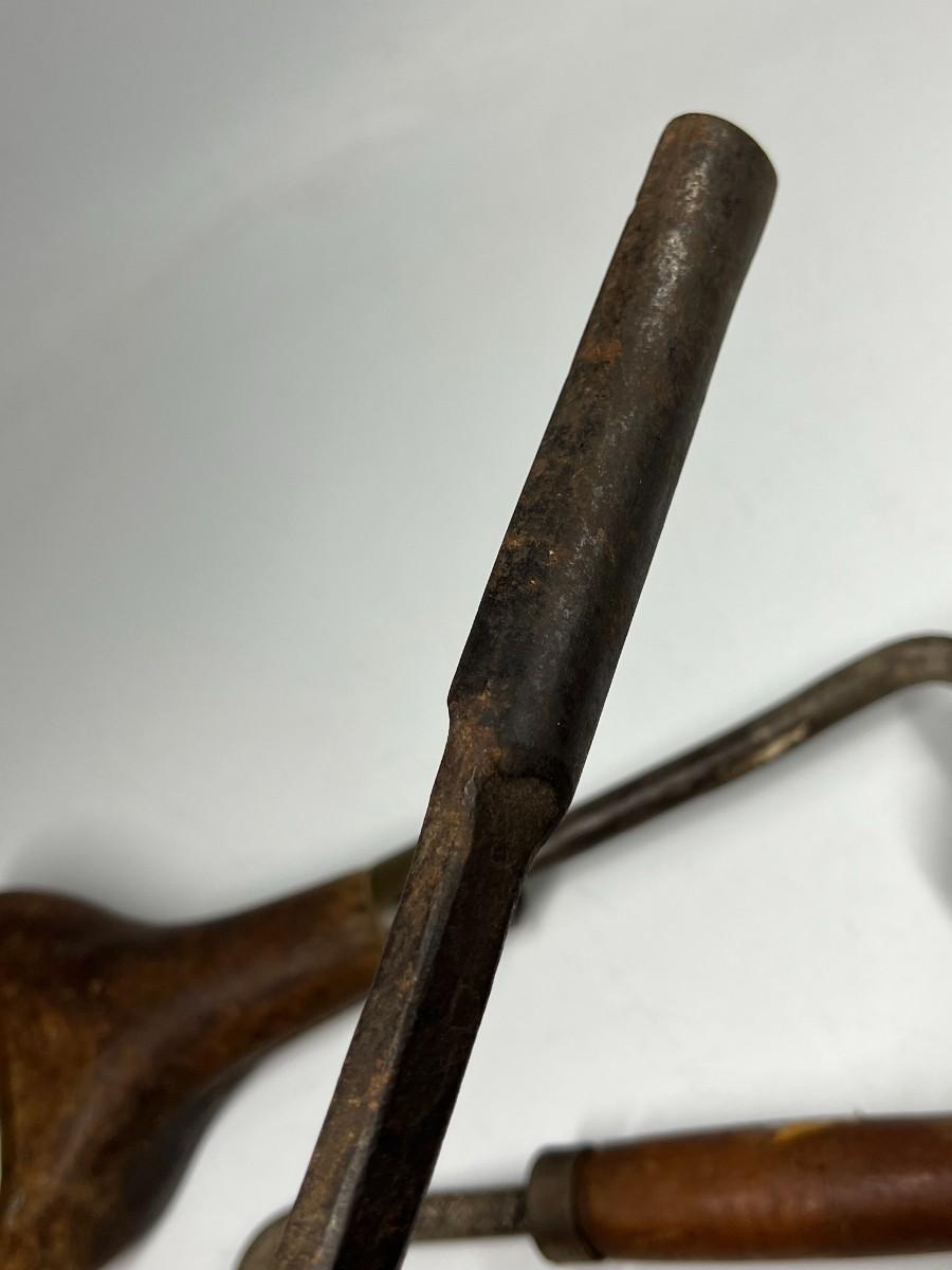 There is antique wear to all of the tools, there is also cracking to some of the wooden handles. Check pictures for more details and for sizing.