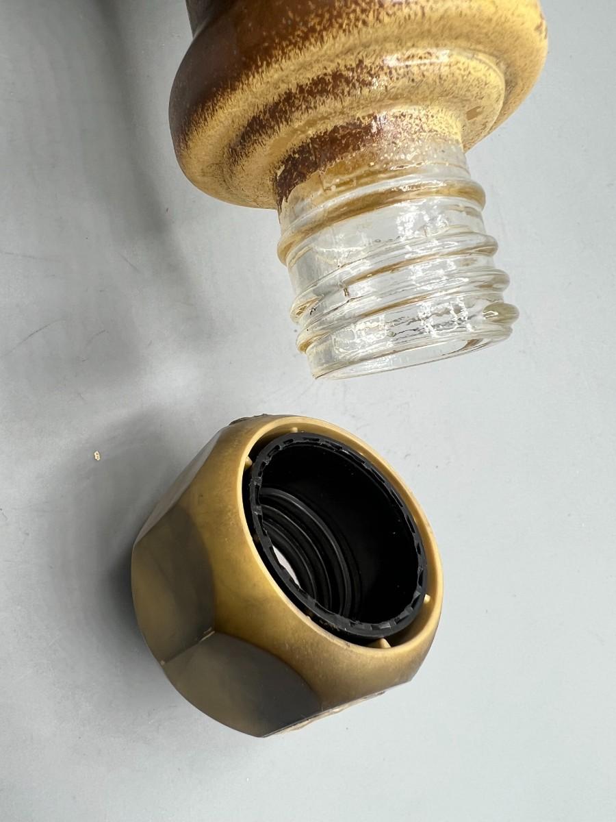 Empty and opened bottle, the cap is a screw on. Glass bottle is in good condition, nice graphic.