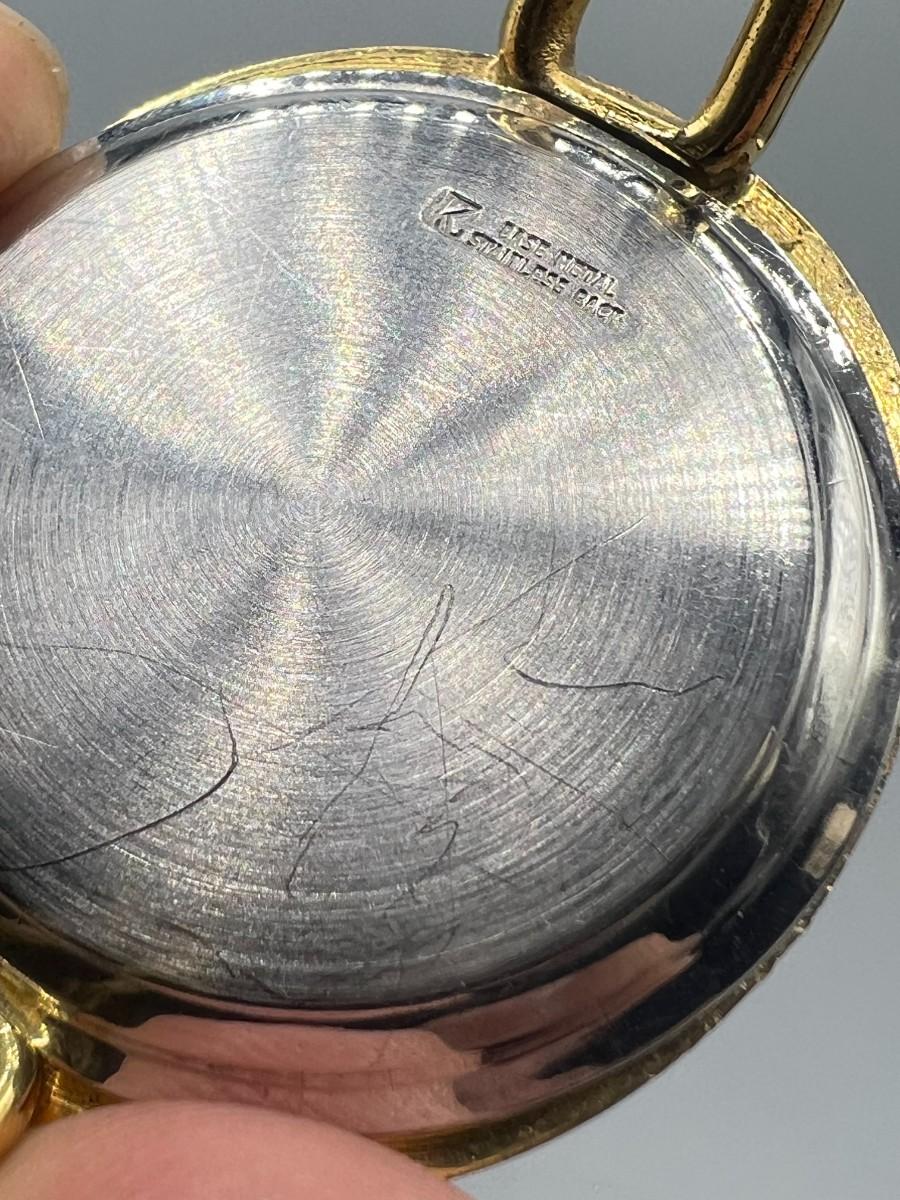 There are some light scratches on the watch face, but there is no damage and is in good wearable condition. When the watch is wound up there is a ticking noise coming from the watch and is in working condition.