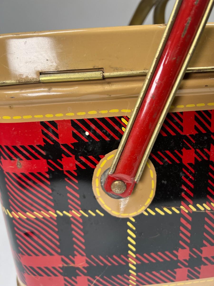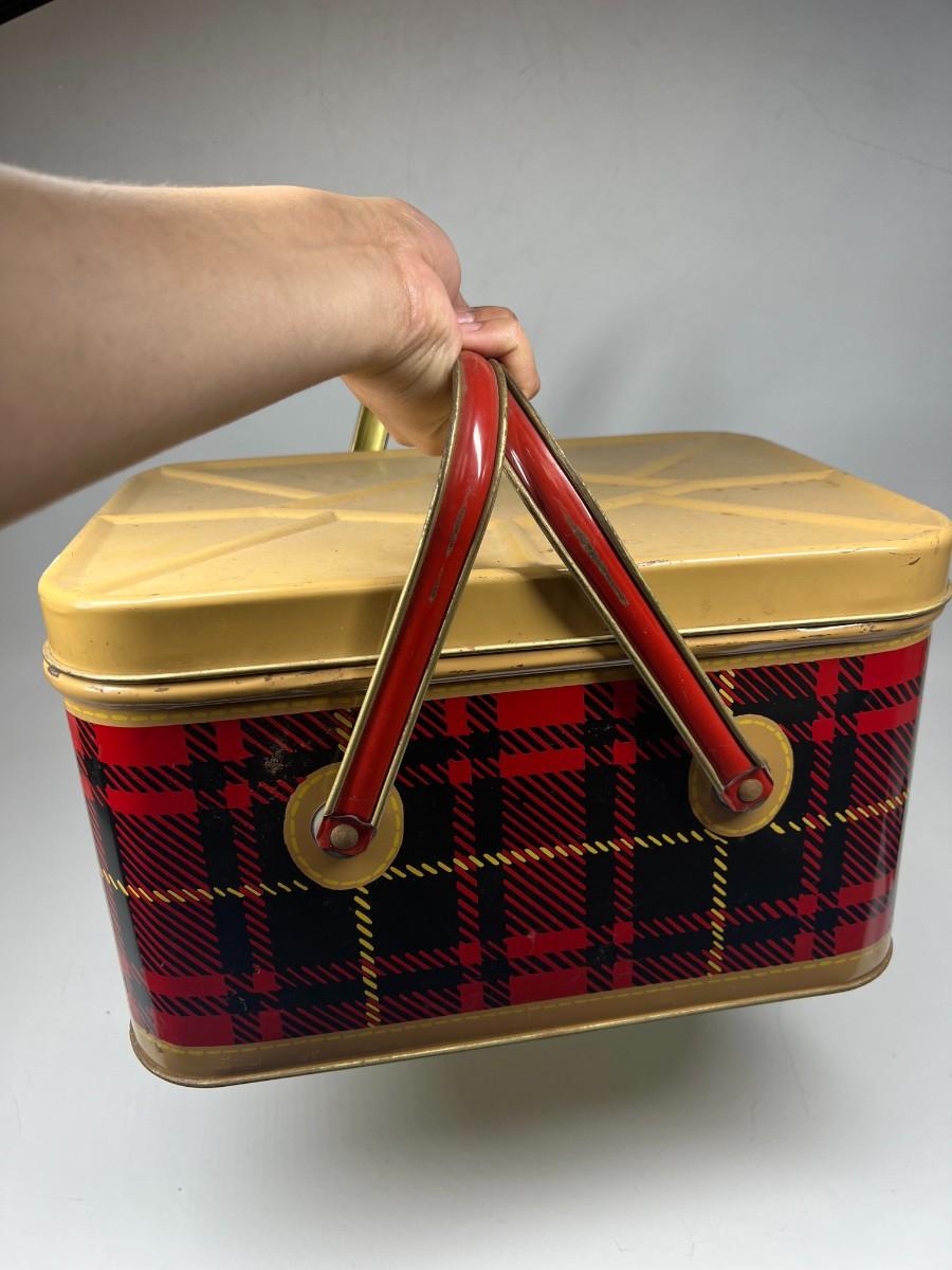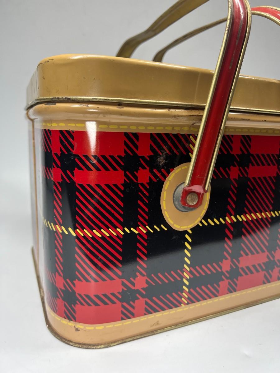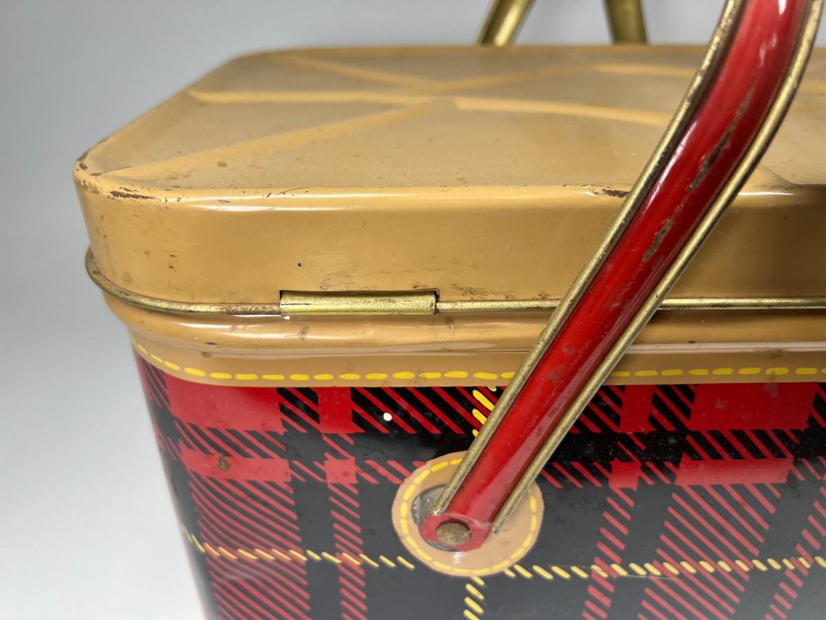 Cute Retro Red Black Yellow Plaid & Gold Metal Tin Picnic Basket Tote with Handles & Hinged Lid Nesco