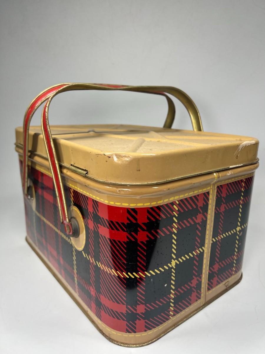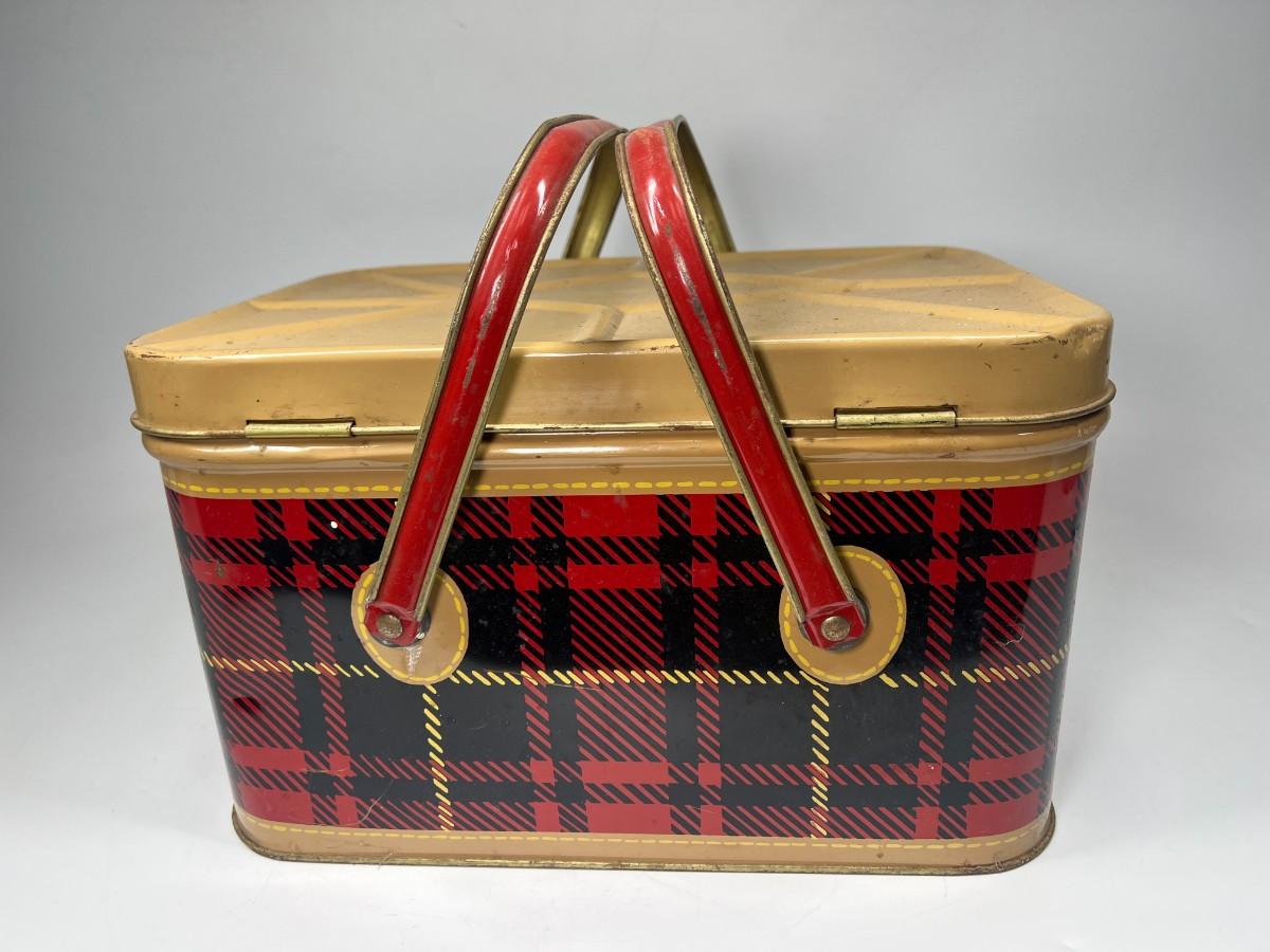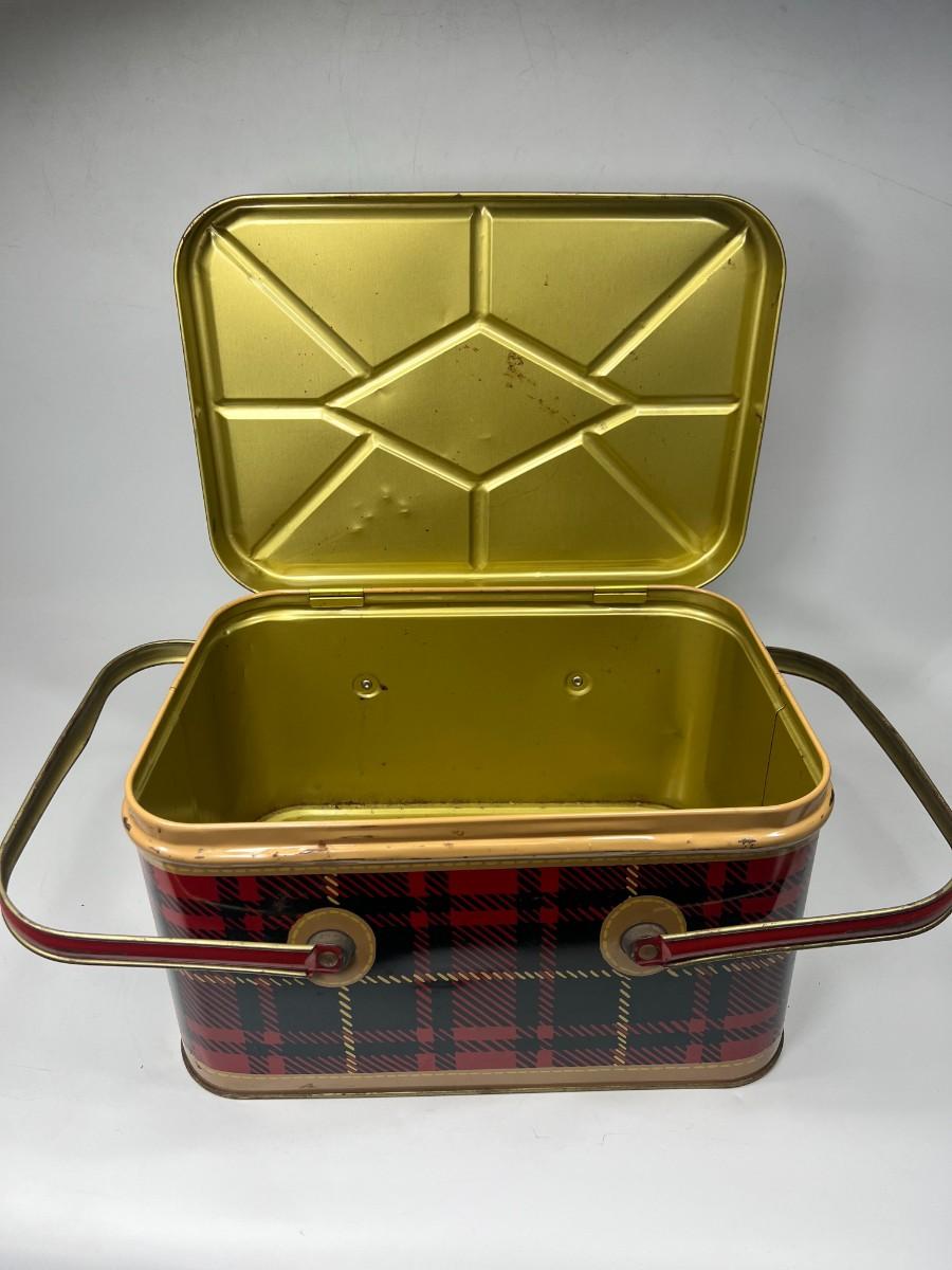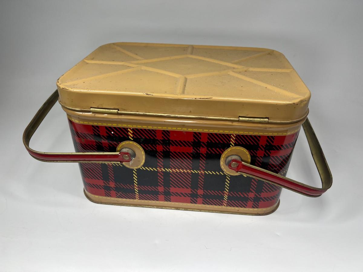 Cute Retro Red Black Yellow Plaid & Gold Metal Tin Picnic Basket Tote with Handles & Hinged Lid Nesco