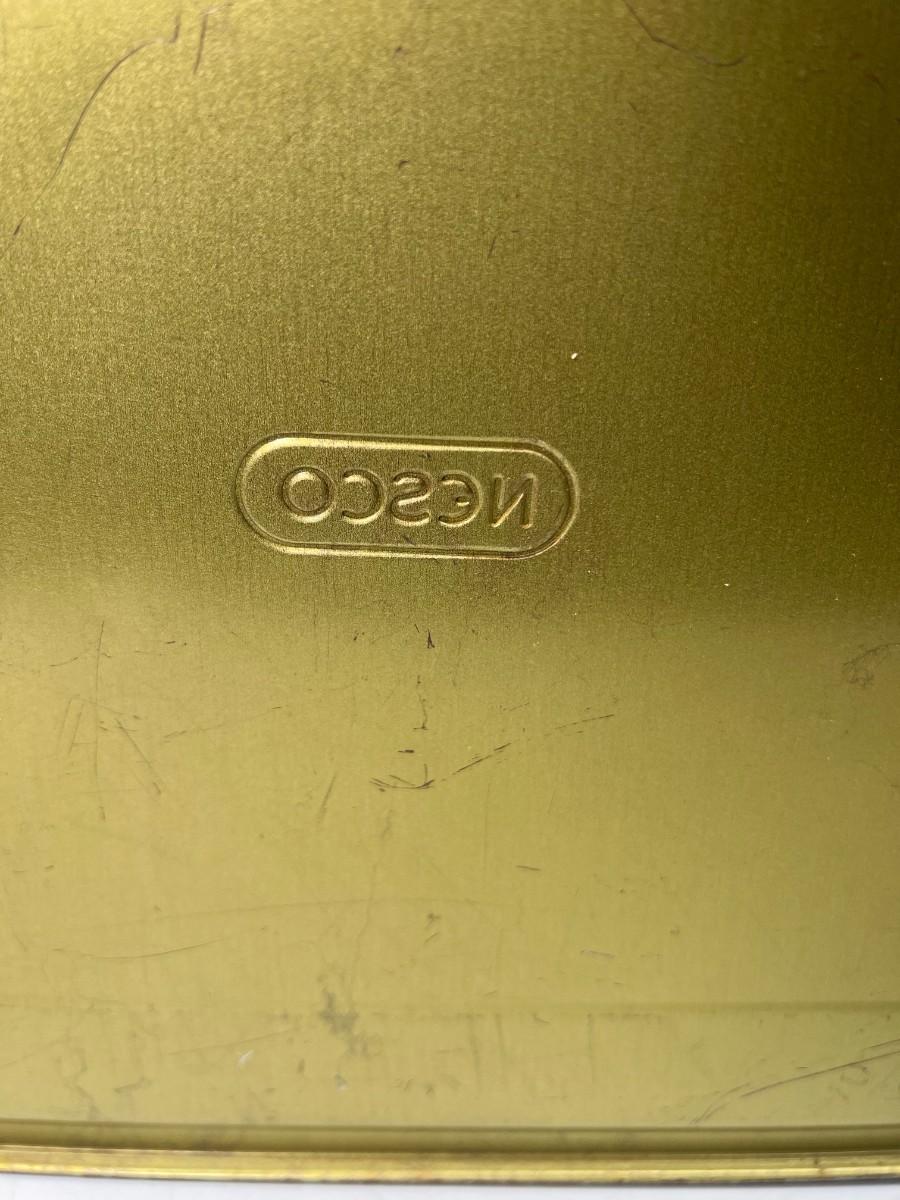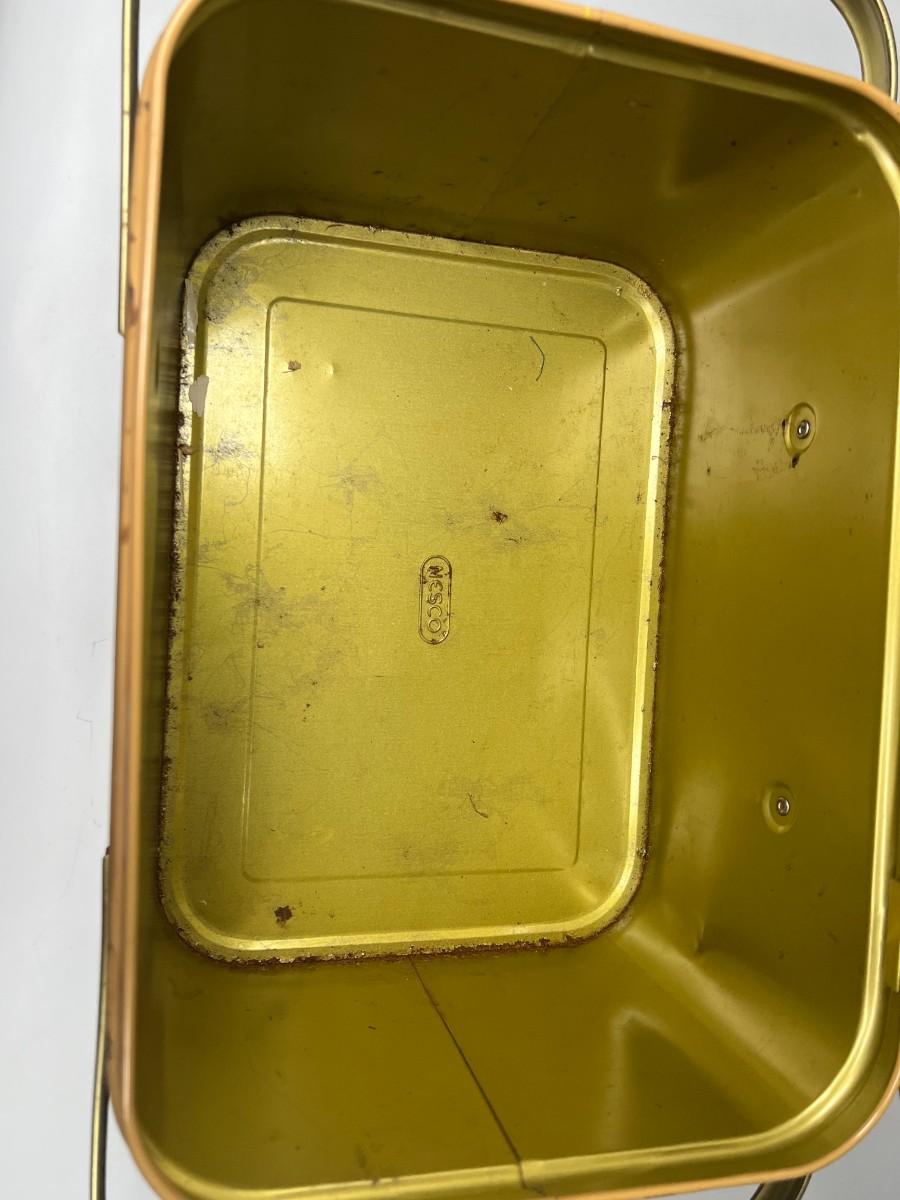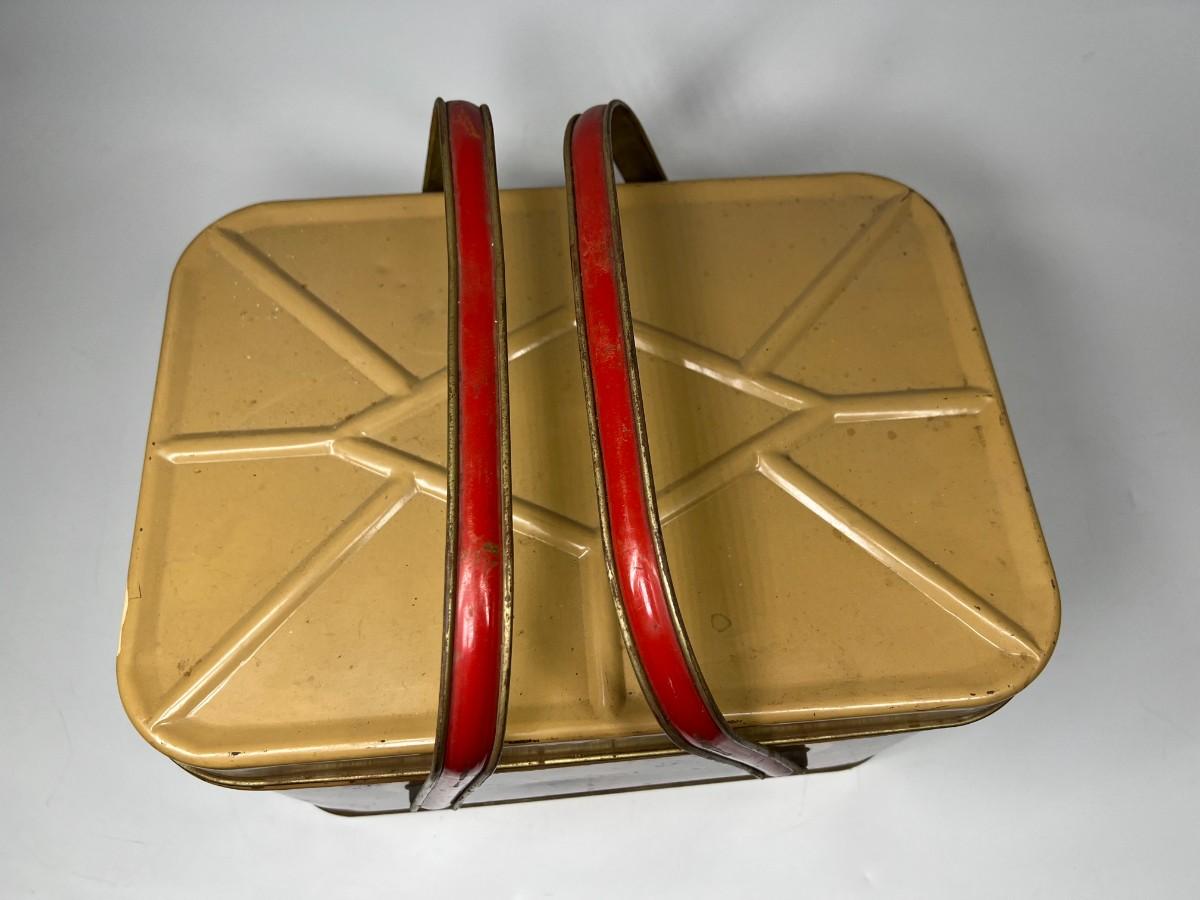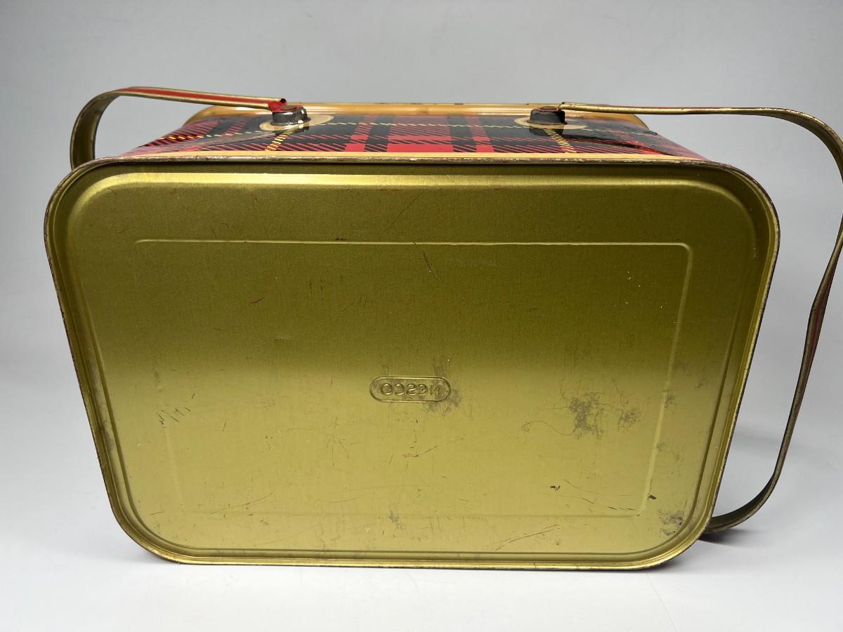 Cute Retro Red Black Yellow Plaid & Gold Metal Tin Picnic Basket Tote with Handles & Hinged Lid Nesco