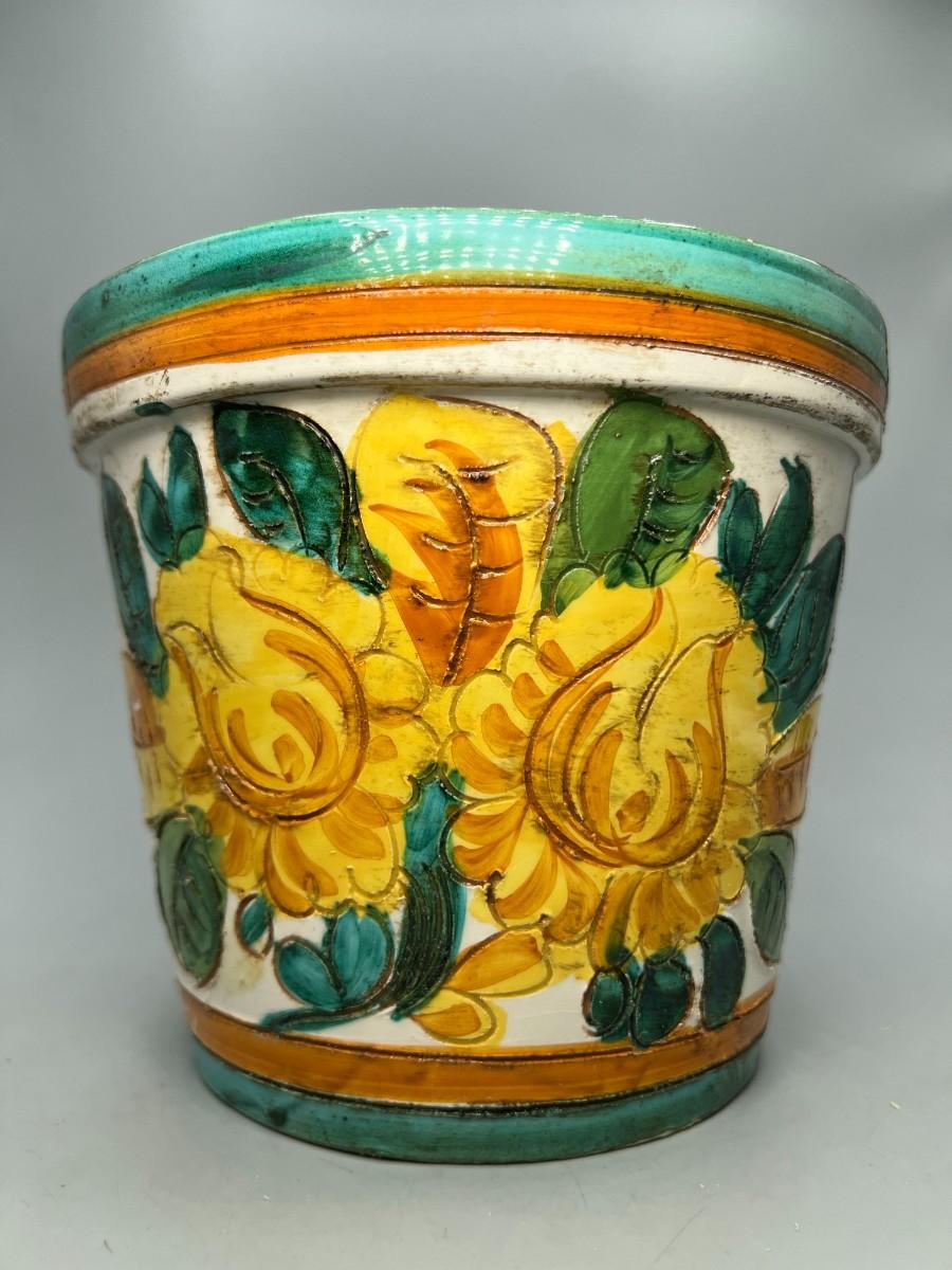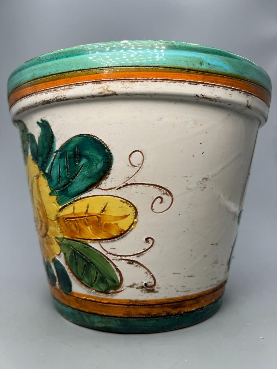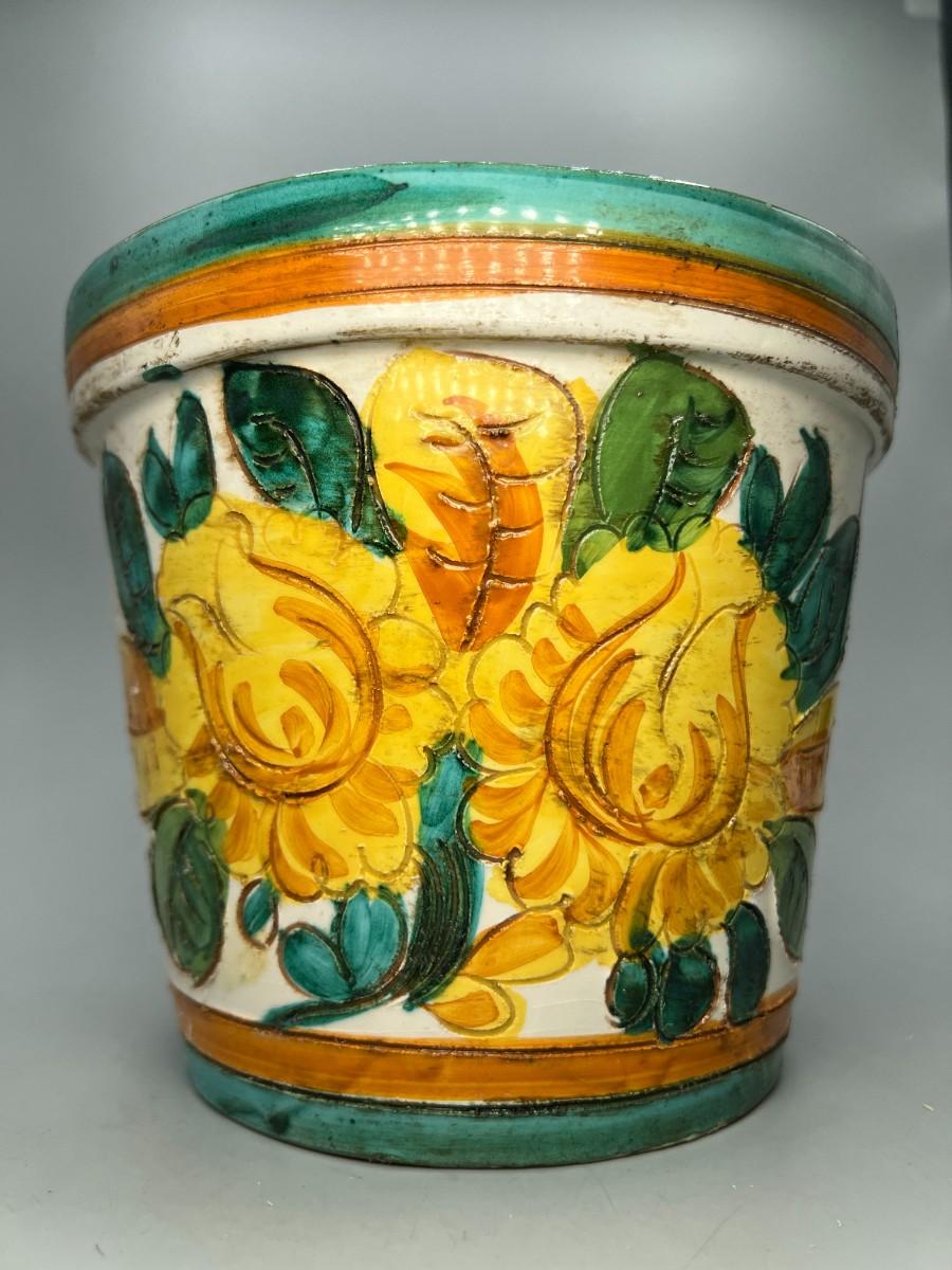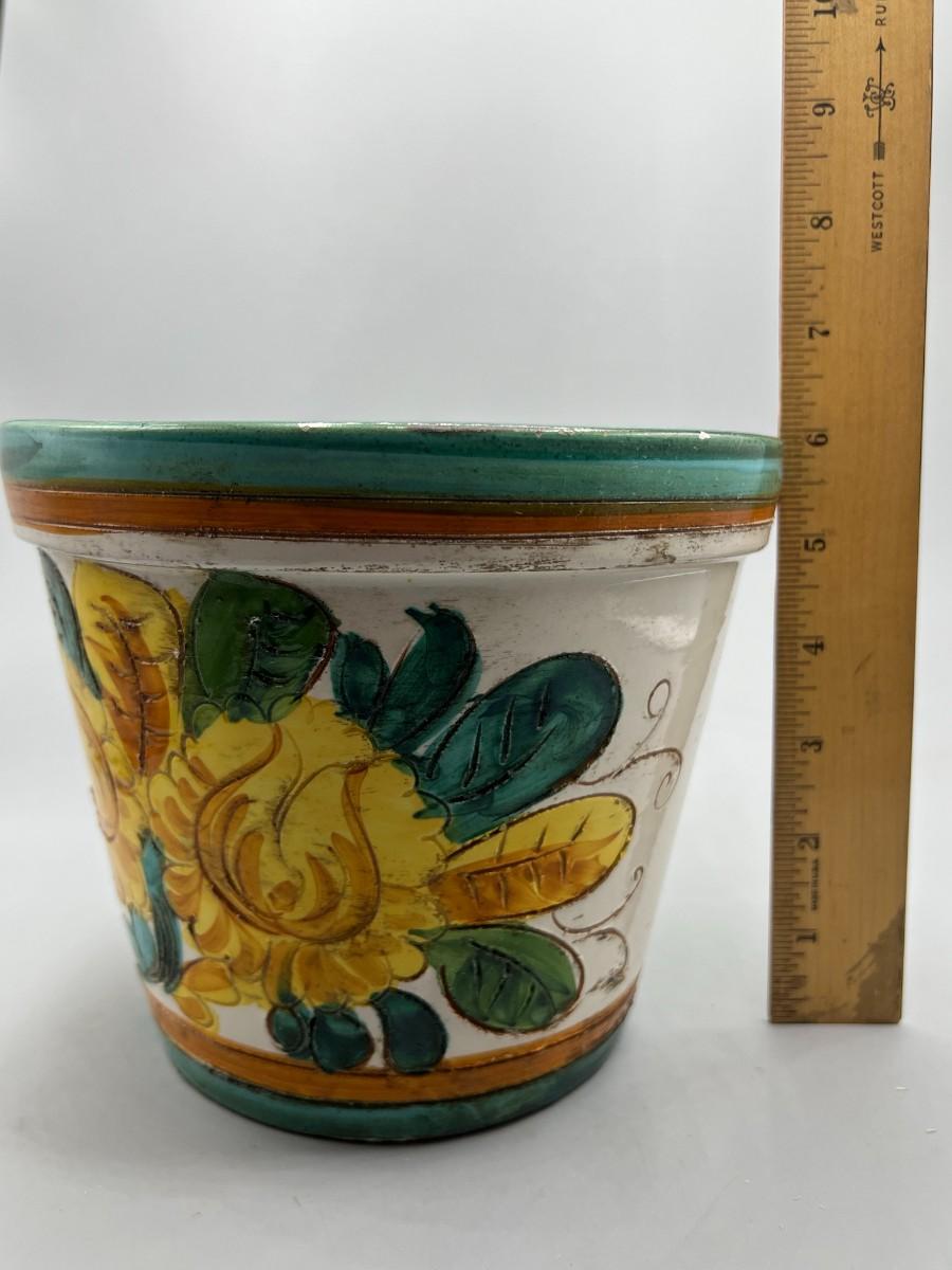 Colorful Yellow Floral Ceramic Planter Pot Italy. In used condition. About 6" size. Marked Italy on the bottom.