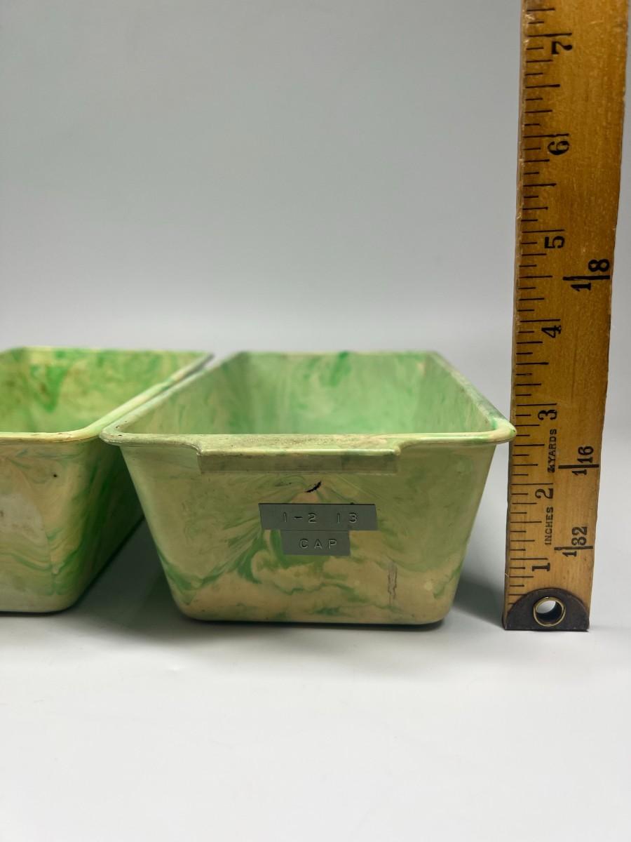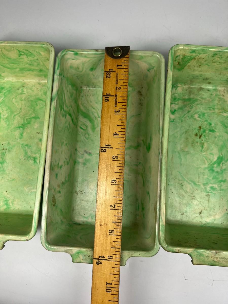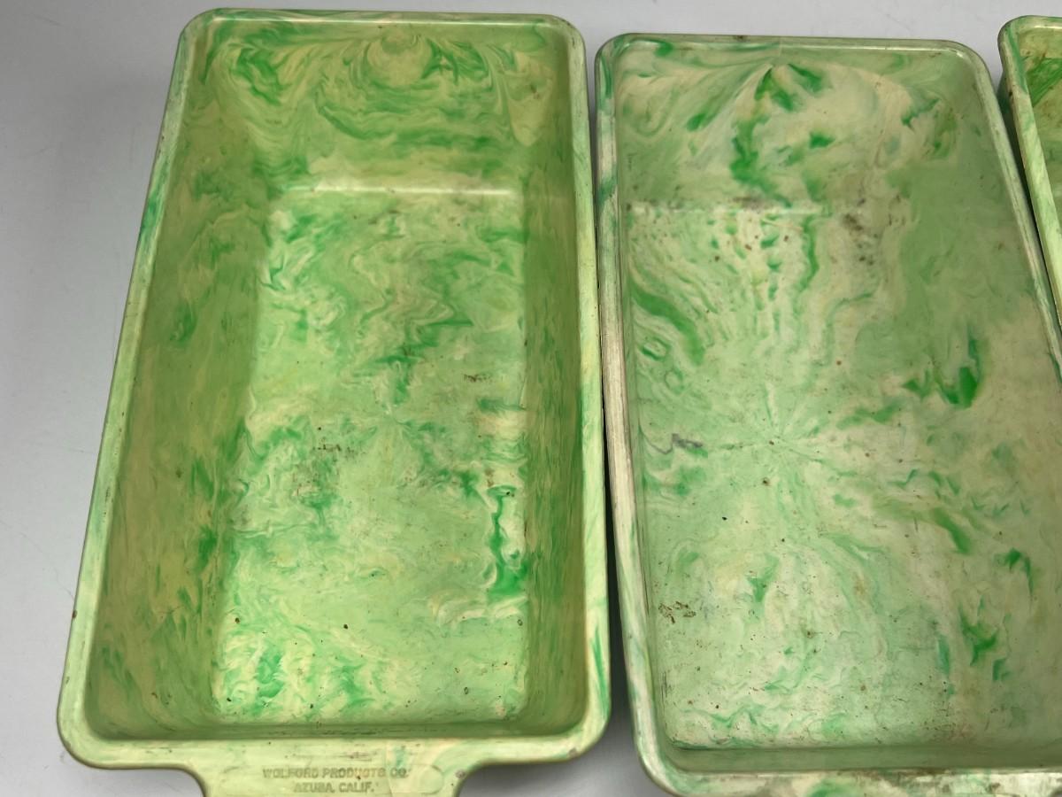 Vintage Green Swirl Wolford Product Co. Small Plastic Bins. Look like bread pans but I wouldn't use with heat. Great for organizing drawers and things.