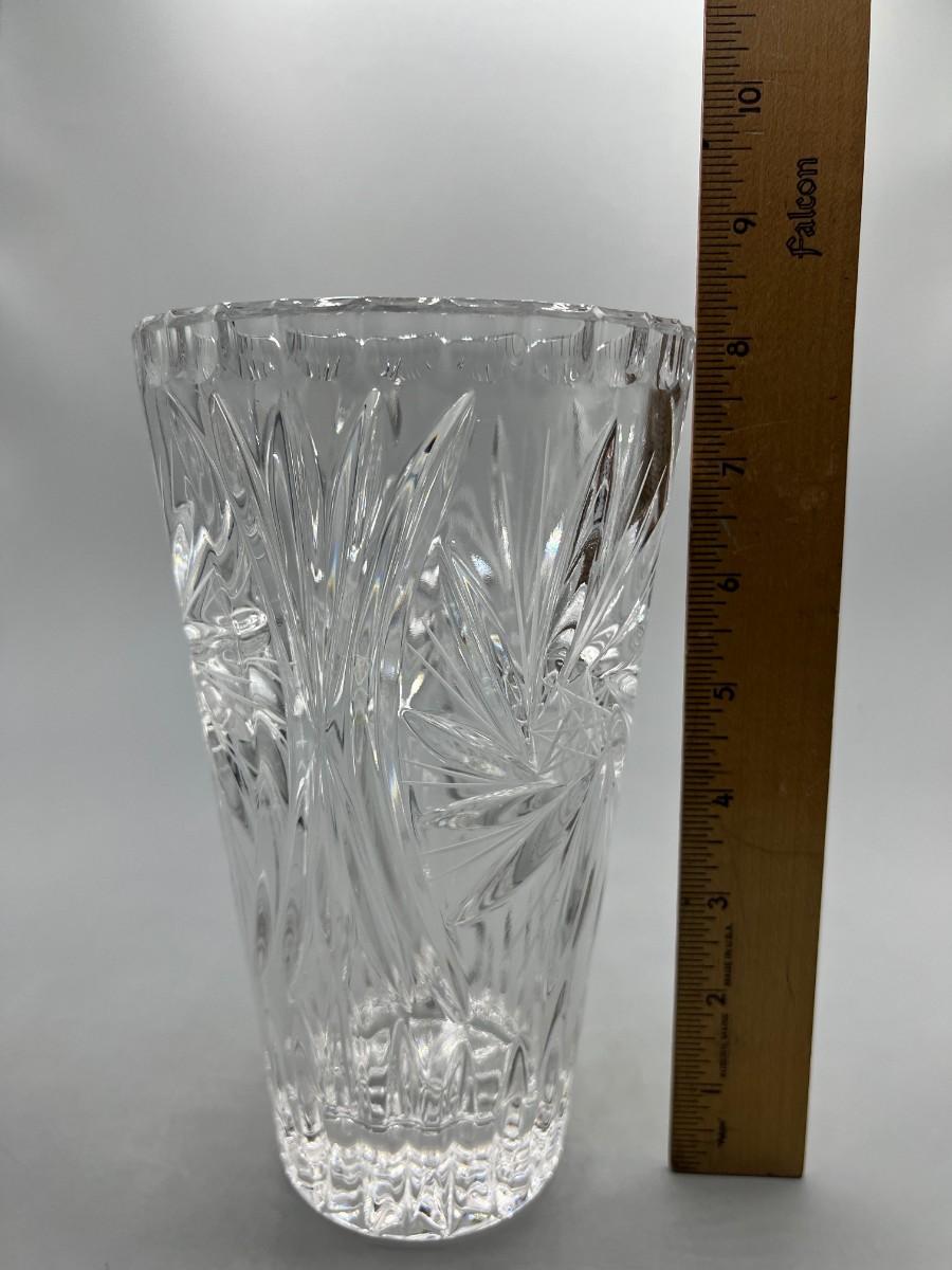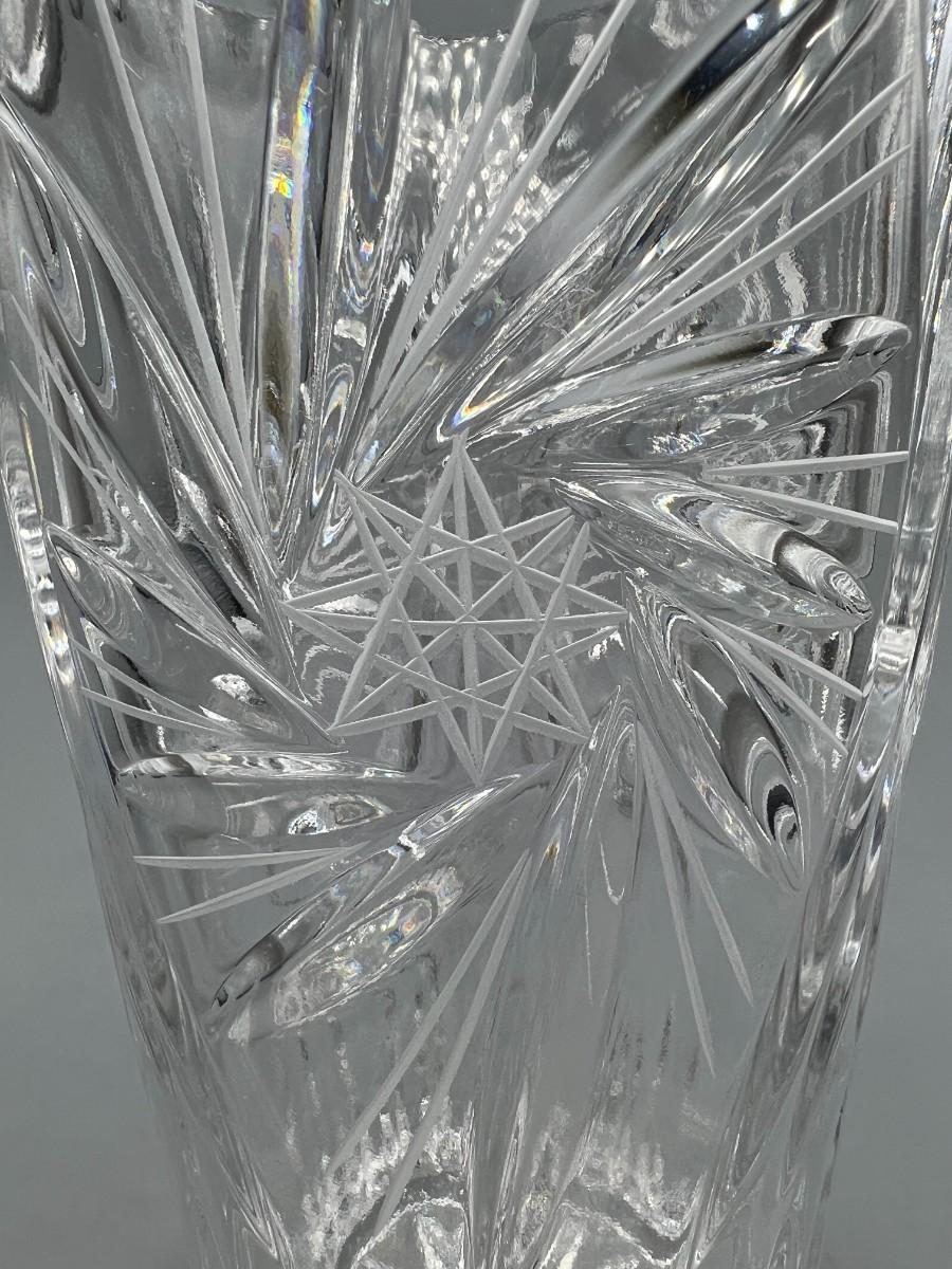 Vintage Brilliant Cut Crystal Glass Flower Vase Pinwheel and Star Pattern. In good condition. Star and pinwheel cut pattern. 8" size.