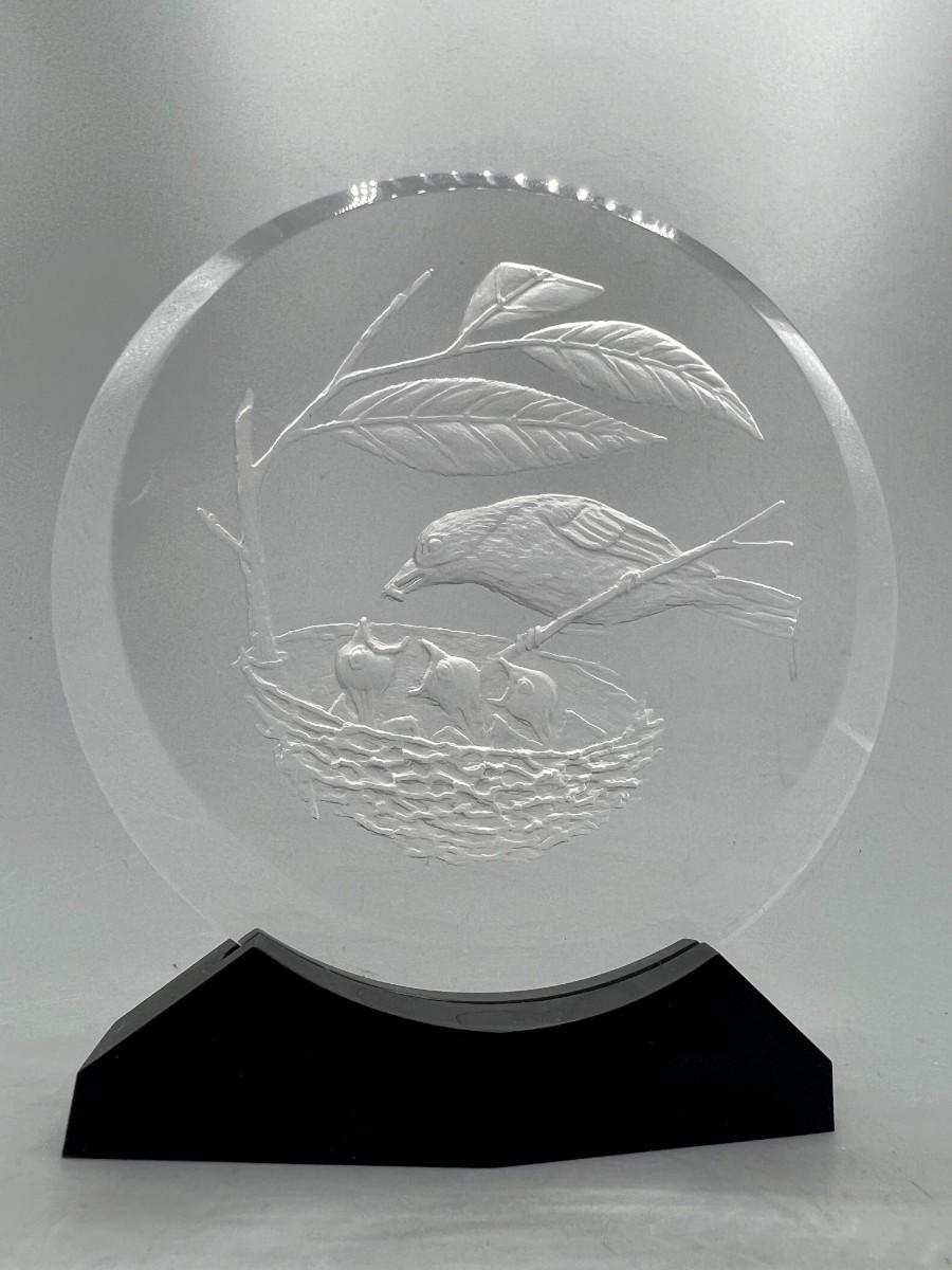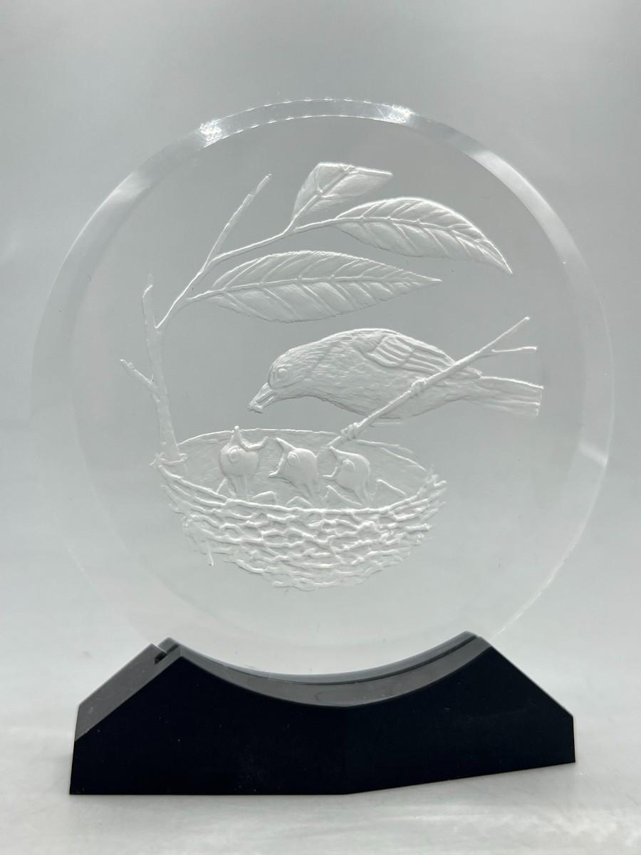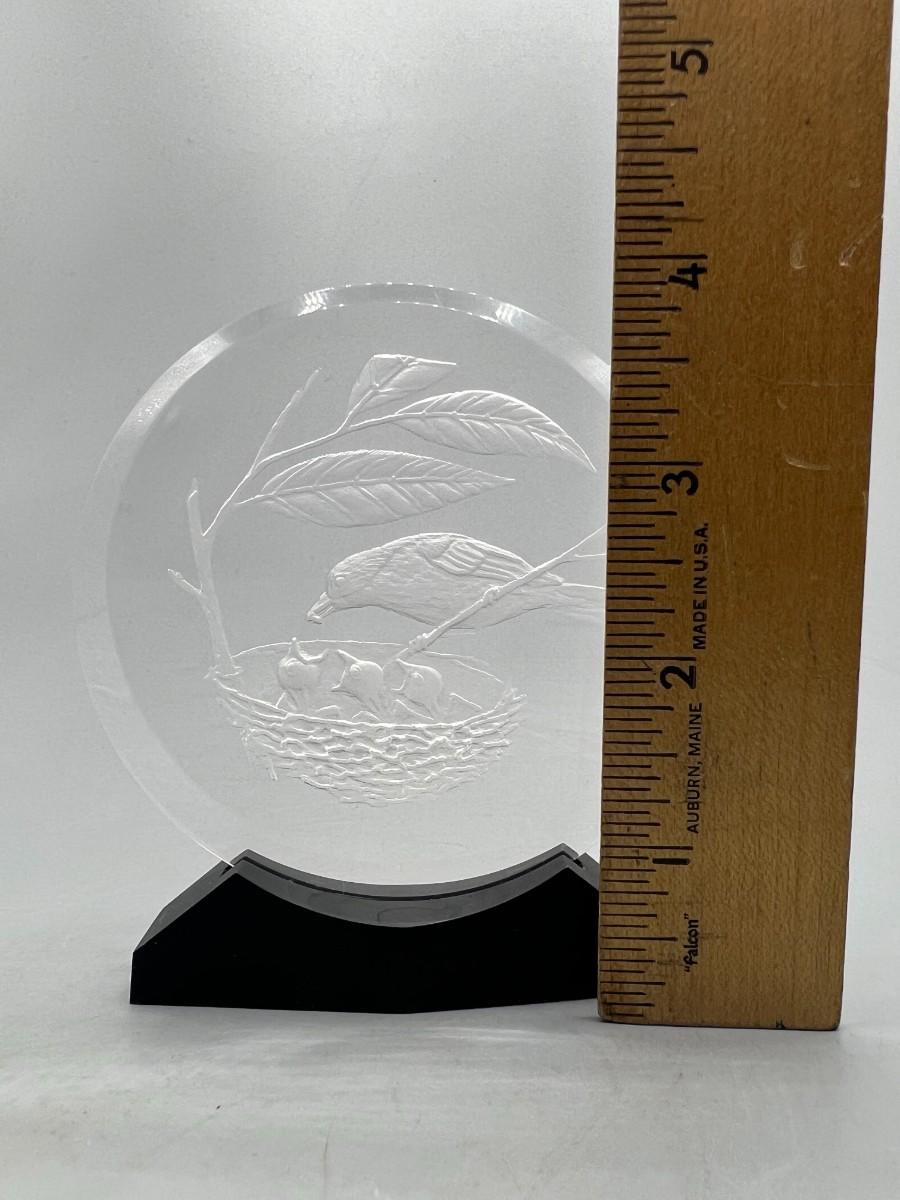 Vintage Etched Glass Medallion Art Mother Bird Feeding Babies in Nest. Comes with display stand. In good condition. Small, about 4" total height with stand.