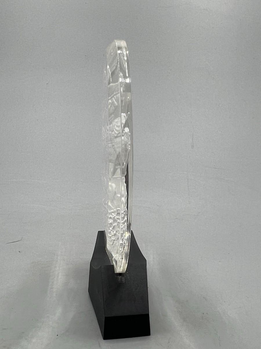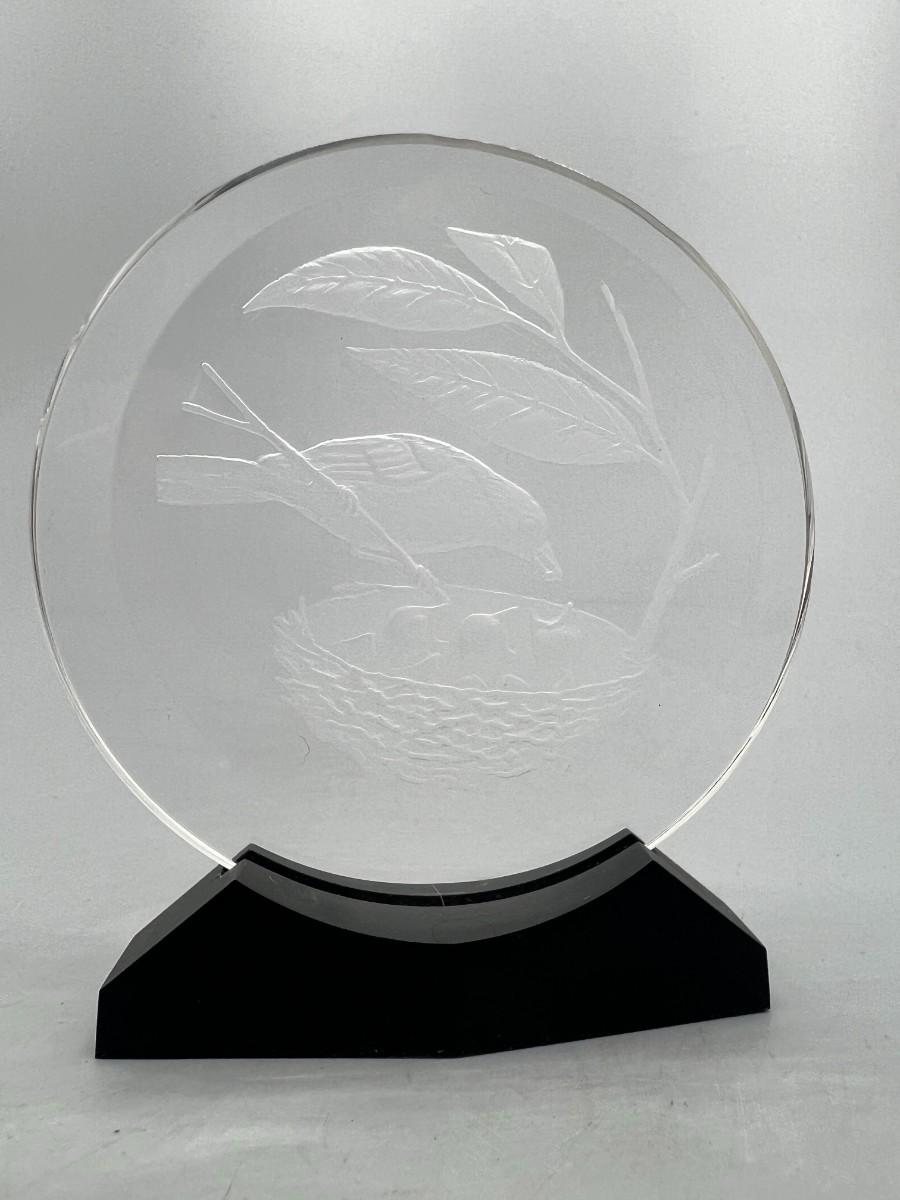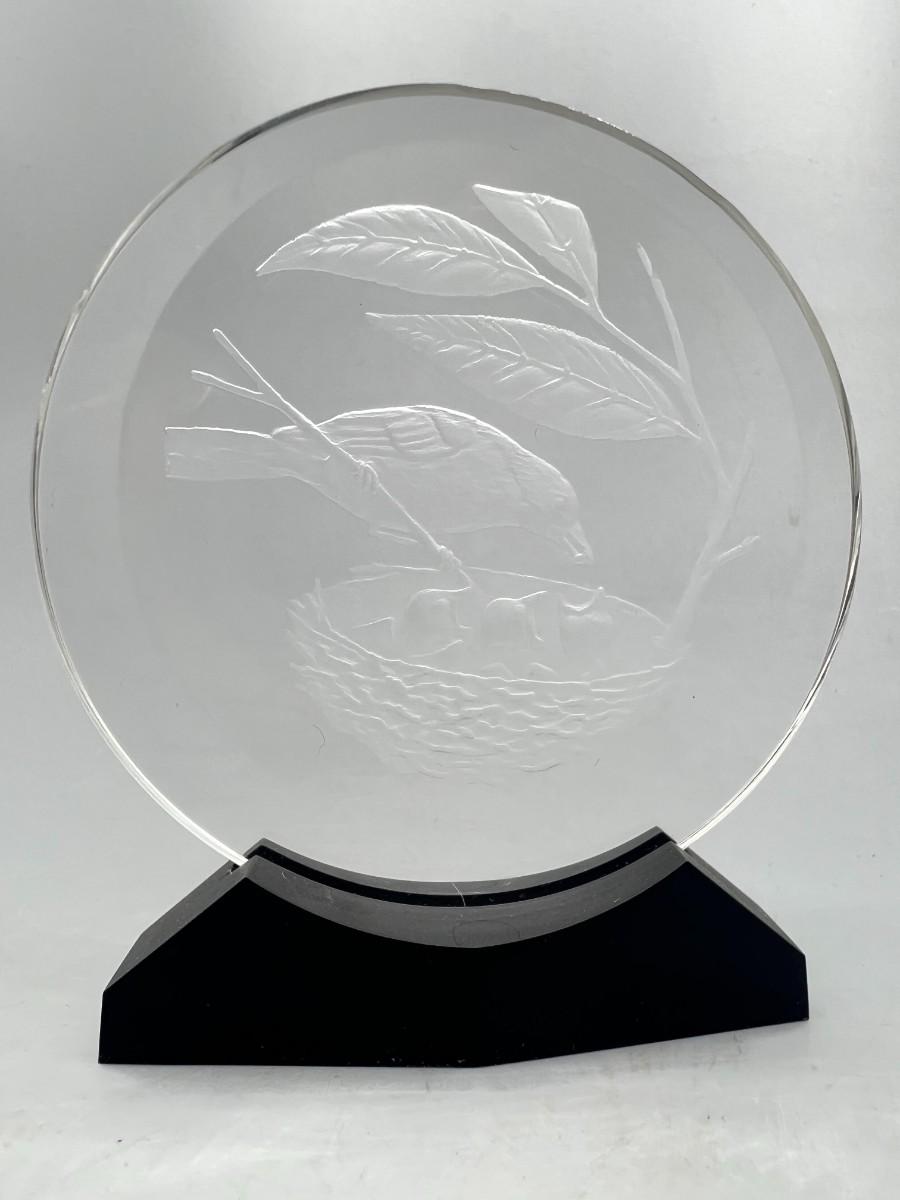 Vintage Etched Glass Medallion Art Mother Bird Feeding Babies in Nest. Comes with display stand. In good condition. Small, about 4" total height with stand.