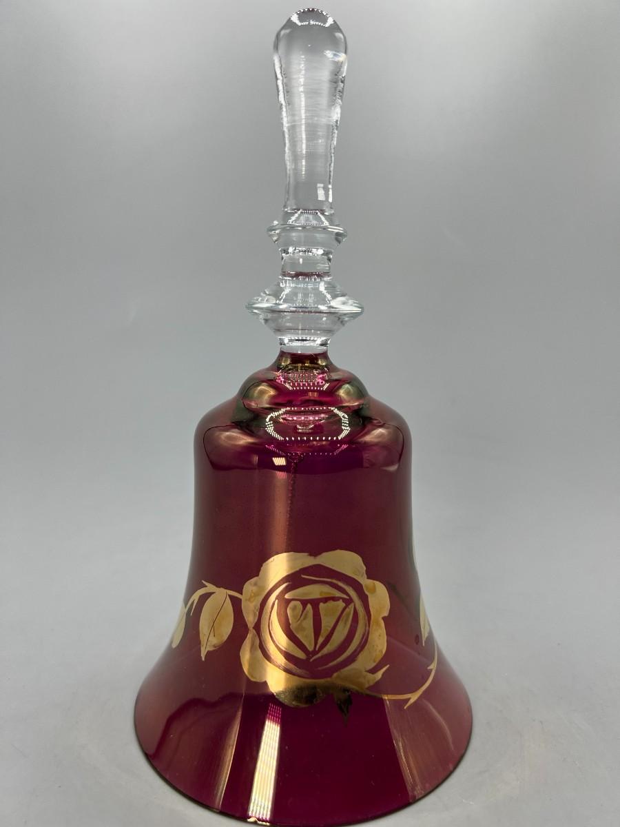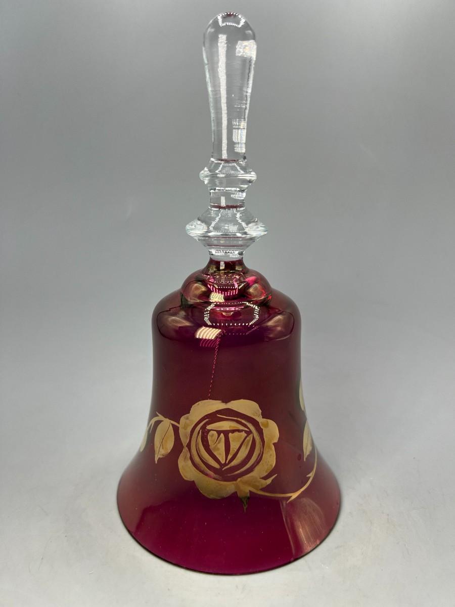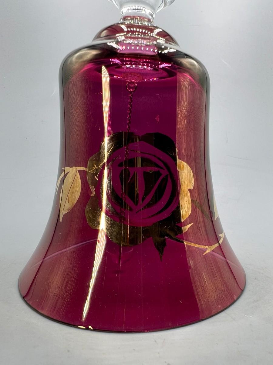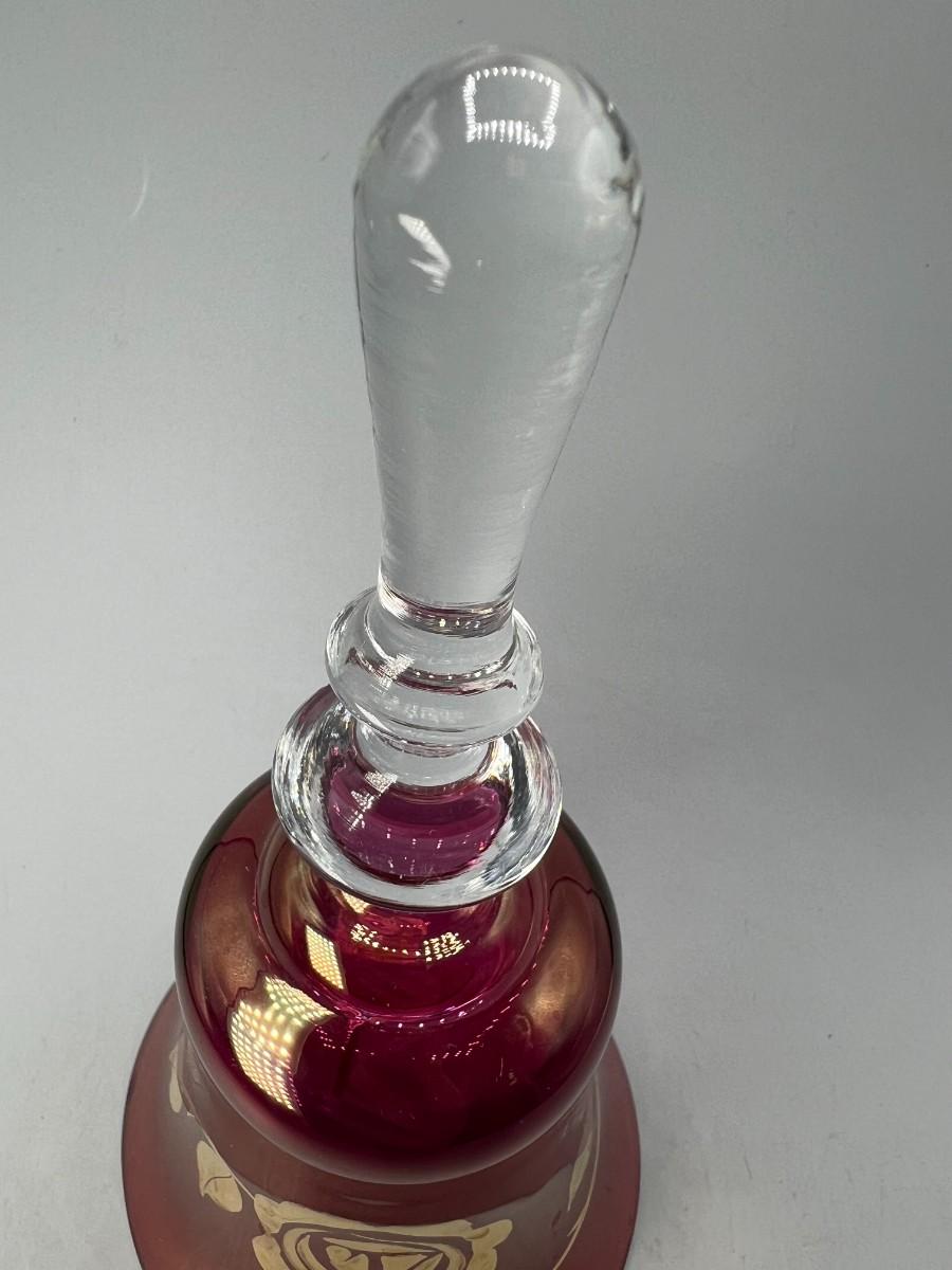Vintage Cranberry and Clear Glass Bell with Gold Gilt Flower Rose Pattern