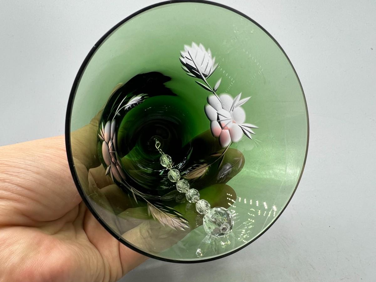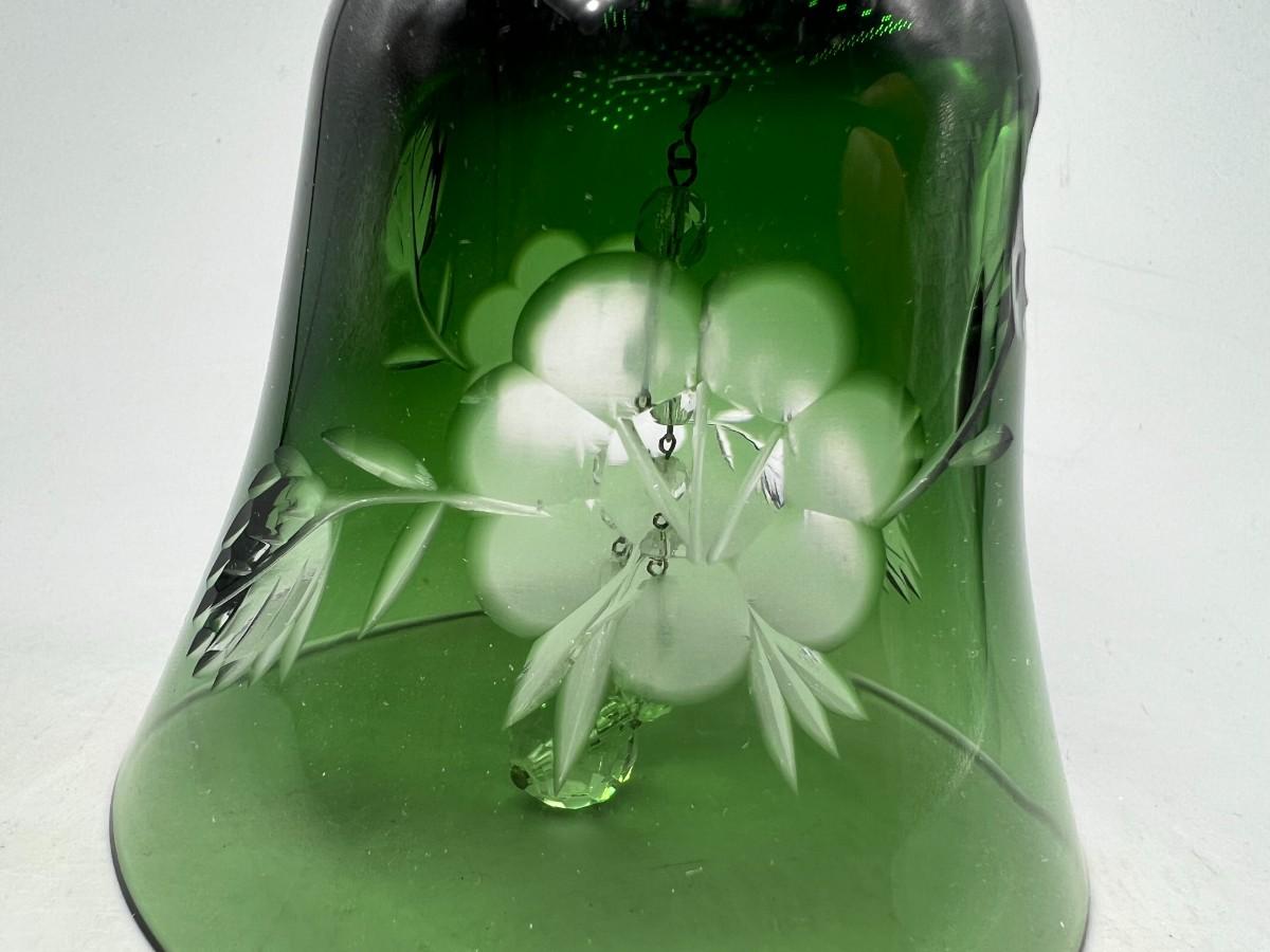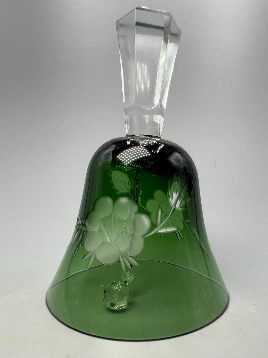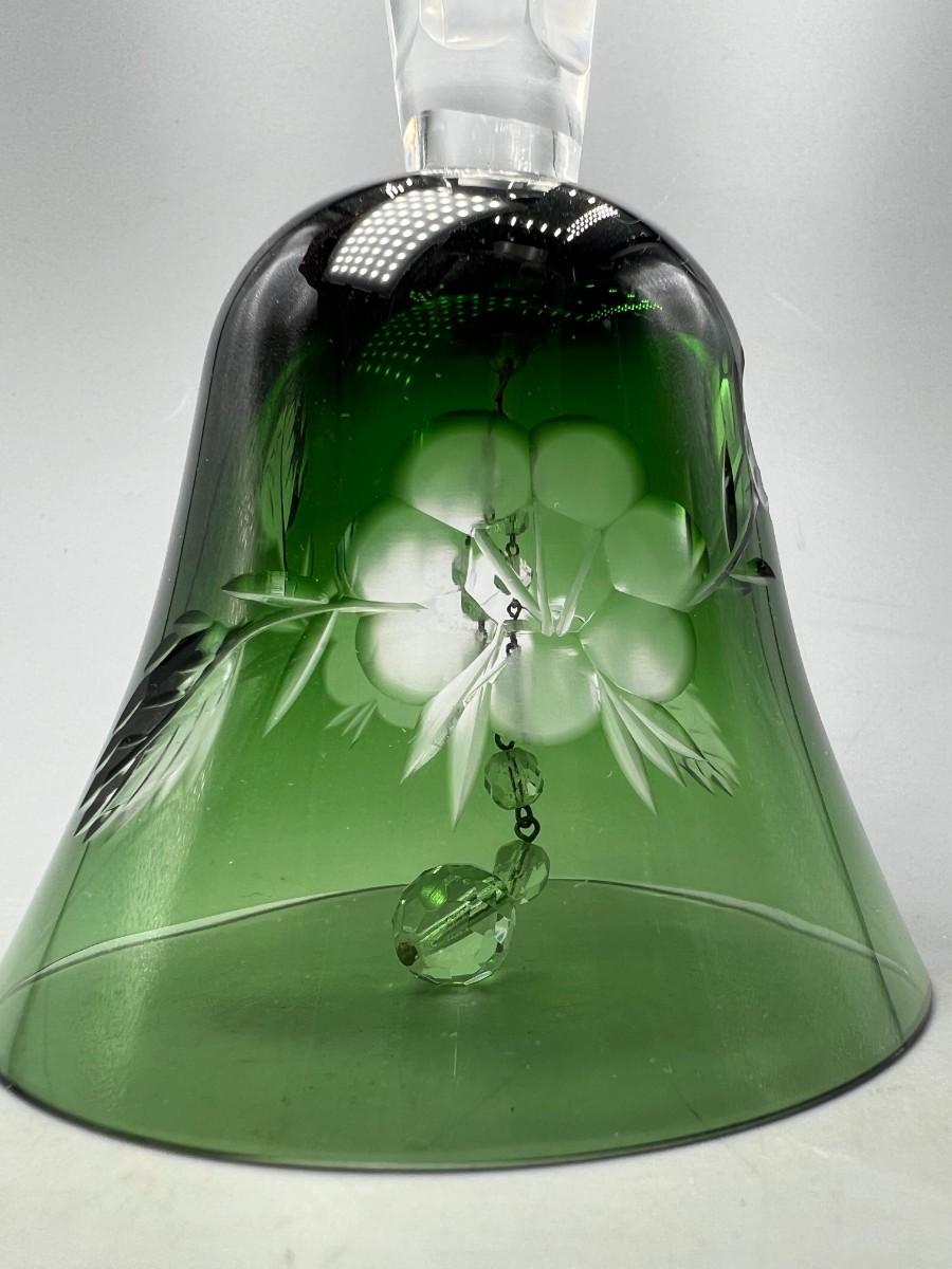 Vintage Emerald Green Cut to Clear Glass Crystal Bell Flower Pattern Etched