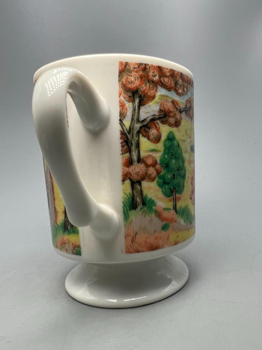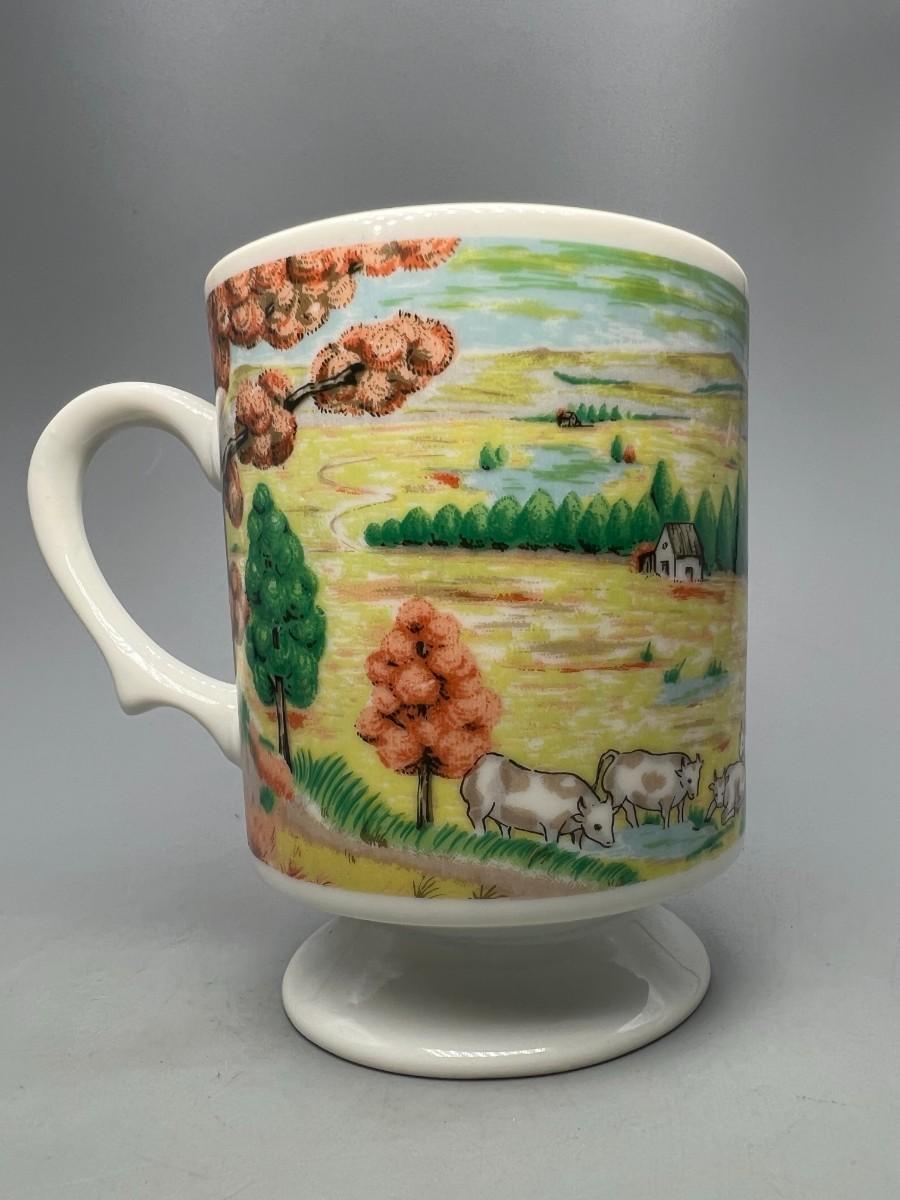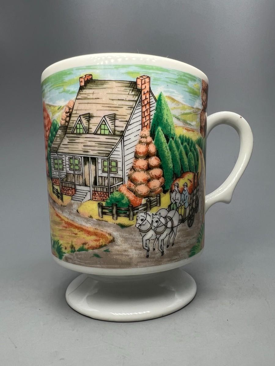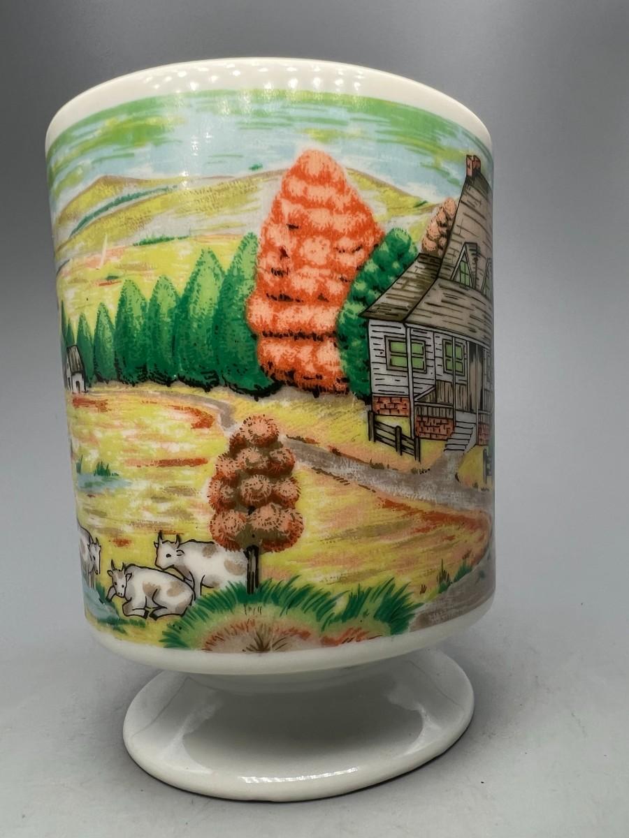 Vintage Stylecraft Japan 1236 Ceramic Porcelain Pedestal Coffee Cup Farmhouse Scene Pattern