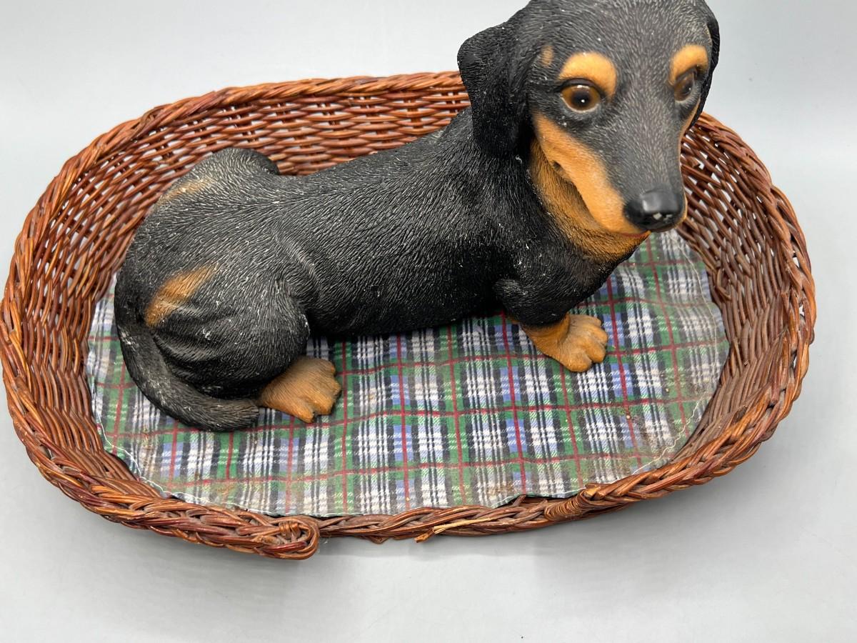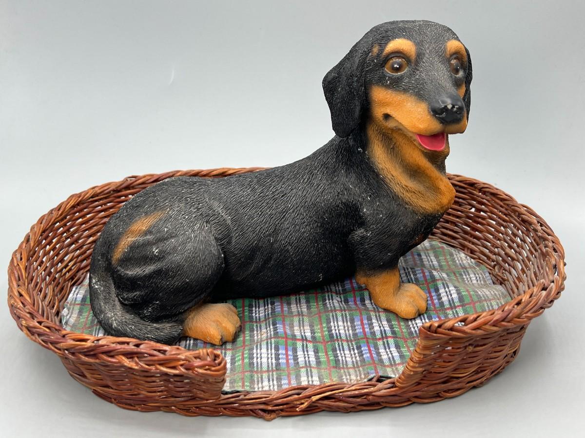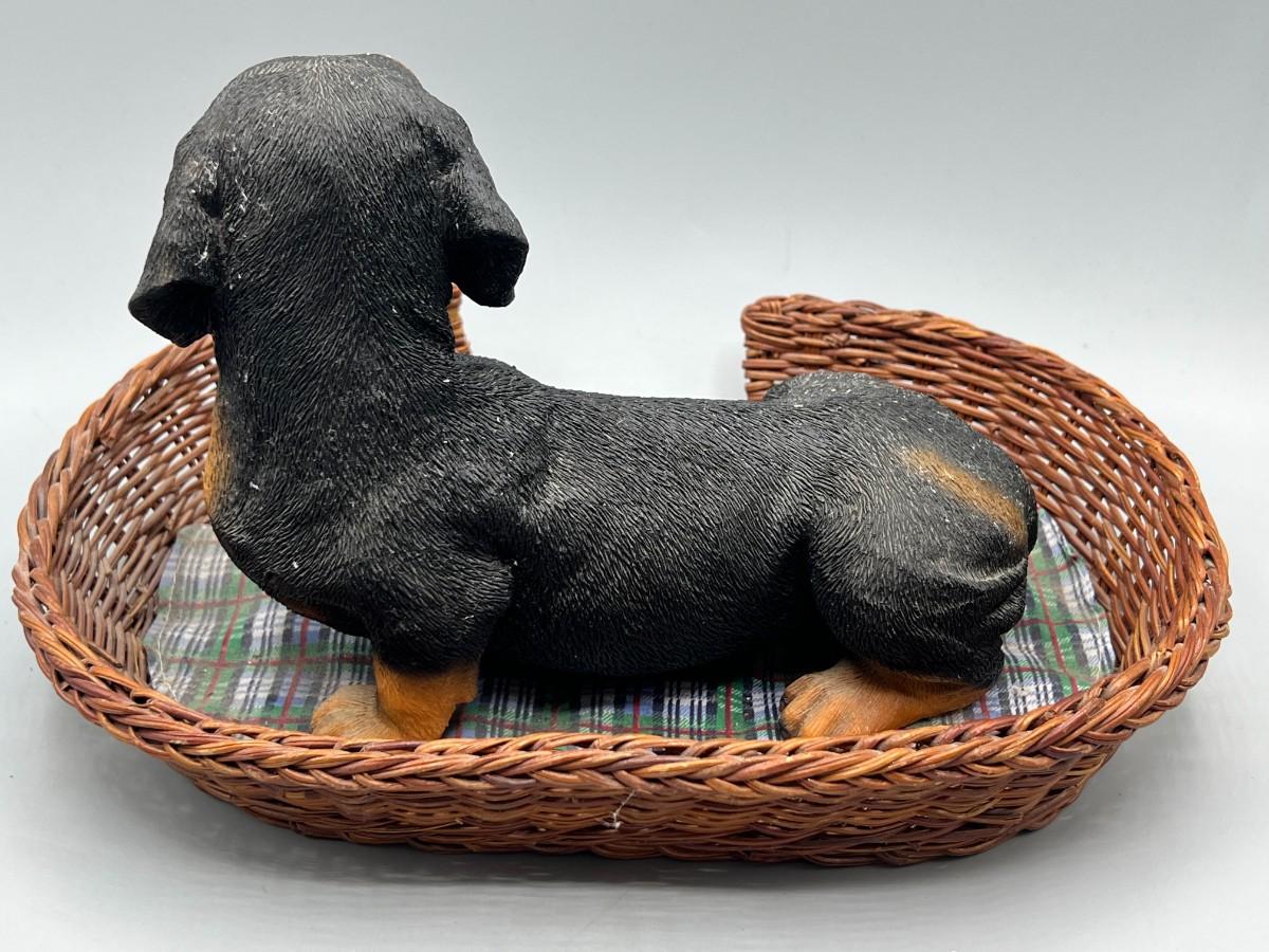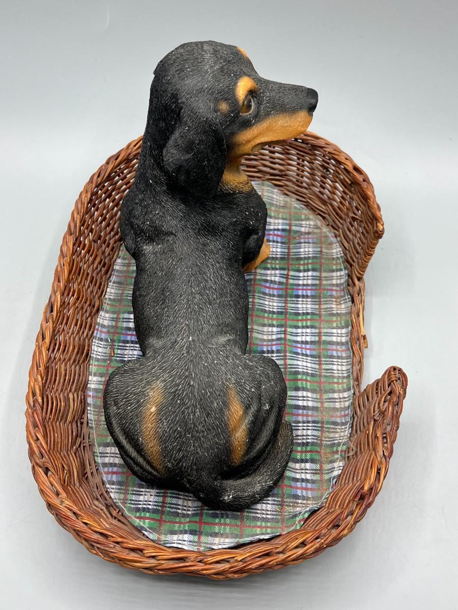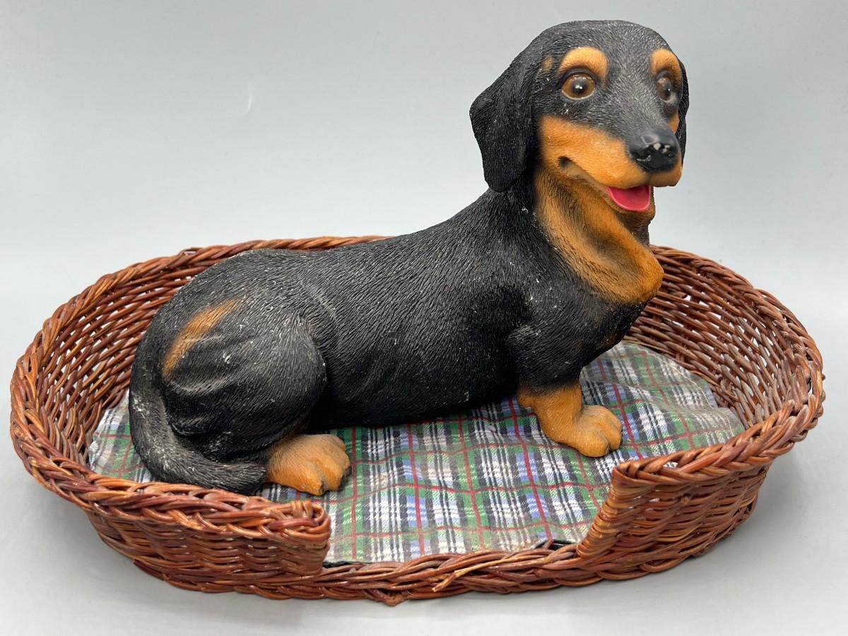 Cute Black and Tan Dachshund Dog Figurine with Basket Bed