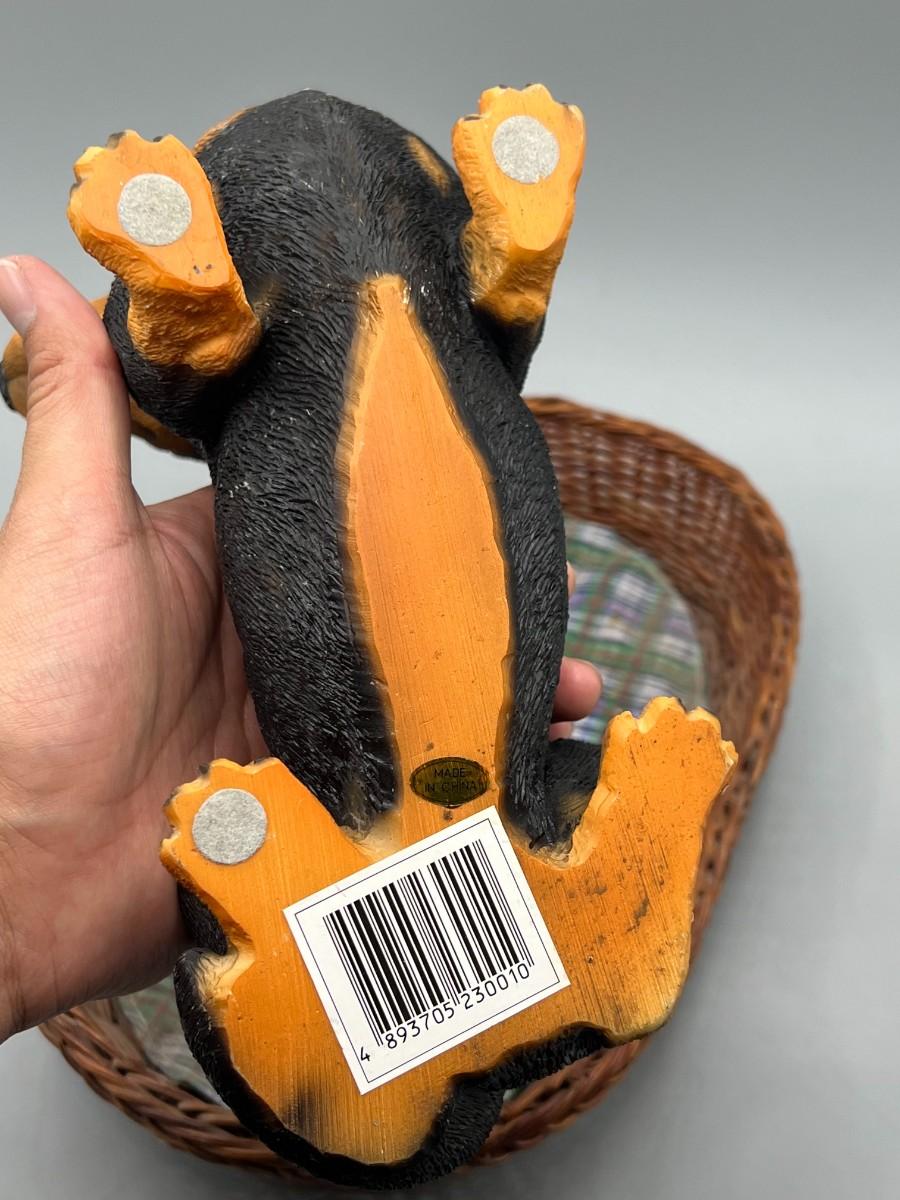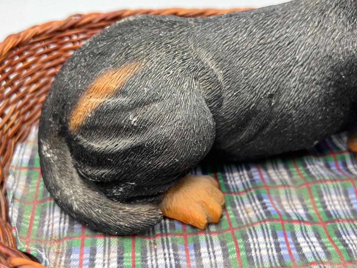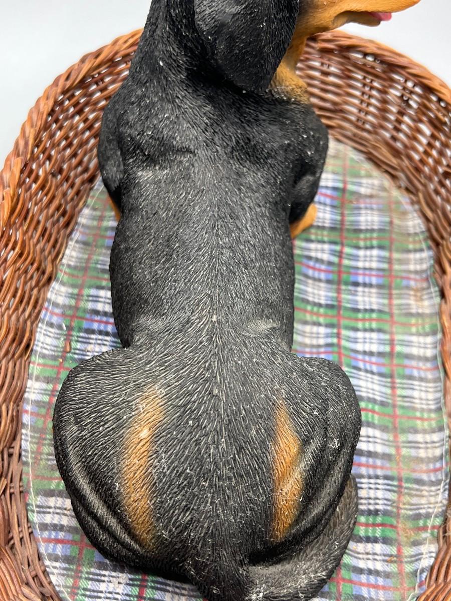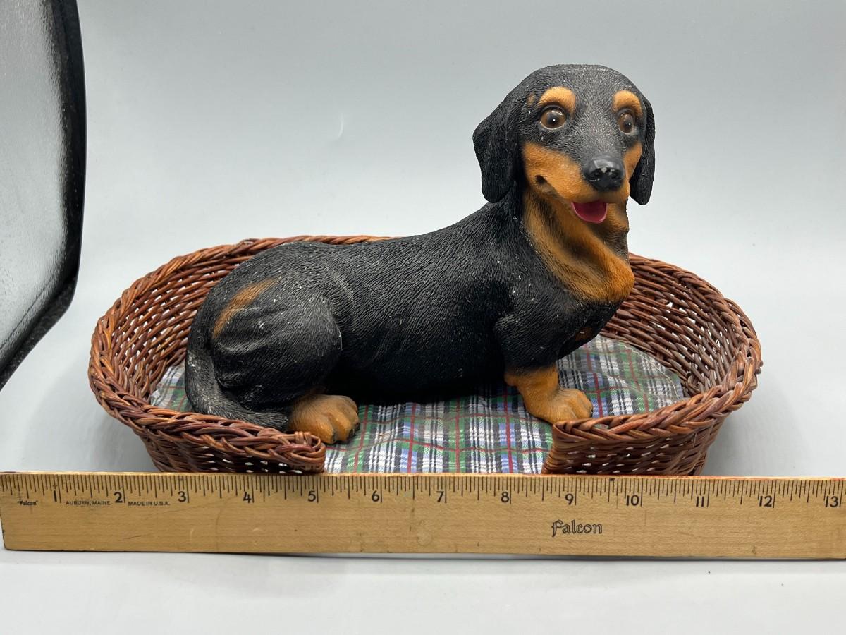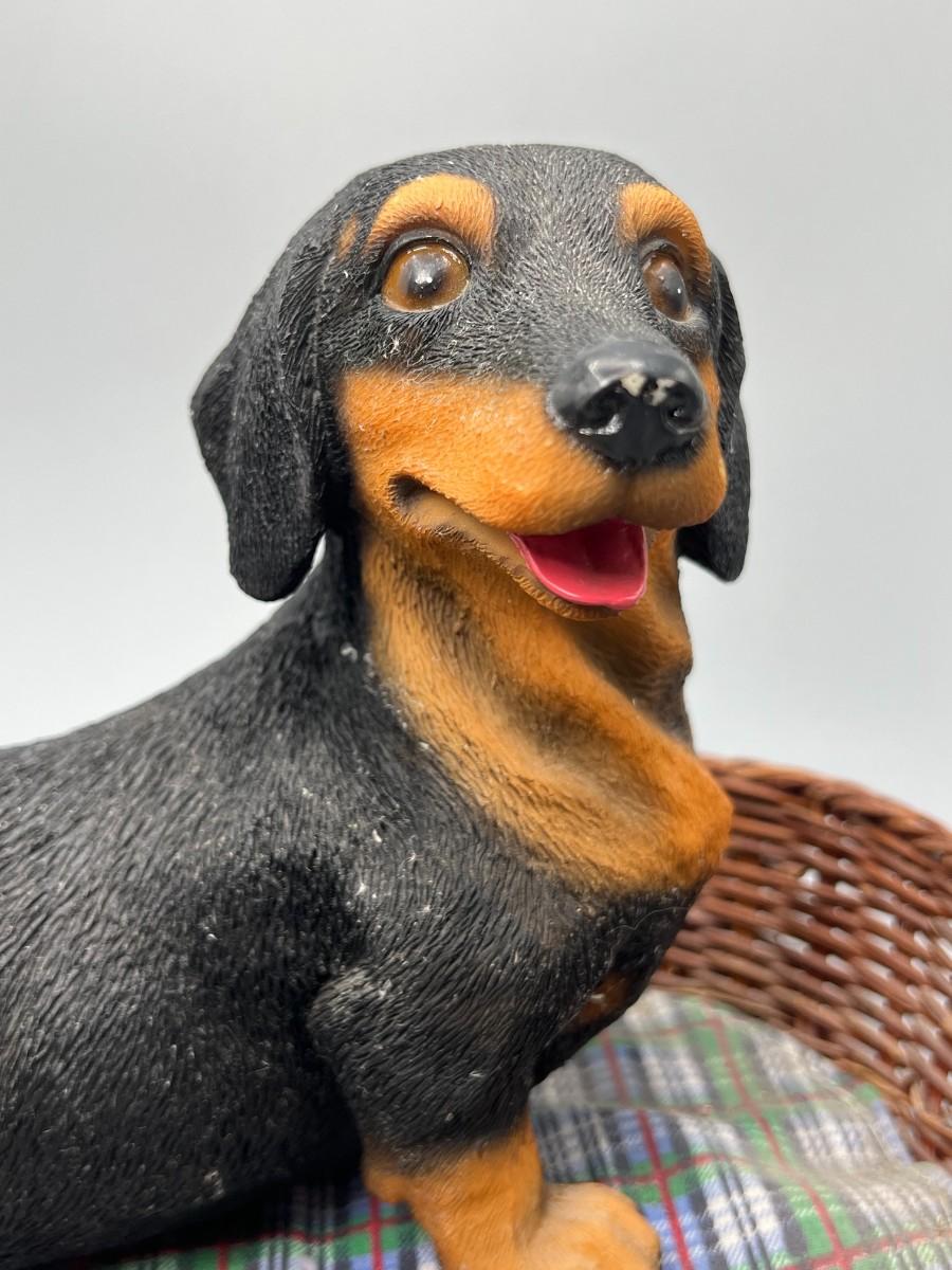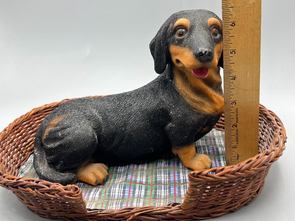 Cute Black and Tan Dachshund Dog Figurine with Basket Bed