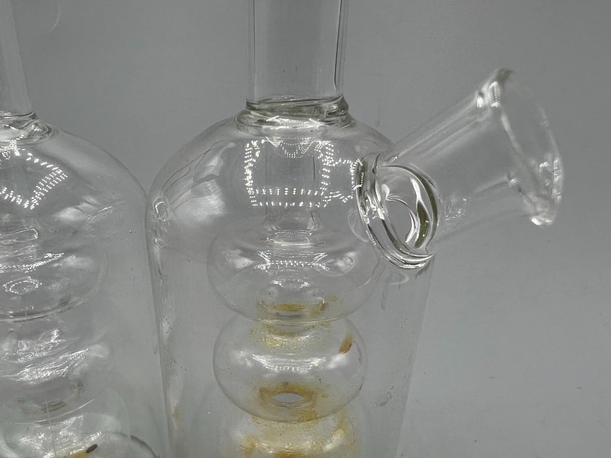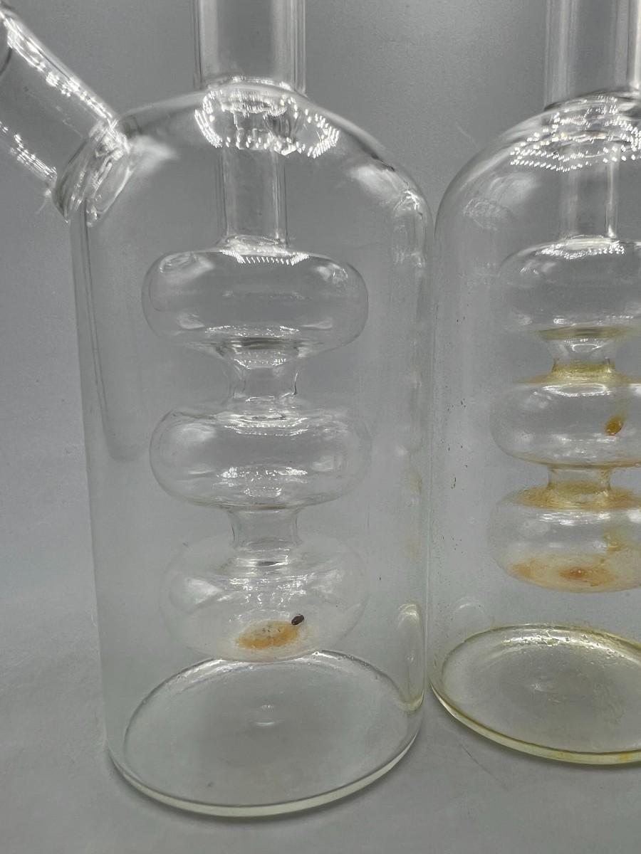 Vintage Pair of Oil & Vinegar in One Decanter Cruet Bottles. In good used condition. Some leftover residues inside.