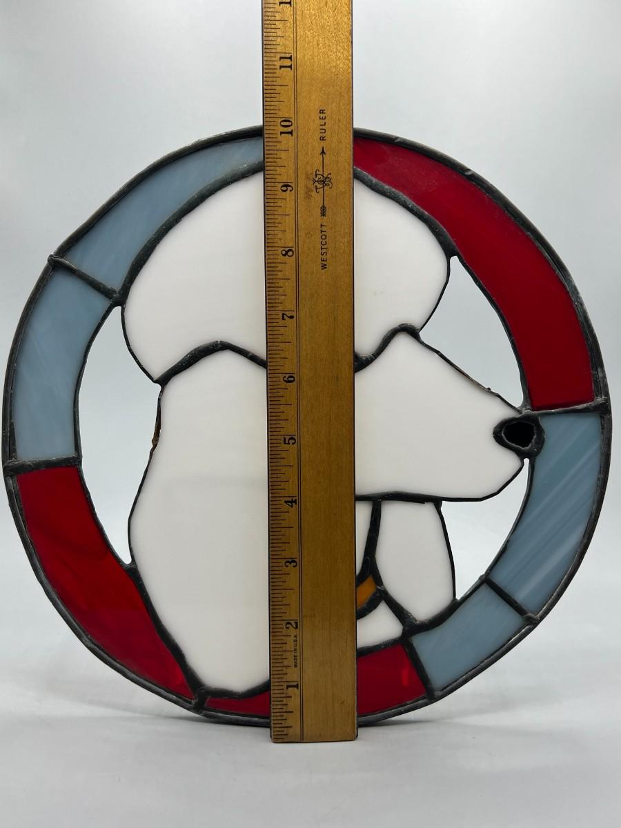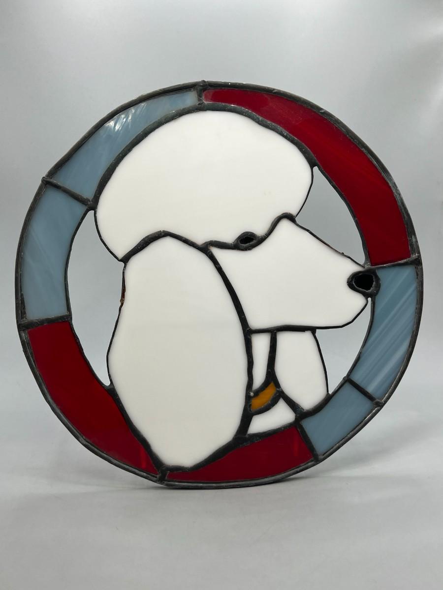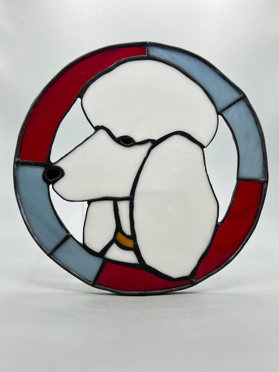 Round Stained Glass Art Suncatcher Red, Blue, White Poodle