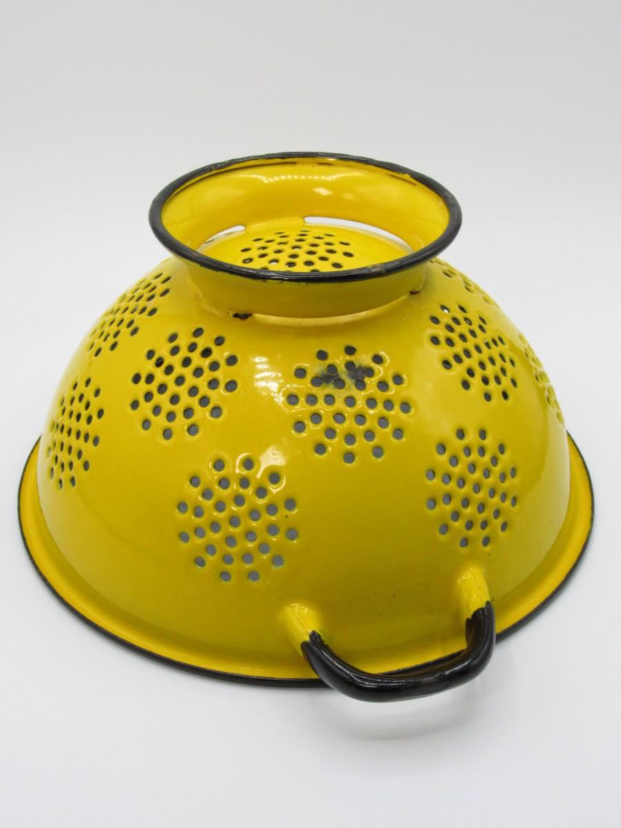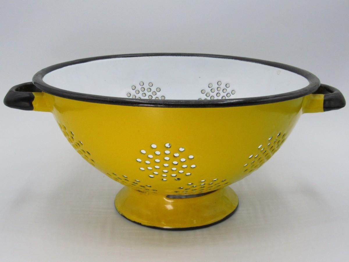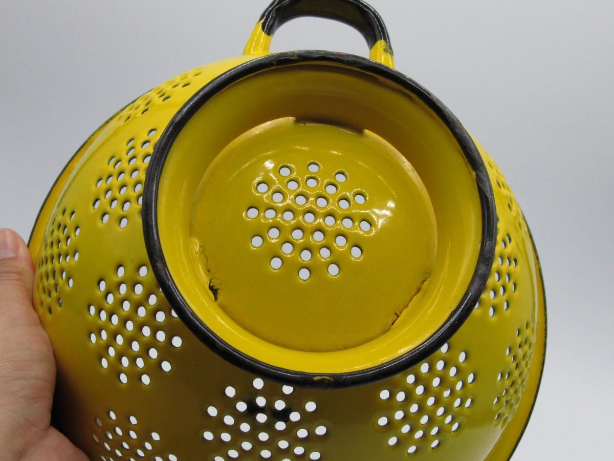 Vintage Enamel Art Deco Lemon Yellow & White Straining Colander Kitchenware