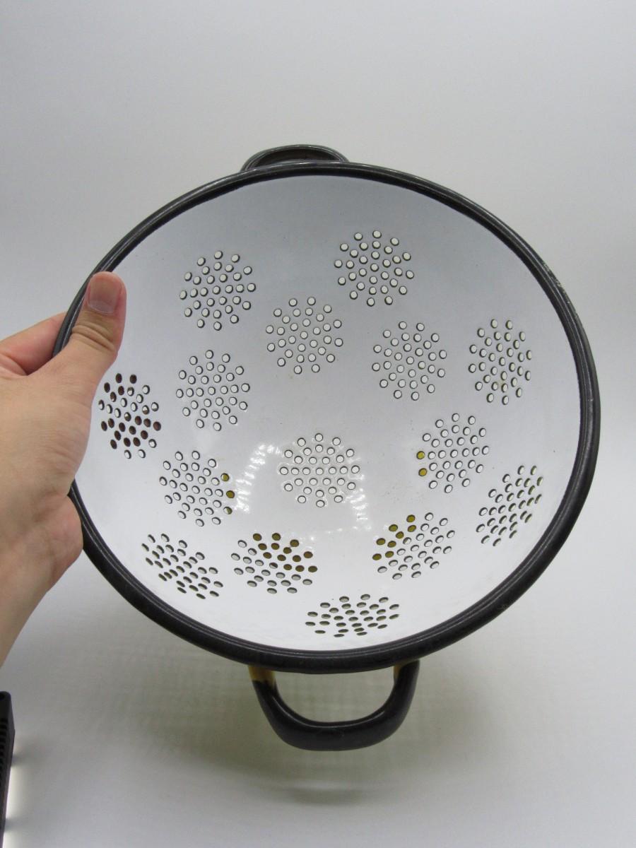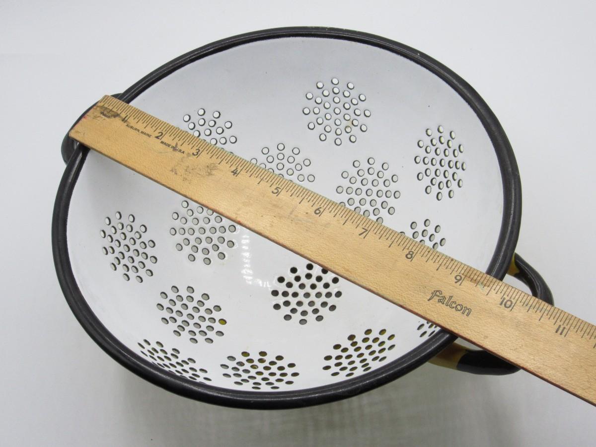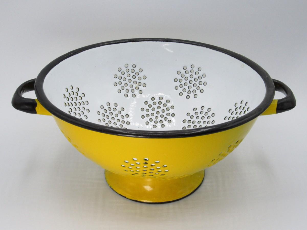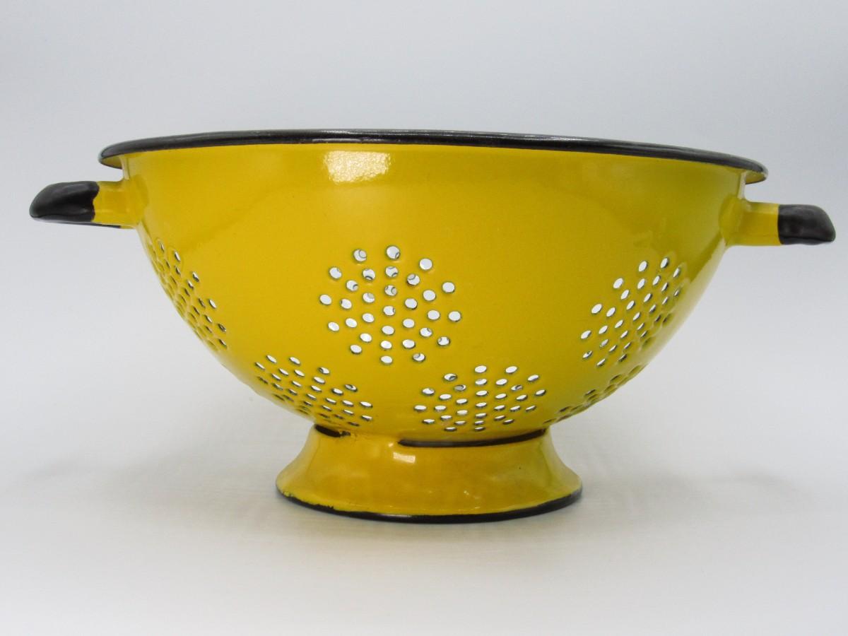 Vintage Enamel Art Deco Lemon Yellow & White Straining Colander Kitchenware
