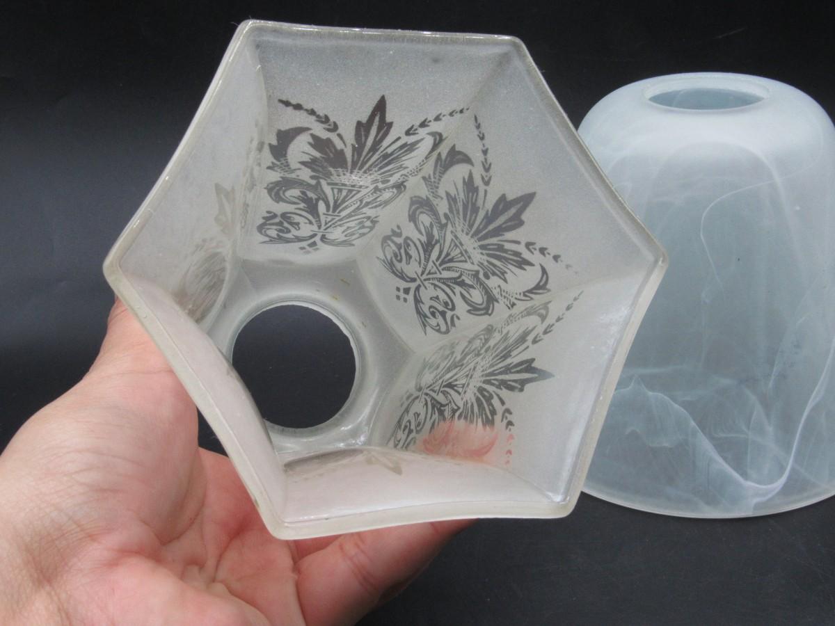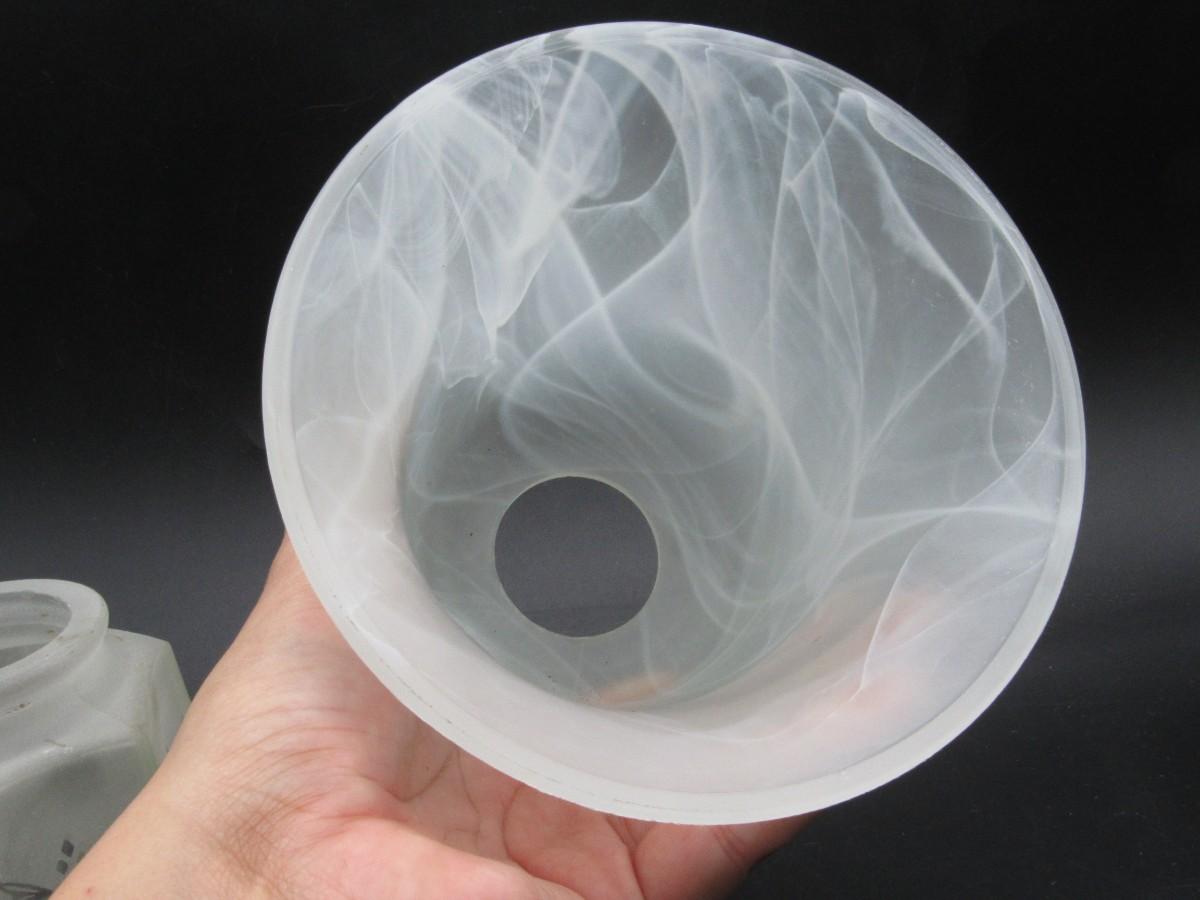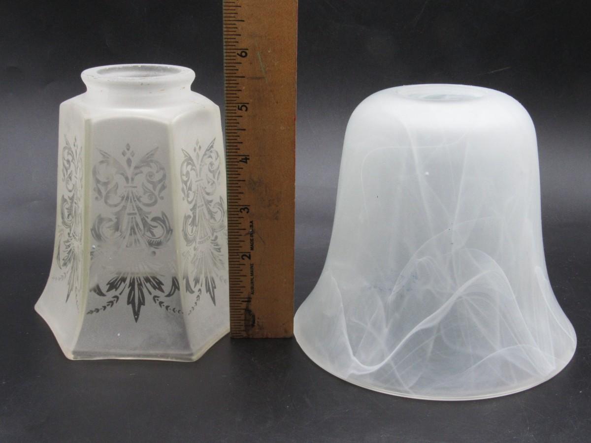 There is no damage to the glass lampshades and is in overall good collectible or useable condition. Check pictures for more details and sizing.