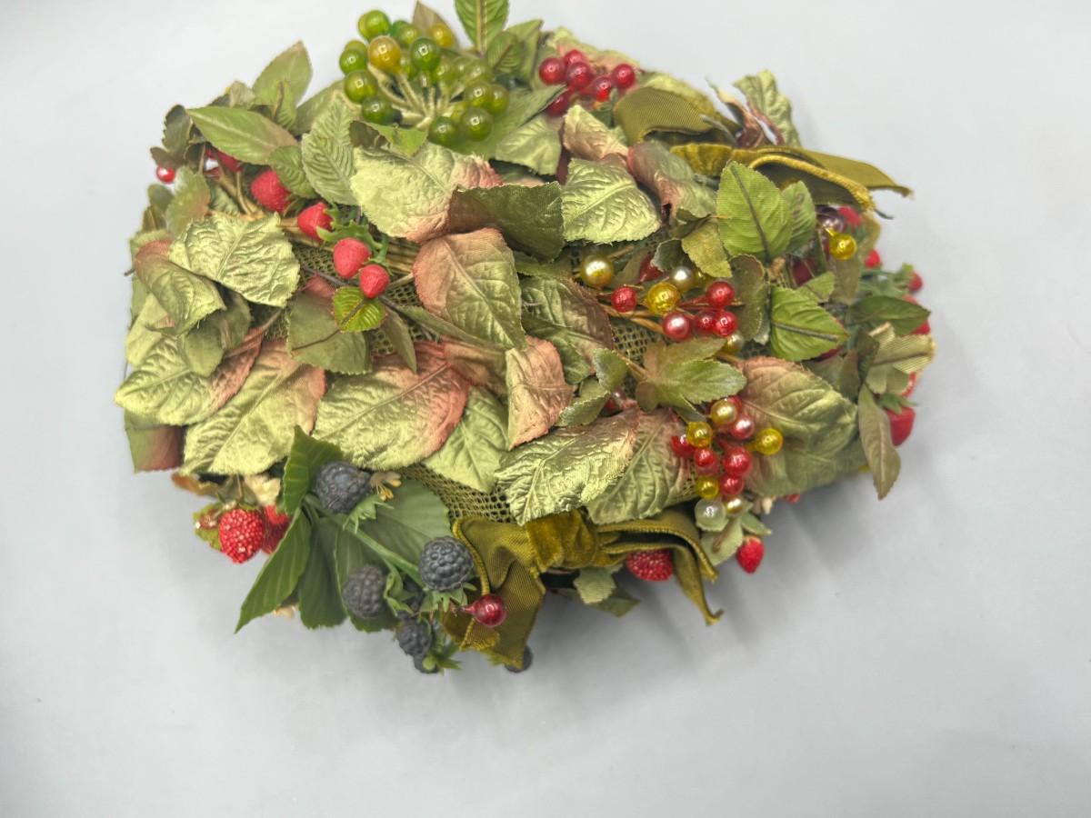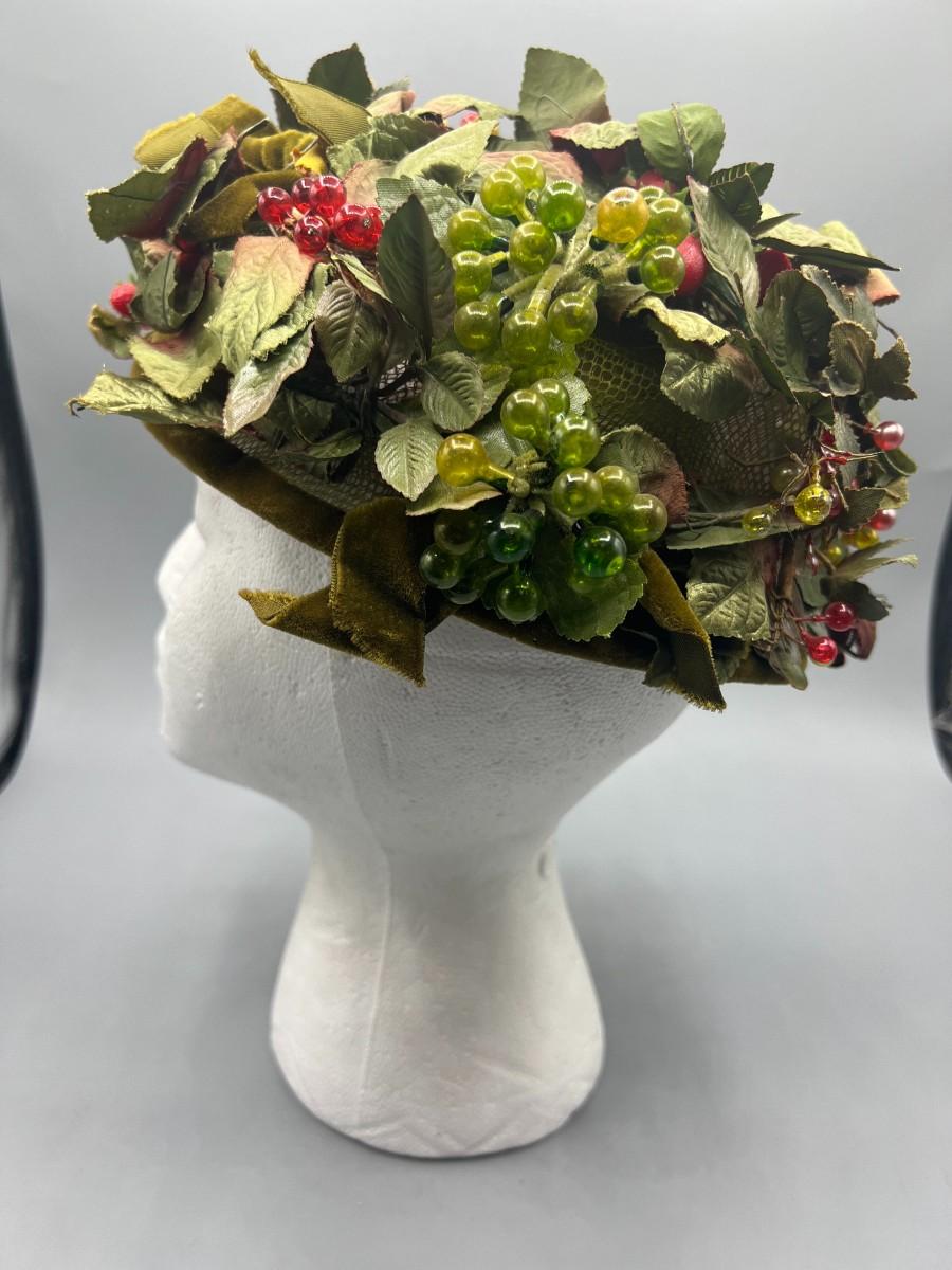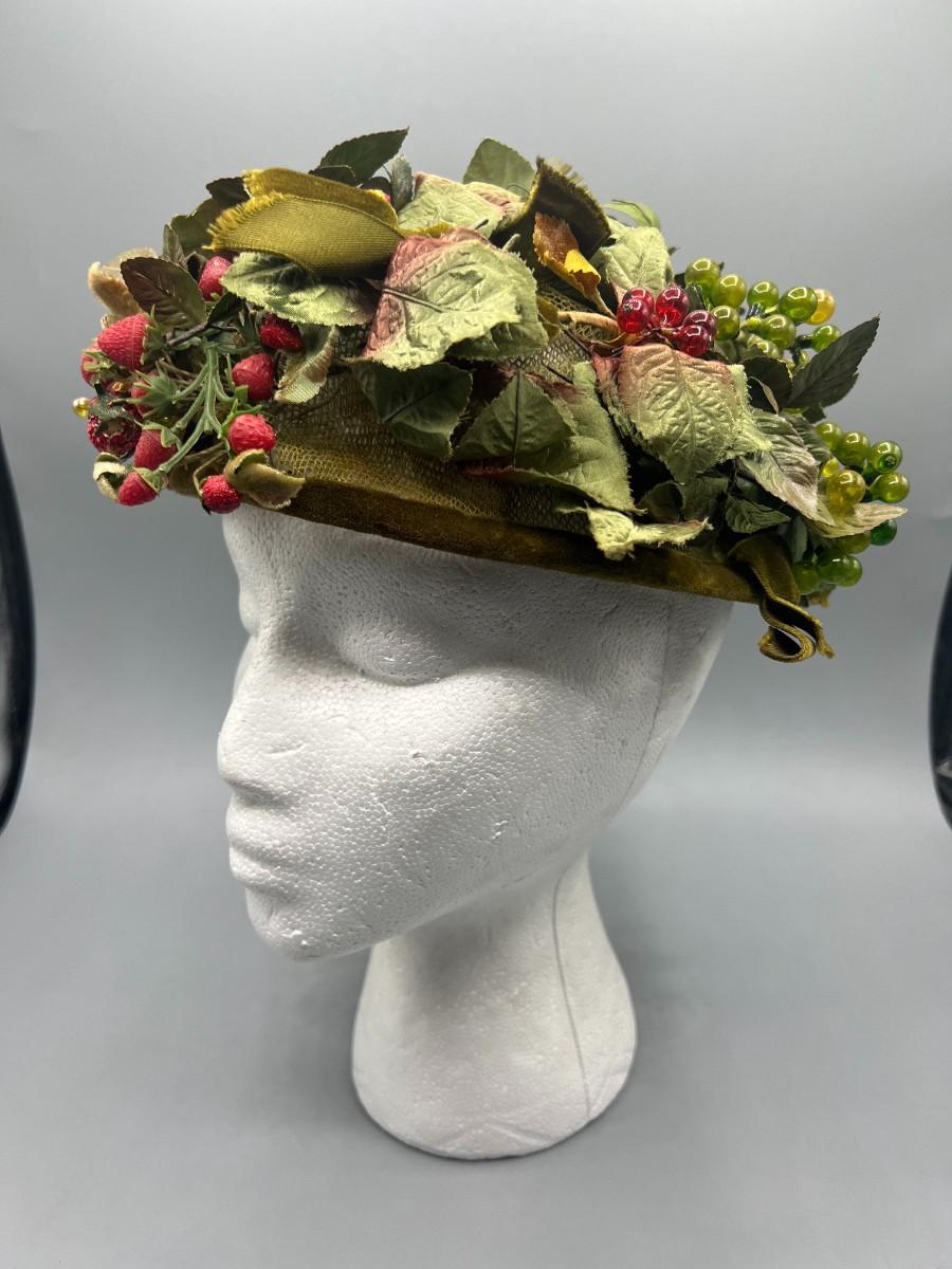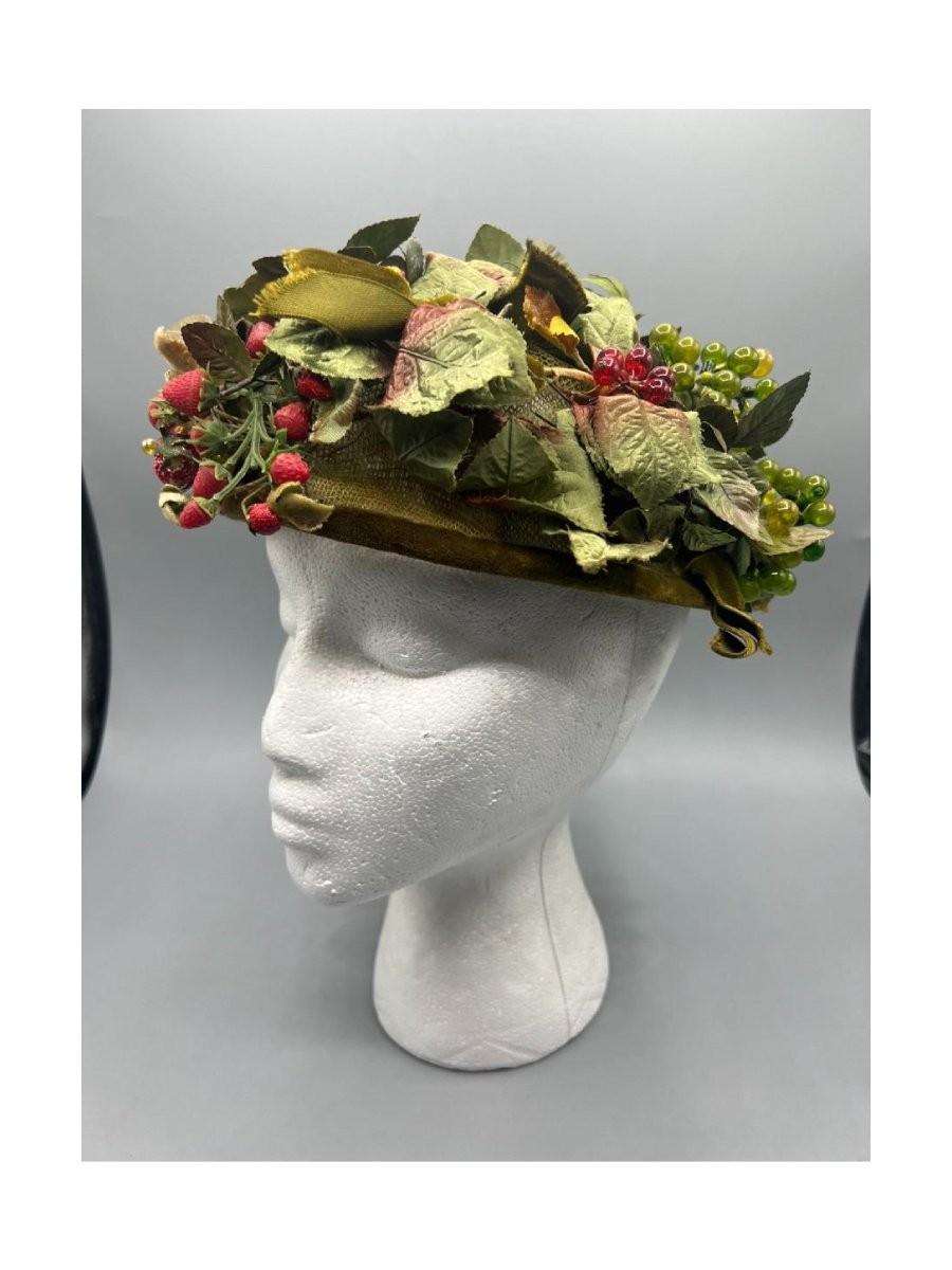 Antique Faux Foliage Berries Leaves Fashionable Hollywood Regency Hat Cap with Hat Box