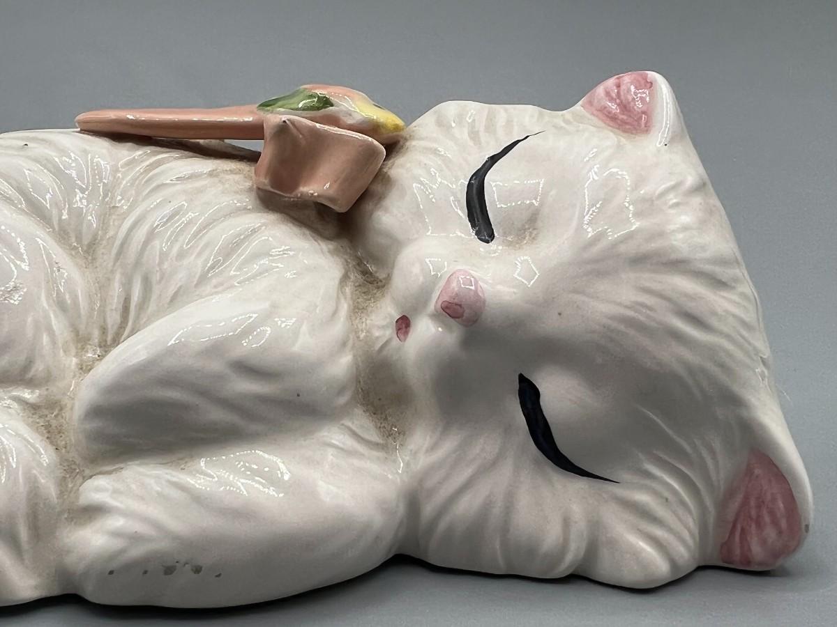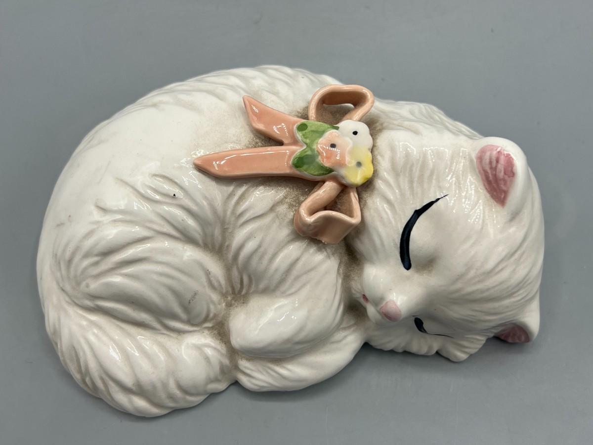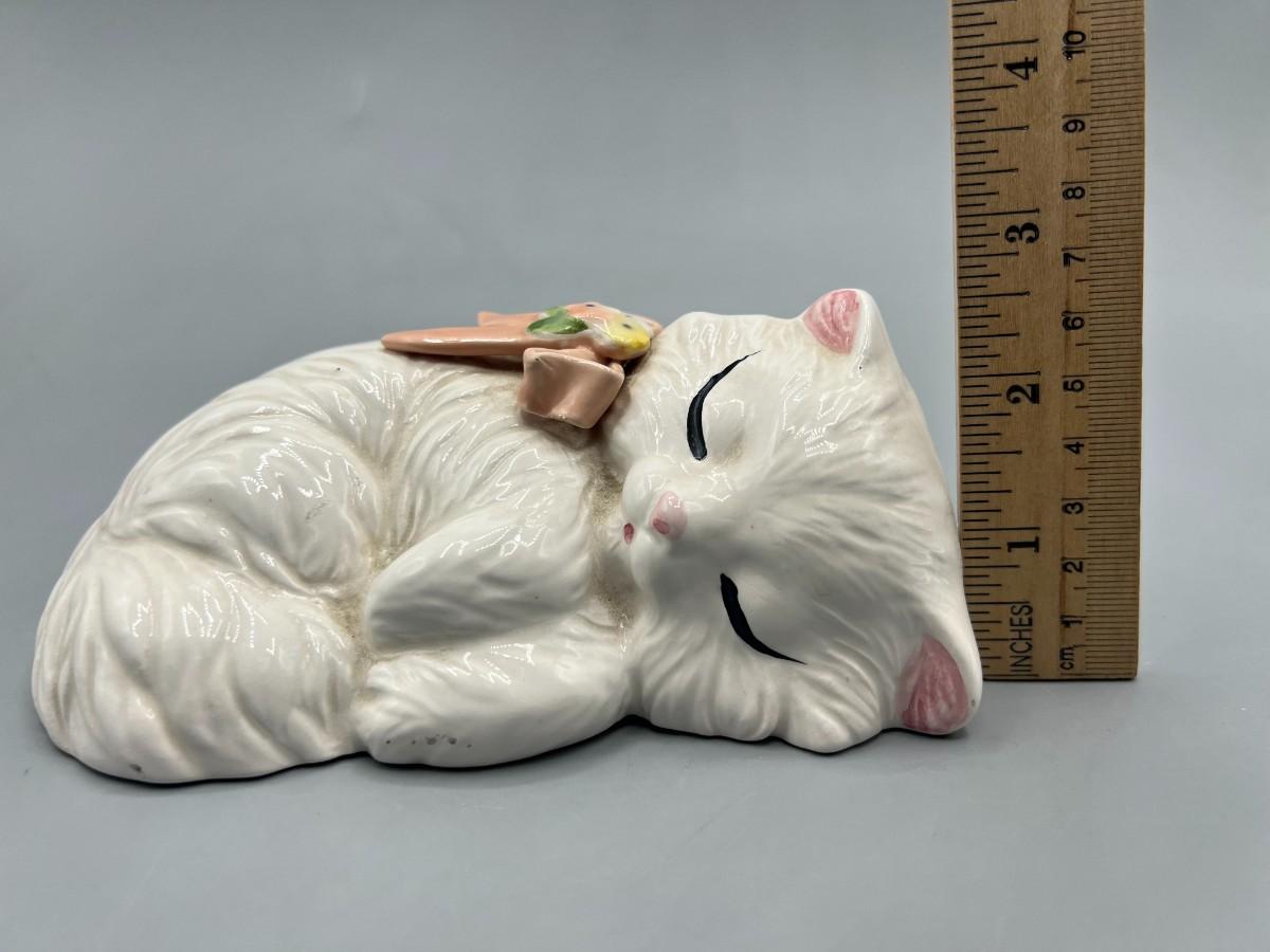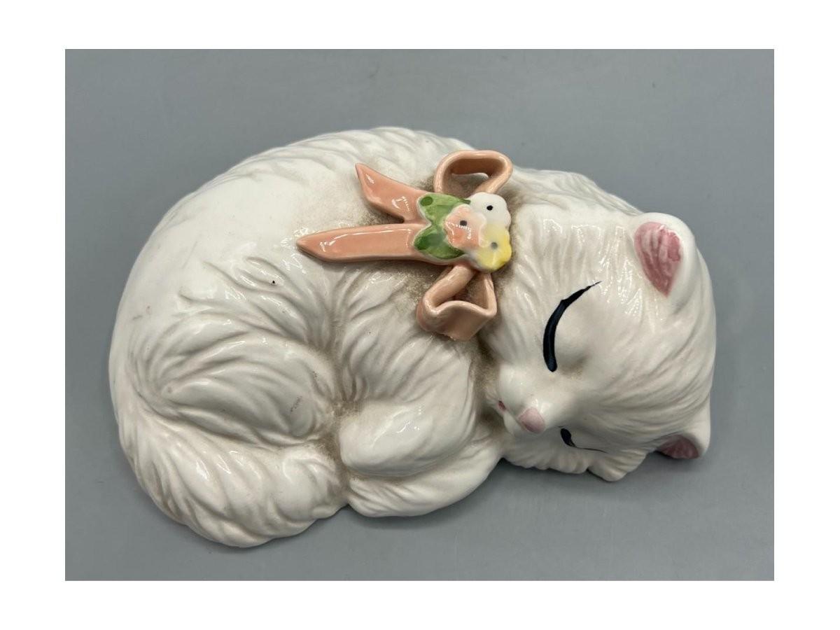 Vintage Artistic Gifts Buena Park White Ceramic Sleeping Cat with Pink Bow Figurine
