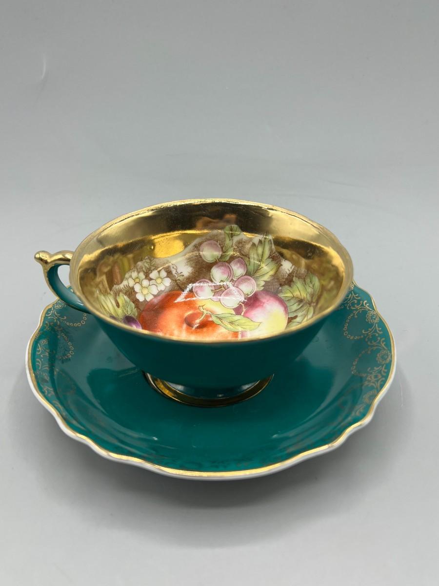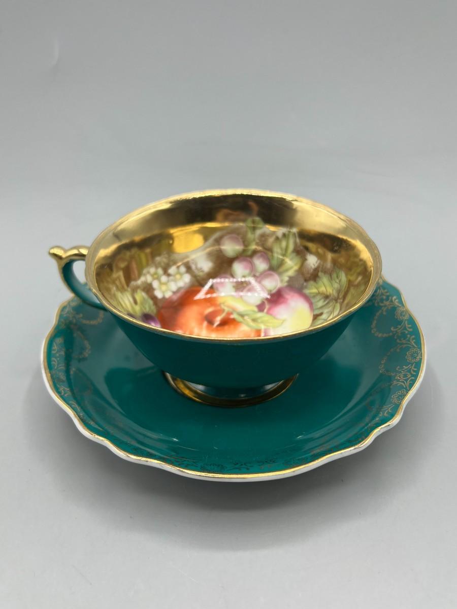 Vintage Teal Gold Victorian Style Fruit Still Life Handpainted Made in Japan Teacup & Saucer