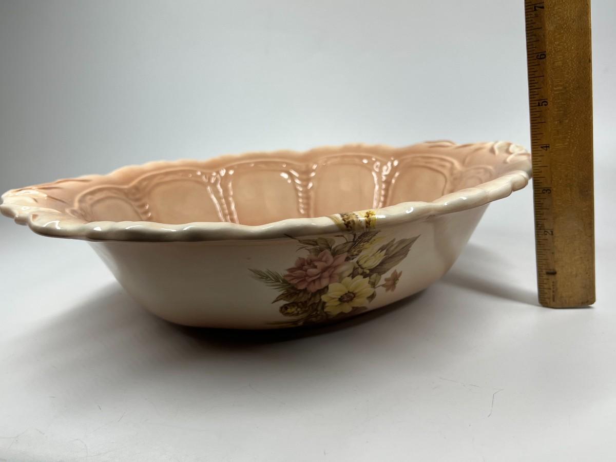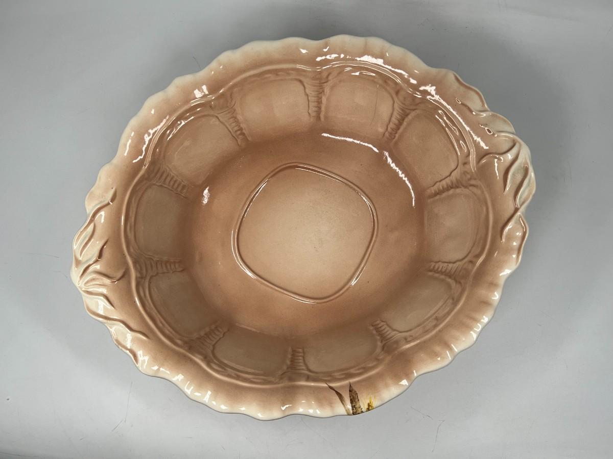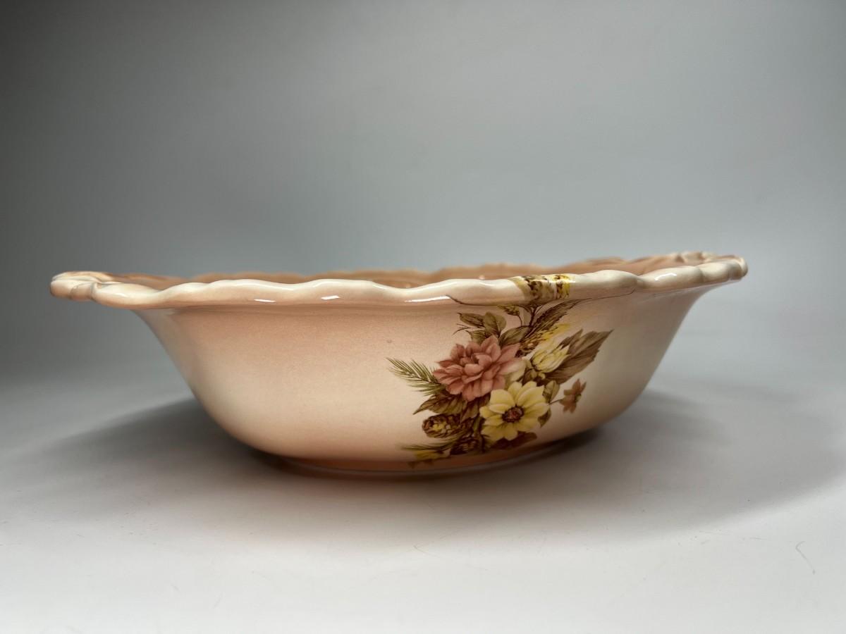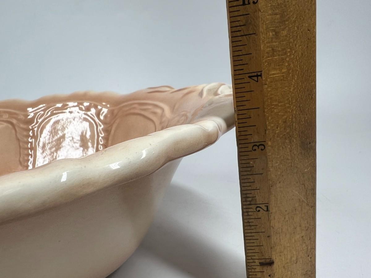 Vintage Dusty Pink Blush Ceramic Basin Console Bowl with Flower Pattern Accent. In vintage condition. Looks like a wash basin bowl that would have had a matching pitcher at one time. Displays nicely. There is a fine line crack and crazing due to age. Made by Arnel's Pottery.