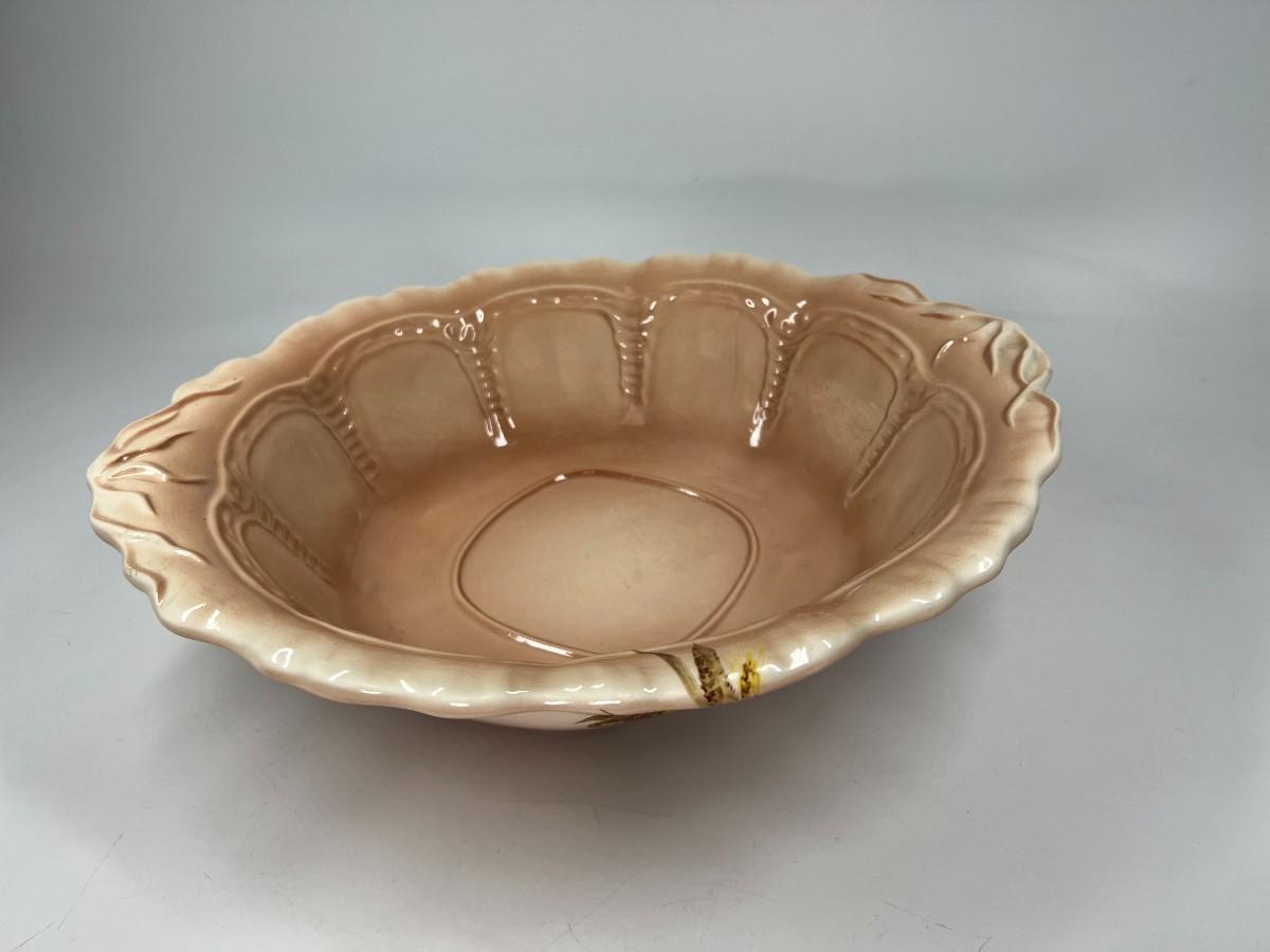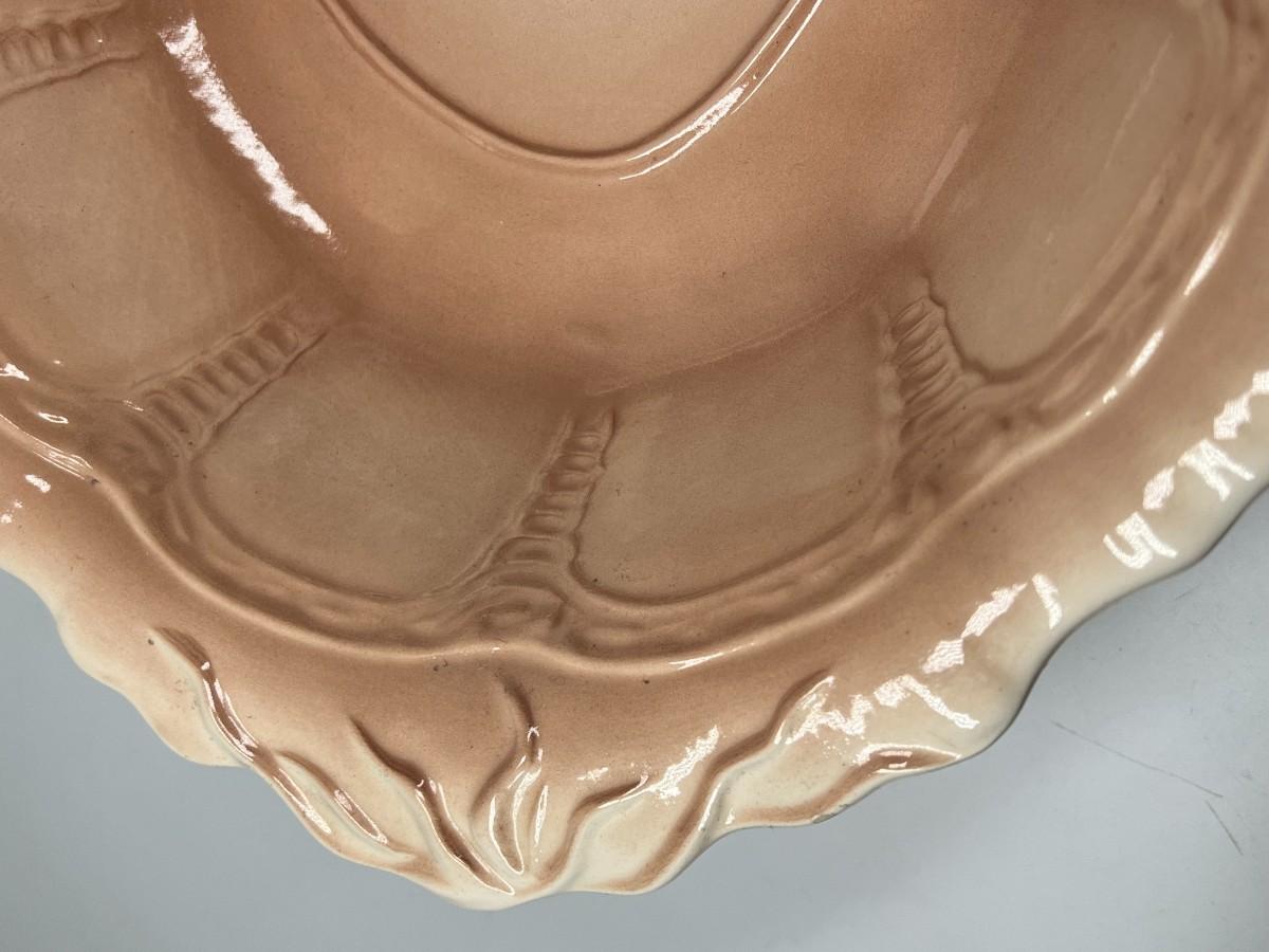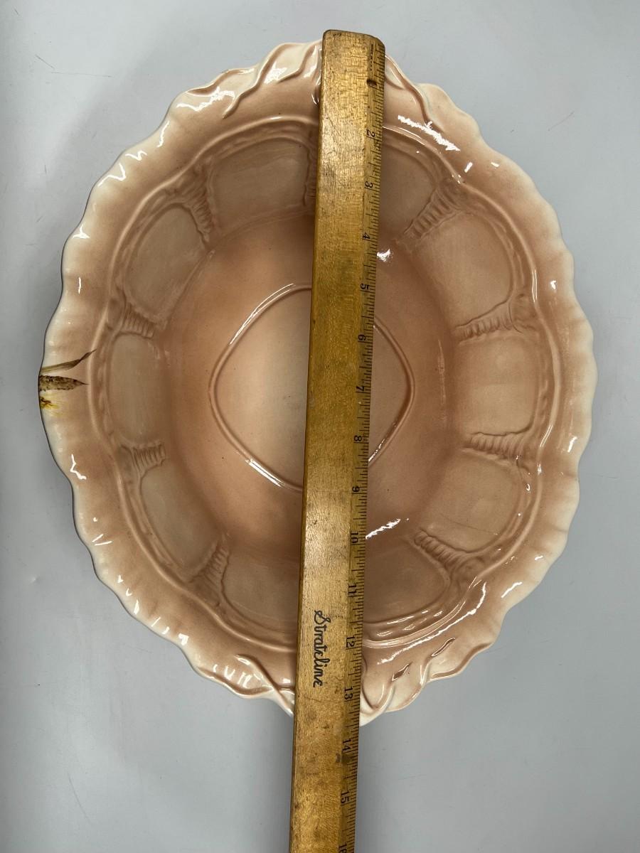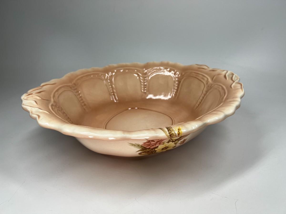 Vintage Dusty Pink Blush Ceramic Basin Console Bowl with Flower Pattern Accent. In vintage condition. Looks like a wash basin bowl that would have had a matching pitcher at one time. Displays nicely. There is a fine line crack and crazing due to age. Made by Arnel's Pottery.