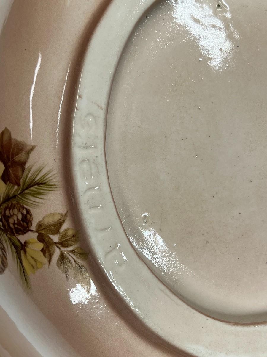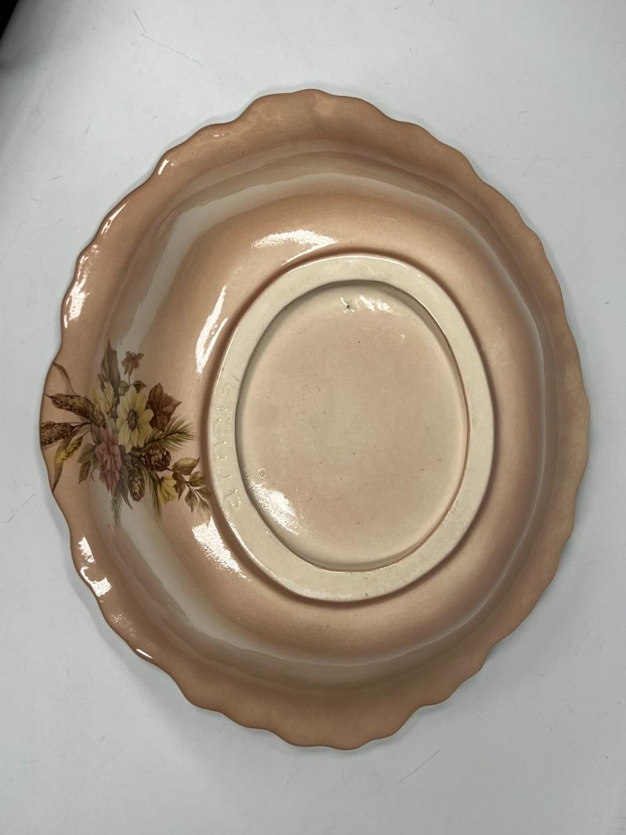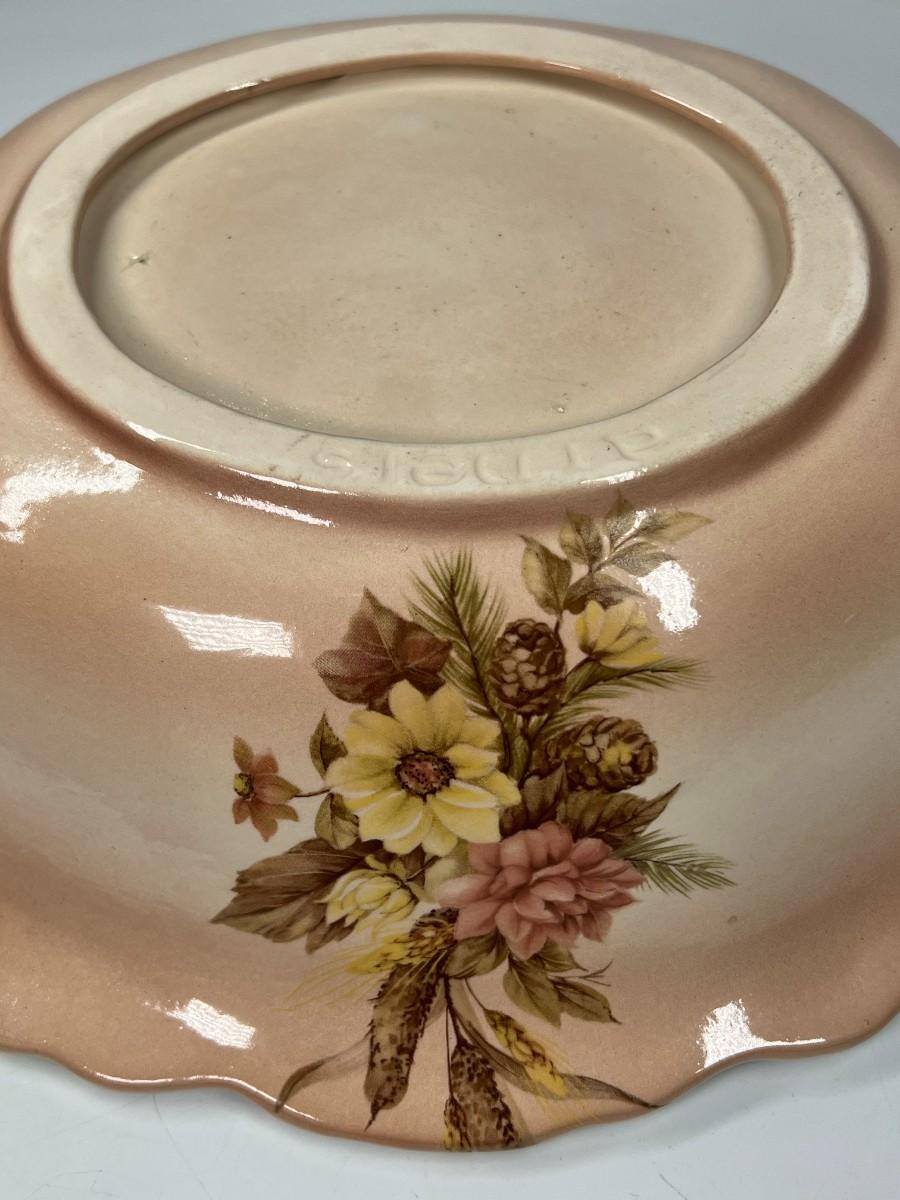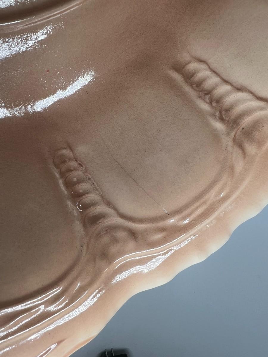 Vintage Dusty Pink Blush Ceramic Basin Console Bowl with Flower Pattern Accent. In vintage condition. Looks like a wash basin bowl that would have had a matching pitcher at one time. Displays nicely. There is a fine line crack and crazing due to age. Made by Arnel's Pottery.