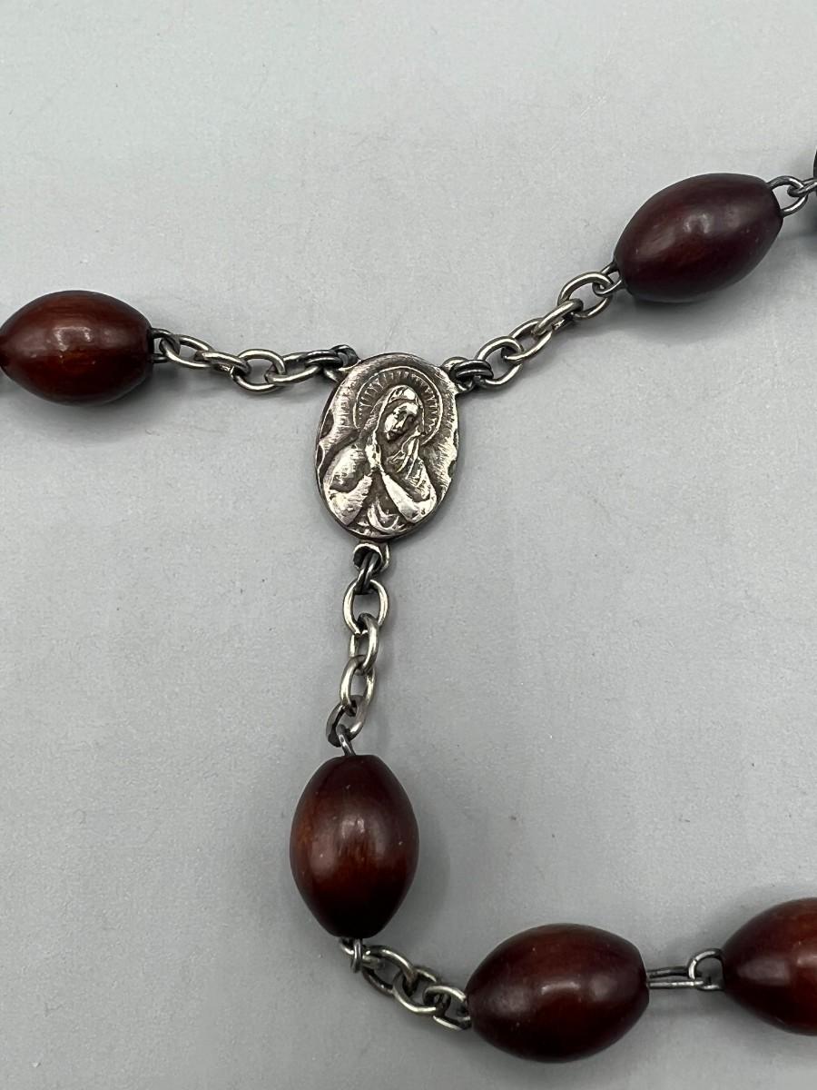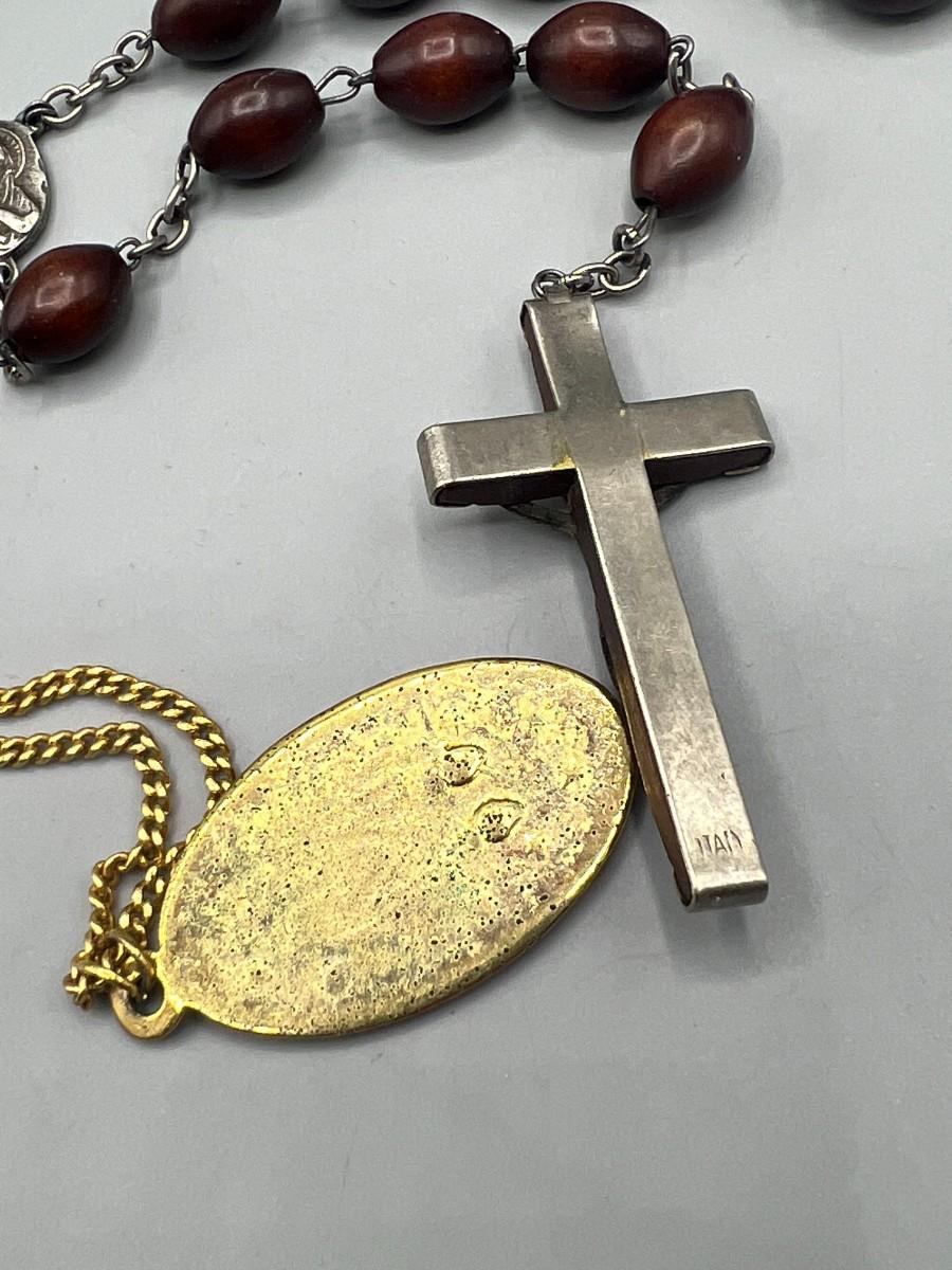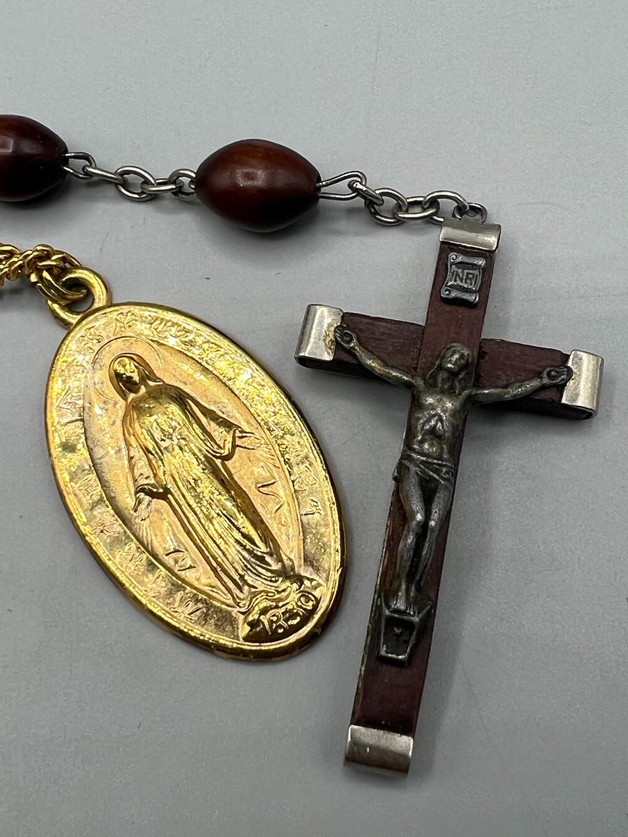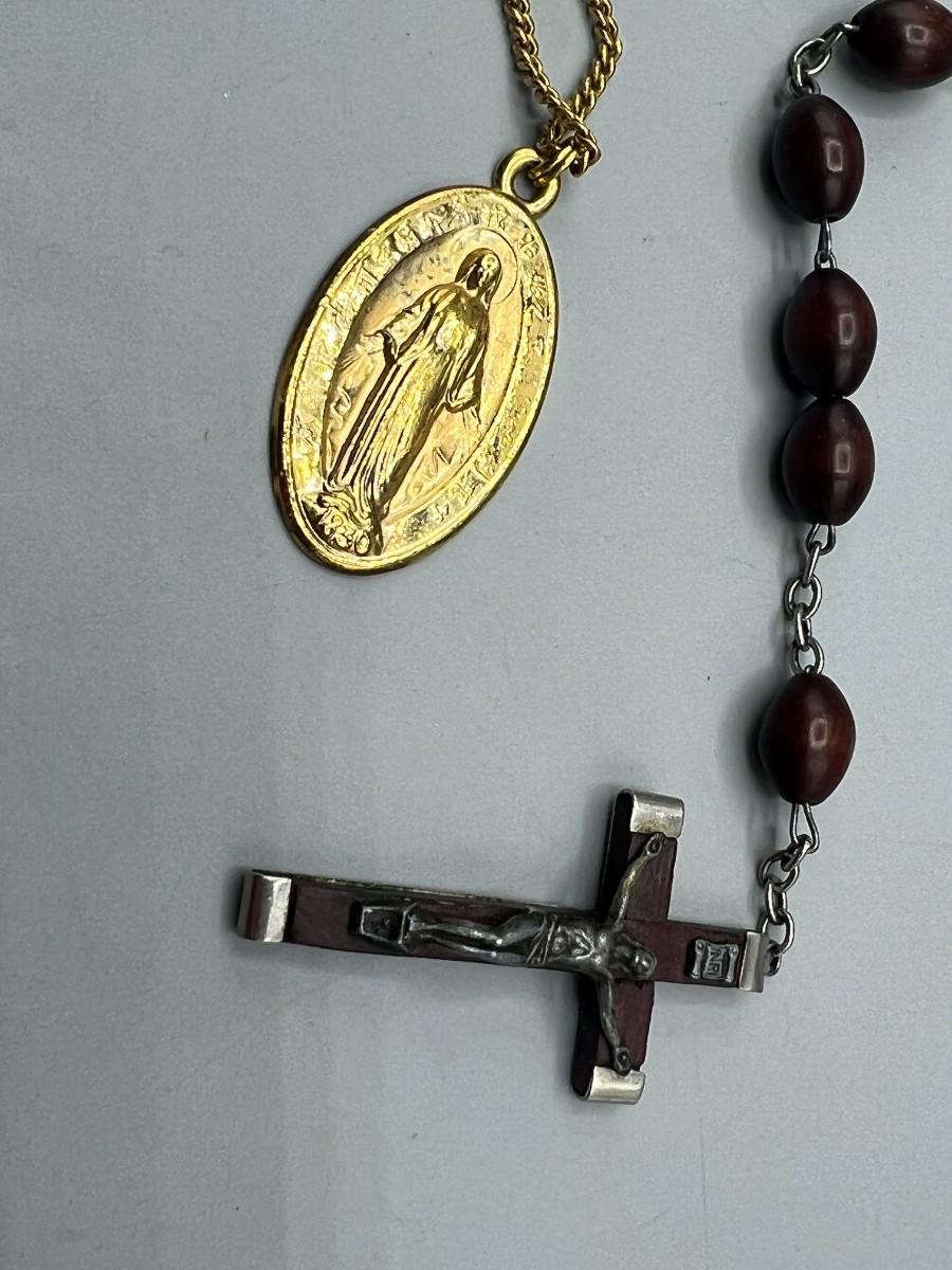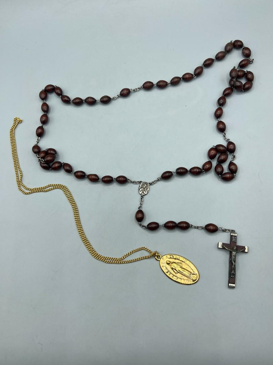 Pair of Religious Necklaces Wooden Metal Praying Rosary & Metal Gold Color Mary Magdalene Charm Pendant