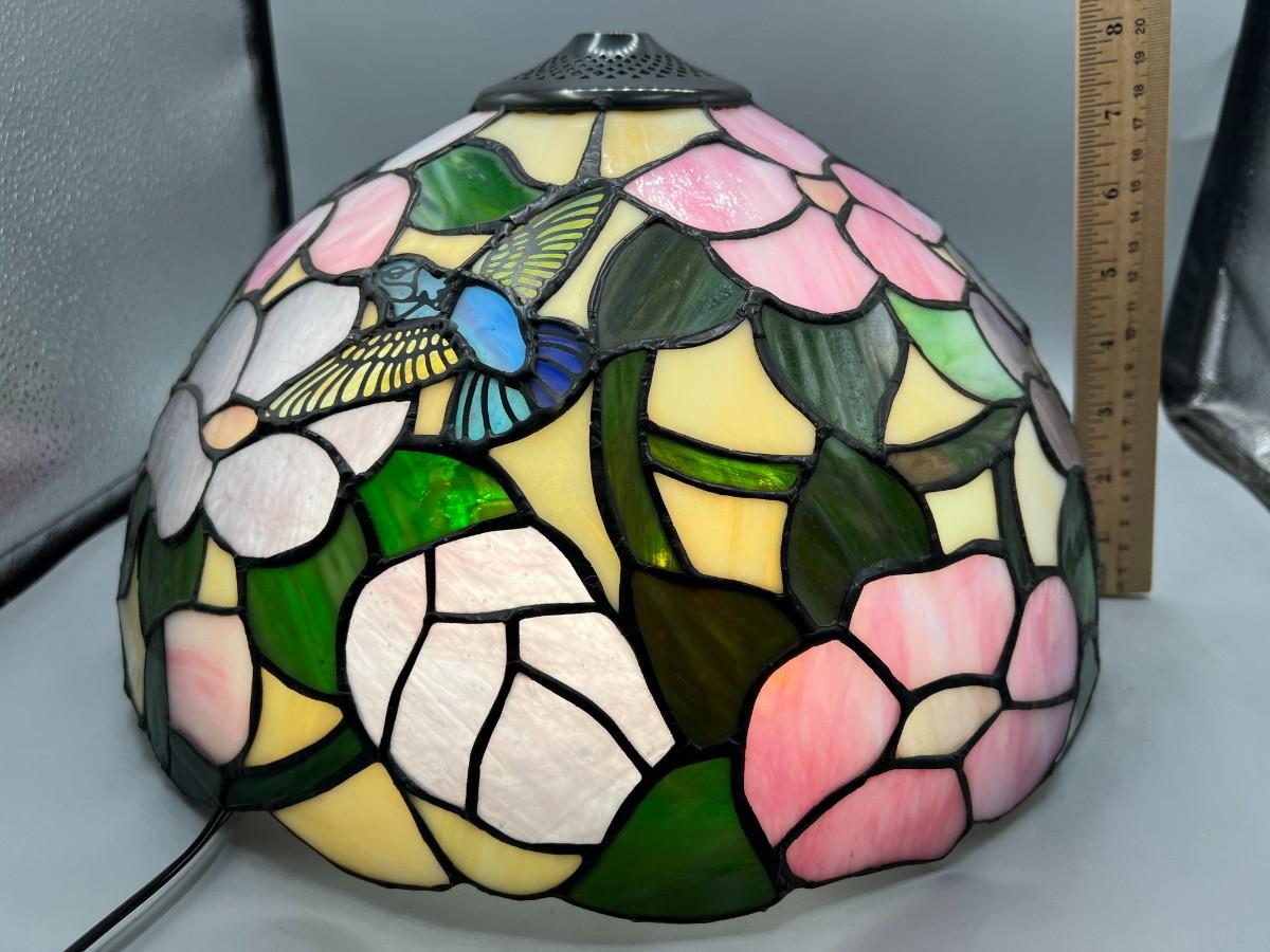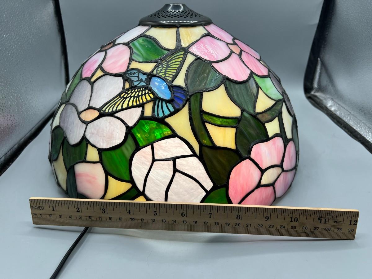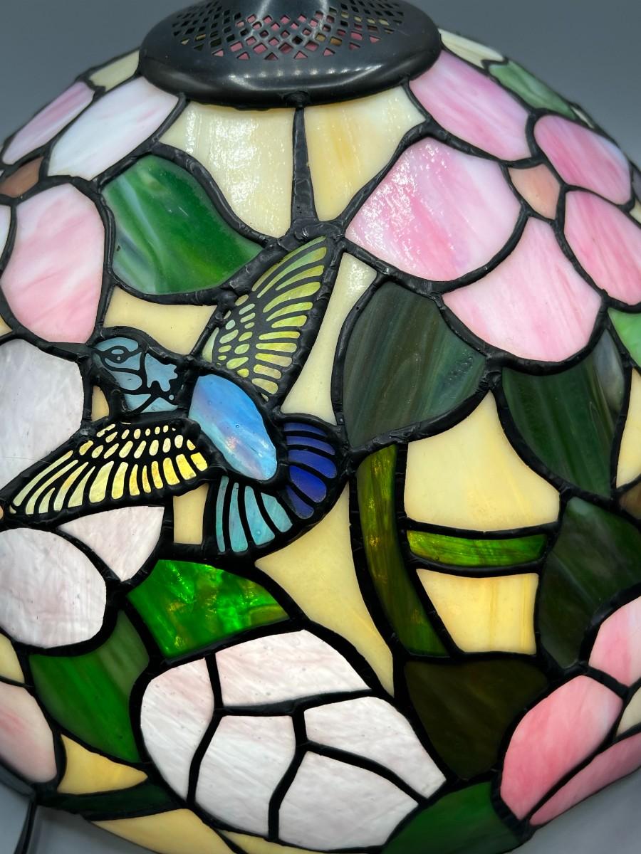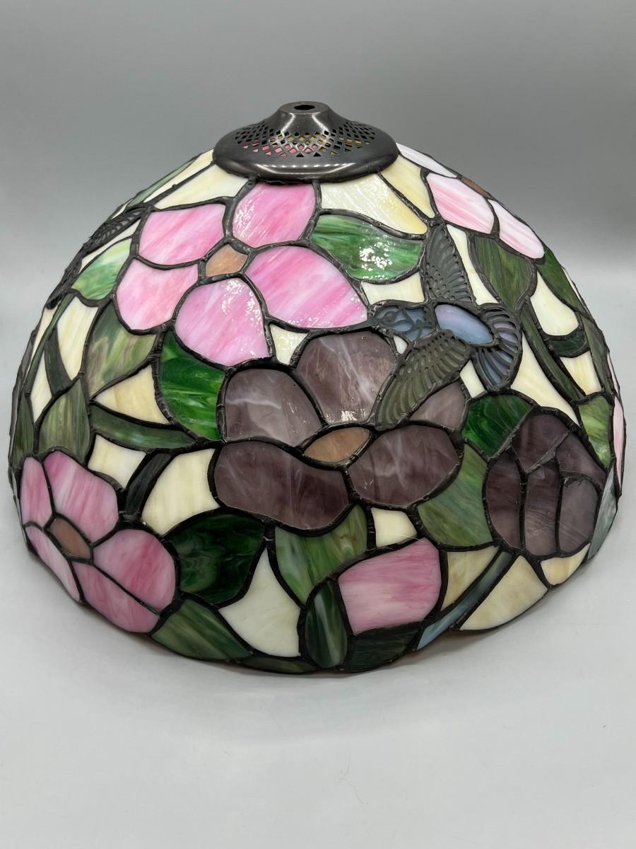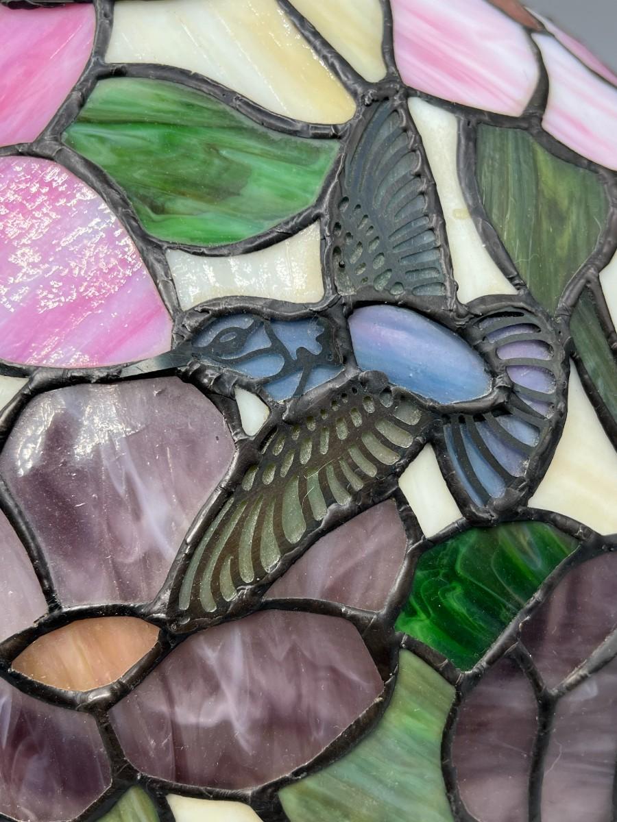 Mid Century Modern Stained Glass Art Hummingbird Pink Flower Motif Lamp Shade